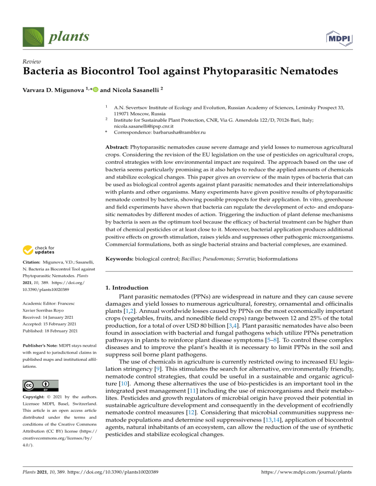 plants Review Bacteria as Biocontrol Tool against Phytoparasitic Nematodes Varvara D. Migunova 1, * and Nicola Sasanelli 2 1 2 * Citation: Migunova, V.D.; Sasanelli, A.N. Severtsov Institute of Ecology and Evolution, Russian Academy of Sciences, Leninsky Prospect 33, 119071 Moscow, Russia Institute for Sustainable Plant Protection, CNR, Via G. Amendola 122/D, 70126 Bari, Italy; nicola.sasanelli@ipsp.cnr.it Correspondence: barbarusha@rambler.ru Abstract: Phytoparasitic nematodes cause severe damage and yield losses to numerous agricultural crops. Considering the revision of the EU legislation on the use of pesticides on agricultural crops, control strategies with low environmental impact are required. The approach based on the use of bacteria seems particularly promising as it also helps to reduce the applied amounts of chemicals and stabilize ecological changes. This paper gives an overview of the main types of bacteria that can be used as biological control agents against plant parasitic nematodes and their interrelationships with plants and other organisms. Many experiments have given positive results of phytoparasitic nematode control by bacteria, showing possible prospects for their application. In vitro, greenhouse and field experiments have shown that bacteria can regulate the development of ecto- and endoparasitic nematodes by different modes of action. Triggering the induction of plant defense mechanisms by bacteria is seen as the optimum tool because the efficacy of bacterial treatment can be higher than that of chemical pesticides or at least close to it. Moreover, bacterial application produces additional positive effects on growth stimulation, raises yields and suppresses other pathogenic microorganisms. Commercial formulations, both as single bacterial strains and bacterial complexes, are examined. Keywords: biological control; Bacillus; Pseudomonas; Serratia; bioformulations N. Bacteria as Biocontrol Tool against Phytoparasitic Nematodes. Plants 2021, 10, 389. https://doi.org/ 10.3390/plants10020389 Academic Editor: Francesc Xavier Sorribas Royo Received: 14 January 2021 Accepted: 15 February 2021 Published: 18 February 2021 Publisher’s Note: MDPI stays neutral with regard to jurisdictional claims in published maps and institutional affiliations. Copyright: © 2021 by the authors. Licensee MDPI, Basel, Switzerland. This article is an open access article distributed under the terms and conditions of the Creative Commons Attribution (CC BY) license (https:// creativecommons.org/licenses/by/ 1. Introduction Plant parasitic nematodes (PPNs) are widespread in nature and they can cause severe damages and yield losses to numerous agricultural, forestry, ornamental and officinalis plants [1,2]. Annual worldwide losses caused by PPNs on the most economically important crops (vegetables, fruits, and nonedible field crops) range between 12 and 25% of the total production, for a total of over USD 80 billion [3,4]. Plant parasitic nematodes have also been found in association with bacterial and fungal pathogens which utilize PPNs penetration pathways in plants to reinforce plant disease symptoms [5–8]. To control these complex diseases and to improve the plant’s health it is necessary to limit PPNs in the soil and suppress soil borne plant pathogens. The use of chemicals in agriculture is currently restricted owing to increased EU legislation stringency [9]. This stimulates the search for alternative, environmentally friendly, nematode control strategies, that could be useful in a sustainable and organic agriculture [10]. Among these alternatives the use of bio-pesticides is an important tool in the integrated pest management [11] including the use of microorganisms and their metabolites. Pesticides and growth regulators of microbial origin have proved their potential in sustainable agriculture development and consequently in the development of ecofriendly nematode control measures [12]. Considering that microbial communities suppress nematode populations and determine soil suppressiveness [13,14], application of biocontrol agents, natural inhabitants of an ecosystem, can allow the reduction of the use of synthetic pesticides and stabilize ecological changes. 4.0/). Plants 2021, 10, 389. https://doi.org/10.3390/plants10020389 https://www.mdpi.com/journal/plants Plants 2021, 10, 389 2 of 16 Plants and bacteria exist in intimate association within agricultural ecosystems. Bacteria may be attached to the root surface or phylloshere, forming symbiotic relationships with plants or existing as free-living organisms in soils [15]. According to Glick, soil bacteria, which facilitate plant growth and are found in association with plant roots and sometimes found on plant leaves or flowers or within plant tissues, are often termed plant growth-promoting bacteria (PGPB). Treating plants with PGPB, it is possible to observe: (i) biomass increase; (ii) nitrogen, phosphorus and iron content increase; (iii) increase in the length of roots and shoots; (iv) enhance seed germination; (v) greater resistance to disease and to various environmental stresses; (vi) increased production of useful secondary metabolites; and (vii) plant nutrition improvement [16]. Species of bacteria belonging to Agrobacterium sp., Arthrobacter sp., Azotobacter sp., Clostridium sp., Desulfovibrio sp., Serratia sp., Burkholderia sp., Azospirillum sp., Bacillus sp., Chromobacterium sp., and Corynebacterium sp. were reported for management of nematodes [17]. The suppression of PPNs by PGPB is achieved through different mechanisms based on the capacity of microbes to compete effectively for ecological niche, colonize plant surface and produce nematicidal and antimicrobial compounds (antibiotics, toxins, siderophores, hydrolytic enzymes, etc.). Bacteria and their metabolites affect both plant and microbial community [18,19]. Direct antagonistic effect can be achieved by parasitism, antibiosis, or competition for nutrients or inf