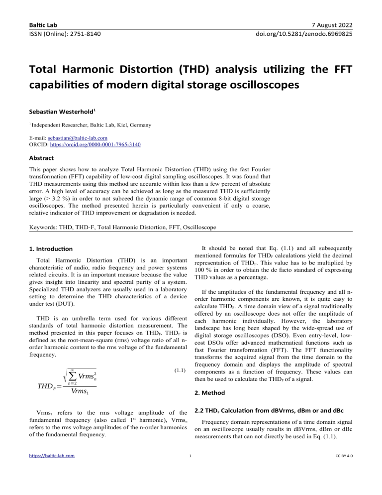 Baltic Lab ISSN (Online): 2751-8140 7 August 2022 doi.org/10.5281/zenodo.6969825 Total Harmonic Distortion (THD) analysis utilizing the FFT capabilities of modern digital storage oscilloscopes Sebastian Westerhold1 1 Independent Researcher, Baltic Lab, Kiel, Germany E-mail: sebastian@baltic-lab.com ORCID: https://orcid.org/0000-0001-7965-3140 Abstract This paper shows how to analyze Total Harmonic Distortion (THD) using the fast Fourier transformation (FFT) capability of low-cost digital sampling oscilloscopes. It was found that THD measurements using this method are accurate within less than a few percent of absolute error. A high level of accuracy can be achieved as long as the measured THD is sufficiently large (> 3.2 %) in order to not subceed the dynamic range of common 8-bit digital storage oscilloscopes. The method presented herein is particularly convenient if only a coarse, relative indicator of THD improvement or degradation is needed. Keywords: THD, THD-F, Total Harmonic Distortion, FFT, Oscilloscope 1. Introduction It should be noted that Eq. (1.1) and all subsequently mentioned formulas for THDF calculations yield the decimal representation of THDF. This value has to be multiplied by 100 % in order to obtain the de facto standard of expressing THD values as a percentage. Total Harmonic Distortion (THD) is an important characteristic of audio, radio frequency and power systems related circuits. It is an important measure because the value gives insight into linearity and spectral purity of a system. Specialized THD analyzers are usually used in a laboratory setting to determine the THD characteristics of a device under test (DUT). If the amplitudes of the fundamental frequency and all norder harmonic components are known, it is quite easy to calculate THDF. A time domain view of a signal traditionally offered by an oscilloscope does not offer the amplitude of each harmonic individually. However, the laboratory landscape has long been shaped by the wide-spread use of digital storage oscilloscopes (DSO). Even entry-level, lowcost DSOs offer advanced mathematical functions such as fast Fourier transformation (FFT). The FFT functionality transforms the acquired signal from the time domain to the frequency domain and displays the amplitude of spectral components as a function of frequency. These values can then be used to calculate the THDF of a signal. THD is an umbrella term used for various different standards of total harmonic distortion measurement. The method presented in this paper focuses on THDF. THDF is defined as the root-mean-square (rms) voltage ratio of all norder harmonic content to the rms voltage of the fundamental frequency. THD F= √ ∞ ∑ Vrms2n (1.1) n=2 Vrms1 2. Method 2.2 THDF Calculation from dBVrms, dBm or and dBc Vrms1 refers to the rms voltage amplitude of the fundamental frequency (also called 1st harmonic), Vrmsn refers to the rms voltage amplitudes of the n-order harmonics of the fundamental frequency. https://baltic-lab.com Frequency domain representations of a time domain signal on an oscilloscope usually results in dBVrms, dBm or dBc measurements that can not directly be used in Eq. (1.1). 1 CC BY 4.0 Baltic Lab ISSN (Online): 2751-8140 7 August 2022 doi.org/10.5281/zenodo.6969825 2.2.1 THDF from dBVrms Where Pn is the power of the n-order harmonic in dBm, P1 is the power of the fundamental frequency in dBm. Eq. (2.5) is the simplified version of equation 2.4 for a system impedance of 50 Ohms. Measurements in dBVrms can be converted into rootmean-square voltage (Vrms), quite easily: V rms =10(dBVrms/ 20) (2.1) 2.2.3 THDF from dBc Some oscilloscopes are also capable of displaying and automatically tracking spectral power in a unit called decibels relative to the carrier (dBc). The fundamental frequency is used as a reference for the 0 dBc point and all subsequent power readings are displayed relative to this reference point. Substituting each Vrmsn term in Eq. (1.1) yields the following equation: THD F= √ ∞ (2.2) ∑ (10(dBVrms /20 ))2 n n=2 10(dBVrms /20) 1 dBc=10 log( Where dBVrms1 is the amplitude of the fundamental frequency (= 1st harmonic) in dBVrms and dBVrmsn is the amplitude of all subsequent n-order harmonics in dBVrms. For values given in dBm, the rms voltage can be calculated as follows: √ Z (P )⋅10 1000 dBm (2.3) / 20) Vrms2n Pn Vrms2n R = = P c Vrms21 Vrms21 R Where Z is the system impedance and P dBm is the power of the harmonic in dBm and V rms is the rms Voltage. For a typical system impedance of 50 Ohms, the square root term is approximately 0.2236. √ √ ∞ THD F= THD F= Z (P /20) )∗10 ) ∑ ( ( 1000 This property is useful as it simplifies the calculations for THDF values from dBc values. This is true because the defining equation for THDF calculations (Eq. 1.1) can expanded as follows: (2.4) n n=2 √ √ ( Z )∗10(P /20) 1000 √ 1 ∞ ∑ ( 0.2236∗10(P /20 ))2 n Vrms 22 Vrms23 Vrms24 Vrms 25 THD F= + + + ... Vrms 21 Vrms21 Vrms 21 Vrms 21 (2.5) https://baltic-lab.com (2.8) Combining the expanded form of Eq. (2.8) with the power to square rms voltage ratio relationship shown in Eq. (2.7), results in a very compact equation for calculating THD F values directly from dBc power measurements: n=2 0.2236∗10 (2.7) Where Vrmsn is the rms voltage of the n-order harmonic and Vrmsc the rms voltage amplitude of the reference carrier or, again, in this use case the rms voltage amplitude of the fundamental frequency. Combining Eq. (1.1) with Eq. (2.3), yields the following equations to calculate THDF from the spectral power of norder harmonics in dBm directly: 2 (2.6) Where Pn is the power of the n-order harmonic in dBm, P1 is the power of the reference carrier, in this use case the power of the fundamental frequency. The fact that Power is defined as rms Voltage squared and the system impedance will be equal for both Pn and P1, the Pn to P1 power ratio is equal to the ratio of the squared rms voltage amplitudes of the 