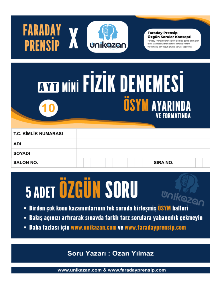 FARADAY PRENSİP X A Y T MİNİ Faraday Prensip Özgün Sorular Konsepti Faraday Prensip olarak sizlere sınavda gelebilecek olan farklı tarzda sorulara hazırlıklı olmanız ve fark yaratmanız için özgün orijinal sorular yazıyoruz. FİZİK DENEMESİ ÖSYM AYARINDA VE FORMATINDA 10 T.C. KİMLİK NUMARASI ADI SOYADI SALON NO. SIRA NO. 5 ADET ÖZGÜN SORU Birden çok konu kazanımlarının tek soruda birleşmiş ÖSYM halleri Bakış açınızı artırarak sınavda farklı tarz sorulara yabancılık çekmeyin Daha fazlası için www.unikazan.com ve www.faradayprensip.com Soru Yazarı : Ozan Yılmaz www.un�kazan.com & www.faradayprens�p.com KATILMAK İÇİN -> MİNİ FİZİK DENEMESİ 2025 - FZK10 AYT 1. Bu sorular FARADAY PRENSİP tarafından yazılmış ve d�zg�lenm�şt�r. 2. Faraday Prem�um hakkında daha fazla b�lg� almak �ç�n www.faradayprens�p.com 3. Ün�kazan hakkında daha fazla b�lg� almak �ç�n www.un�kazan.com 1. Hava sürtünmes�n�n olduğu b�r ortamda, m kütlel� noktasal b�r c�sm�n V �lk hızıyla q açısı yapacak şek�lde eğ�k atışı I yörünges�n� �zlerken bu c�sm�n aynı koşullarda hava sürtünmes�n�n olmadığı durumda II yörünges�n� �zleyeceğ� b�l�n�yor. m V Evde kullanılan b�r telefon şarj c�hazı, şeh�r şebekes�nden aldığı AC 220 V ger�l�m� düşürerek telefonun �ht�yacı olan 5 V DC ger�l�me dönüştürür. Bu �şlemler�n şeması aşağıda ver�lm�şt�r. şebeke II I q 2. FARADAY AC 220V FARADAY yatay PRENSIP PRENSIP Buna göre, c�sm�n havada kalma süres�n� etk�leyen n�cel�kler, I. Buna göre, telefonun sarj ed�leb�lmes� �ç�n sarj alet�n�n �çer�s�nde bulunan �deal olmayan transformatör �ç�n, III. yerçek�m� �vmes�n�n büyüklüğü, yargılarından hang�ler�d�r? A) Yalnız II D) I ve II B) Yalnız III pr�z sarj kablosu m kütle değer�, II. q açısının değer�, sarj c�hazı 5V DC C) II ve III E) I, II ve III I. Çalıştığı sürece, pr�zden çek�len elektr�k enerj�s�n�n b�r bölümü ısı olarak kaybed�l�r. II. AC ger�l�m�n� DC ger�l�m�ne dönüştürür. III. Sekonder sargının sarım sayısı, pr�mer sargının sarım sayısından daha azdır. yargılarından hang�ler� doğrudur? A) Yalnız I B) Yalnız III D) I ve II FARADAY PRENSIP www.faradayprens�p.com C) I ve III E) I, II ve III 2025 - FZK10 3. AYT Aşağıdak� sayfa düzlem�ndek� yüklü �k� paralel levhaya K ve L noktalarını merkez olarak alan sırasıyla r, 2r, 3r ve 4r yarıçap uzunluklu çembersel ç�zg�ler şek�ldek� g�b� düzleme yerleşt�r�l�yor. Ardından M noktasına poz�t�f yüklü b�r noktasal c�s�m yerleşt�r�p serbest bırakılıyor. FARADAY PRENSIP + + K + + 4 M 2 L 3 B�r atomun enerj� düzeyler� arasında gerçekleşen elektron geç�şler�nden yayılan fotonlarla �lg�l� olarak, FARADAY I. II. Elektron çek�rdeğe yakın enerj� sev�yes�ne �nd�ğ�nde foton yayılır. �fadeler�nden hang�ler� her zaman doğrudur? - A) Yalnız I - A) 1 yönünde sab�t hızlı hareket eder. B) 3 yönünde sab�t hızlı hareket eder. C) 4 yönünde �vmel� hareket eder. D) 2 yönünde �vmel� hareket eder. E) C�s�m hareket etmeden bulunduğu konumda sab�t kalır. FARADAY B) Yalnız II D) II ve III - Buna göre, noktasal c�sm�n hareket�yle �lg�l� aşağıdak�lerden hang�s� doğru olab�l�r? (Düzeneğ� etk�leyen herhang� b�r dış manyet�k veya elektr�ksel etk� yoktur.) PRENSIP PRENSIP Enerj�s� büyük olan fotonun dalga boyu küçüktür. III. Atomda soğurulan foton, atomu temel enerj� düzey�ne �nd�r�r. - 1 4. www.faradayprens�p.com C) I ve II E) I, II ve III 2025 - FZK10 5. AYT H�drojen atomunda elektronun yaptığı geç�şlerle �lg�l� aşağıdak�lerden hang�s� yanlıştır? A) Üst enerj� düzey�nden alt enerj� düzey�ne geçerken foton yayılır. FARADAY PRENSIP B) B�r üst enerj� sev�yes�ne geçen elektron enerj� alır. C) Elektronun enerj�s� yalnızca bell� değerler� alab�l�r. D) Elektron temel enerj� düzey�nde en yüksek enerj�ye sah�pt�r. E) Fotonun enerj�s�, elektronun �k� enerj� sev�yes� arasındak� enerj� farkına eş�tt�r. FARADAY PRENSIP www.faradayprens�p.com 2025 - FZK10 AYT FARADAY PRENSİP X ÜNİKAZAN AYT MİNİ FİZİK DENEMESİ 10 CEVAP ANAHTARI 1. E 2. C 3. D 4. C 5. D Bu denemen�n �çer�s�ndek� soruların veya k�tapçığın paylaşılması/yayınlanması Faraday Prens�p f�l�granları engellenmeyecek şek�lde serbestt�r. D�ğer �çer�kler�m�z �ç�n www.faradayprens�p.com webs�tem�z� z�yaret edeb�l�rs�n�z. FARADAY PRENSIP www.faradayprens�p.com KATILMAK İÇİN ->