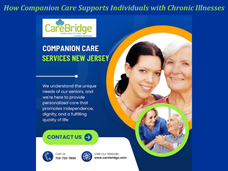 How Companion Care Supports Individuals with Chronic Illnesses Chronic Illnesses are challenging. They demand time, patience, and consistent care. For seniors or individuals living with these conditions, managing daily life can feel overwhelming. This is where Companion Care Services in New Jersey play a vital role. How Does Companion Care Help? Companions are more than caregivers. They’re a lifeline. 1. Daily Assistance Managing a chronic illness often means juggling medications, doctor’s appointments, and dietary restrictions. A Companion helps with reminders, transportation, and even meal preparation. Example: Imagine a senior with diabetes. Their caregiver ensures they eat balanced meals and don’t miss their insulin doses. 2. Emotional Support Living with a chronic condition can feel isolating. Companions provide conversation, encouragement, and a listening ear. Example: Someone with arthritis may struggle with mobility, leading to frustration. A Companion offers reassurance and practical solutions. 3. Promoting Activity Physical activity is often crucial for managing chronic illnesses. Companions encourage safe exercises, whether it’s a short walk or simple stretching routines. Example: A senior with early-stage Parkinson’s might benefit from gentle yoga. A Companion ensures they’re active yet safe. Why Is Companion Care Essential for Chronic Illnesses? Chronic conditions don’t take a day off. They require consistent management. Companion Care bridges the gap between medical treatments and everyday living. While doctors provide medical solutions, companions address the emotional and practical aspects of care. This support improves overall wellbeing. A calm, organized environment can reduce stress, which often worsens chronic conditions. Who Benefits from Companion Care? Companion Care isn’t limited to one type of individual. It supports: Seniors with limited mobility Individuals recovering from surgeries People managing long-term conditions like COPD or diabetes Family caregivers needing respite The Unique Approach of Companion Care Services in New Jersey In New Jersey, Companion Care Services are tailored to meet individual needs. Companies like CareBridge Home Health Care focus on creating personalized care plans. Their trained caregivers are familiar with the unique challenges of chronic illnesses. Whether it’s assisting with everyday tasks or simply being a comforting presence, they ensure clients feel cared for and respected. How to Choose the Right Companion Care Service Finding the right provider is critical. Here’s what to consider: Experience • Choose a provider with expertise in companion care for chronic illnesses. • Flexibility Look for services that adapt to your loved one’s changing needs. • Compassionate Caregivers The best caregivers aren’t just skilled—they genuinely care. Take the First Step Managing a chronic illness doesn’t have to be isolating or overwhelming. Companion Care provides the support, structure, and encouragement needed for a better quality of life. If you or a loved one could benefit from compassionate, professional care, reach out to CareBridge Home Health Care. Their dedicated team offers tailored services to meet the unique needs of New Jersey residents. Start your journey toward better care today. To Read Our Published Blog: https://carebridgecare.livepositively.com/how-companion-care-helps-navigate-lifewith-chronic-conditions/ Thank You! Contact us: 732-722-7800 CareBridge Home Health Care 701 Brooklyn Blvd, Suite 2 North Corner of Route 71 & Brooklyn Blvd, Sea Girt, NJ 08750 Office: 732.722.7800 · Fax: 732.722.7799 Office Hours: 9am-5pm (Monday - Friday) 24 Hour Emergency Number: 732-722-7800 Email: info@carebridgehomecare.com Website: https://carebridge.care/contact-us