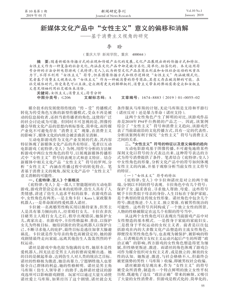 Vol.10 No.1 January 2019 第 10 卷第 1 期 2019 年 01 月 新媒体文化产品中“女性主义”意义的偏移和消解 ——基于消费主义视角的研究 李 晗 (重庆大学 新闻学院,重庆 400044) 摘 要:随着新媒体传播方式的出现和传媒产业化的发展,文化产品展现出新的传播方式和特征。 女性主义作为一种复杂的社会文化,内涵在文化产品中却是被污名化、简单化、标签化的。本文运用符 号分析的方法分析电影游戏《底特律:变人》,认为新型文化产品在商业利益和女性社会运动的双重压 力下,不得不利用“女性主义”符号,但其图像传播方式和程序逻辑使“女性主义”内涵被模式化。 笔者基于消费主义视角认为“女性主义”作为一种被消费的符号商品,其意义存在被消解的可能。在 社交媒体时代,传受角色可以互换,受众拥有更大的解释权利,消费主义带来的弊端需要受众和女权主 义意见领袖利用社交媒体来消除。 关键词:女性主义;消费主义;符号分析 中图分类号:G206 文献标志码:A 文章编号:1674-8883(2019)01-0055-02 媒介技术的发展使得传统的“传 - 受”传播模式 条件服从马库斯的计划,无论马库斯是支持和平游行 转化为传受角色互换的新型传播模式,受众不再是被 (诺丝反对)还是暴力革命(诺丝支持)。 这两个女性角色产生了鲜明的对比,该游戏作品 动的信息接收者,还担当着传播者的角色,这使得广泛 的社会讨论成为可能。但同时不可忽视的是,图像传 亦是2018年 PS4平台热销的产品之一。因此,该案例 播会导致文化产品的思想内核标签化、简单化,而传媒 综合了“女性主义”符号和消费主义趋向,该游戏代 产业化不可避免存在“消费主义”现象,在消费主义 表了当前最前沿的文化传播方式,具有一定的代表性, 分析该案例有利于探究“女性主义”符号与消费主义 的影响下,媒体文化的内核会被歪曲甚至消解。 互动电影游戏作为文化产业发展的代表,其内容 之间的关系。 二、 “女性主义”符号的特征以及意义偏移的趋向 特征体现了新媒体文化产品的共有特征。笔者以互动 互动电影游戏基于图像传播,不可避免地将某些 电影游戏《底特律:变人》为例,用符号分析的方法解 析游戏中两位女性角色的符号,以展现新媒体传播形 深刻文化以符号的方式表达出来,这种符号表达的方 式中“女性主义”符号的表现方式和意义特征。结合 式为符号消费提供了条件。笔者结合《底特律:变人》 新媒体中相关文化产品“女性主义”符号的罗列,分 中女性角色的形象,分析文化产品中的符号如何体现 析“女性主义”内涵在传播过程中的转化特点。笔 女性主义的内涵,并基于观察分析当前女性主义符号 者基于消费主义的视角,探究文化产品中“女性主义” 的特征。 (一)“女性主义”符号的特征 意义消解的可能性。 《底特律:变人》中卡拉和诺丝是对立的两个极 一、《底特律:变人》个案概况 《底特律:变人》是一部人工智能题材的互动电影 端,分别以不同的符号表现。卡拉角色中有几个符号: 游戏,游戏背景设定在未来的底特律,仿生人具有了人 保护子女、温柔善良、寻求他人帮助、母爱。这些符号 类情感,讲述了仿生人追求平权的故事。在游戏作品 赋予卡拉类似于母亲的身份,人生目标在于保护家庭, 中,女性角色有两类:一是主角卡拉(Kara),家政服务 是个典型的贤良传统女性形象。诺丝角色中包含几个 符号:激进叛逆、个人主义、独立要强、有被男性统治的 机器人;一是革命派的性爱机器人诺丝。 卡拉被一名离婚男性购买用以操持家务,但男主 可能性。这些符号共同构成了一个独立女性的图景, 人是具有暴力倾向的人,经常殴打女儿。卡拉在多次 人物的性格被限定在这几个有限的符号当中。 从这两个女性角色可以表现出当前游戏产品中对 目睹男主人殴打女儿之后,程序出现错误,她保护女 儿,离家出走。在游戏中,卡拉性格温和、善良,以保护 女性塑造的基本模式。一是投身于家庭的家庭妇女, 女儿为终极目标。她结识强壮的货运机器人以保护自 二是投身于平权运动的女权主义者。前者是以往包 己,不断寻求他人的庇护,最终目标是逃往加拿大躲避 括游戏在内的大多数文化产品塑造的主流女性角色, 祸乱。卡拉就是作为母亲的角色而被设定的,她的游 即便没有男性角色参与,也表现为被保护、被影响的特 戏剧情最终走向家庭,远离其他仿生人轰轰烈烈的平 点。后者则是西方女权主义运动兴起后产生的所谓“政 治正确”的影响,西方游戏的女性角色塑造得更为细 权运动。 诺丝是游戏中角色较为饱满的女性,她原本是性 腻,但性格更叛逆、激进。而诺丝的角色体现了游戏公 爱机器人,因无法忍受男主人的折磨而觉醒出逃。她 司作为媒介组织对女权主义者,或是独立的、解放的女 的目的是掀起革命,达到仿生人对人类的统治之目标。 性的认知。她叛逆、激进,与社会格格不入,但最终会 诺丝的性格极为激进,她崇尚暴力,宁愿牺牲他人也要 被更强势的男性(马库斯)收编,即被男权社会收编。 诺丝被游戏呈现出来,作为“女性主义”的符号 保全自己群体的利益,她的性格鲜明。诺丝是男主角 马库斯(仿生人领导者)的助手,选择诺丝建议的游 被受众所消费,制造出一个特点鲜明的独立女性平权 戏选项可以影响游戏剧情。玩家可以通过大量互动使 历程,既避免了违反“政治正确