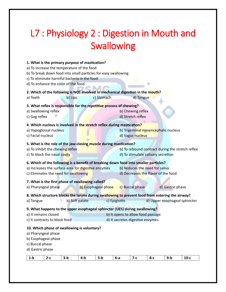 L7 : Physiology 2 : Digestion in Mouth and Swallowing 1. What is the primary purpose of mastication? a) To increase the temperature of the food b) To break down food into small particles for easy swallowing c) To eliminate harmful bacteria in the food d) To enhance the color of the food 2. Which of the following is NOT involved in mechanical digestion in the mouth? a) Teeth b) Lips c) Stomach d) Tongue 3. What reflex is responsible for the repetitive process of chewing? a) Swallowing reflex b) Chewing reflex c) Gag reflex d) Stretch reflex 4. Which nucleus is involved in the stretch reflex during mastication? a) Hypoglossal nucleus b) Trigeminal mesencephalic nucleus c) Facial nucleus d) Vagus nucleus 5. What is the role of the jaw-closing muscle during mastication? a) To inhibit the chewing reflex b) To rebound contract during the stretch reflex c) To block the nasal cavity d) To stimulate salivary secretion 6. Which of the following is a benefit of breaking down food into smaller particles? a) Increases the surface area for digestive enzymes b) Reduces the need for saliva c) Eliminates the need for swallowing d) Decreases the flavor of the food 7. What is the first phase of swallowing called? a) Pharyngeal phase b) Esophageal phase c) Buccal phase d) Gastric phase 8. Which structure blocks the larynx during swallowing to prevent food from entering the airway? a) Tongue b) Soft palate c) Epiglottis d) Upper esophageal sphincter 9. What happens to the upper esophageal sphincter (UES) during swallowing? a) It remains closed b) It opens to allow food passage c) It contracts to block food d) It secretes digestive enzymes 10. Which phase of swallowing is voluntary? a) Pharyngeal phase b) Esophageal phase c) Buccal phase d) Gastric phase 1-b 2-c 3-b 4-b 5-b 6-a 7-c 8-c 9-b 10-c 11. What is the primary characteristic of the buccal phase of swallowing? a) It is an involuntary stage b) It involves the closure of the nasal cavity c) It is a voluntary stage where the tongue pushes food into the pharynx d) It takes 8-10 seconds 12. Which of the following nerves are involved in the afferent pathway of the swallowing reflex? a) 5th, 9th, and 10th nerves b) 7th and 12th nerves c) 8th and 11th nerves d) 6th and 9th nerves 13. What is the role of the soft palate during the pharyngeal phase of swallowing? a) To block the oral cavity b) To pull upward and close the posterior nasal cavity c) To push food into the esophagus d) To relax the upper esophageal sphincter 14. What happens to the vocal cords during the pharyngeal phase of swallowing? a) They remain open b) They are approximated strongly c) They move downward d) They secrete mucus 15. What is the function of the epiglottis during swallowing? a) To push food into the esophagus b) To block the larynx and prevent food from entering the trachea c) To stimulate salivary secretion d) To relax the lower esophageal sphincter 16. What is the effect of the upward movement of the larynx during swallowing? a) It causes the vocal cords to open b) It relaxes the upper esophageal sphincter (UES) c) It blocks the nasal cavity d) It inhibits the swallowing reflex 17. What is "swallowing apnea"? a) A condition where swallowing is delayed b) A temporary stoppage of respiration during swallowing c) A reflex that opens the lower esophageal sphincter d) A phase where food is pushed into the stomach 18. Which phase of swallowing involves primary and secondary esophageal peristalsis? a) Buccal phase b) Pharyngeal phase c) Esophageal phase d) Gastric phase 19. How long does the esophageal phase of swallowing typically take in a standing position? a) 8-10 seconds b) 5-8 seconds c) 1-2 seconds d) 10-12 seconds 20. What is the significance of the approximation of the vocal cords during swallowing? a) It enhances the sense of taste b) It prevents suffocation by blocking the trachea c) It stimulates salivary secretion d) It relaxes the upper esophageal sphincter 11-c 12-a 13-b 14-b 15-b 16-b 17-b 18-c 19-b 20-b 21. What initiates primary esophageal peristalsis? a) Relaxation of the lower esophageal sphincter b) Stimulation of the enteric nervous system c) Continuation of contraction of the superior constrictor muscles of the pharynx d) Presence of food in the esophagus 22. What happens to primary peristalsis after vagotomy? a) It becomes secondary peristalsis b) It is abolished c) It remains unaffected d) It is enhanced 23. What triggers secondary esophageal peristalsis? a) Relaxation of the upper esophageal sphincter b) Failure of primary peristalsis to remove all food from the esophagus c) Contraction of the lower esophageal sphincter d) Stimulation of the vagal nerve fibers 24. Which part of the esophagus consists of striated muscles? a) Entire esophagus b) Lower 1/3 c) Upper 1/3 d) Middle 1/3 25. What is the function of the mucous glands in the esophagus? a) To relax the lower esophageal sphincter b) To stimulate peristalsis c) To secrete mucus only d) To secrete digestive enzymes 26. Which of the following factors decreases the tone of the lower esophageal sphincter (LES)? a) Large doses of gastrin b) Hiatus hernia c) Positive intra-abdominal pressure d) Fat, tea, coffee, and chocolate 27. What is the effect of large doses of gastrin on the lower esophageal sphincter (LES)? a) It decreases the tone of the LES b) It increases the tone of the LES c) It triggers secondary peristalsis d) It has no effect on the LES 28. What is the role of the upper esophageal sphincter (UES)? a) To initiate primary peristalsis b) To prevent reflux of gastric acid into the esophagus c) To guard the upper end of the esophagus d) To secrete mucus 29. What happens to the tone of the lower esophageal sphincter (LES) in hiatus hernia? a) It triggers secondary peristalsis b) It decreases due to negative intrathoracic pressure c) It increases due to positive intra-abdominal pressure d) It remains unaffected 30. Which of the following is NOT a factor that decreases the tone of the lower esophageal sphi
