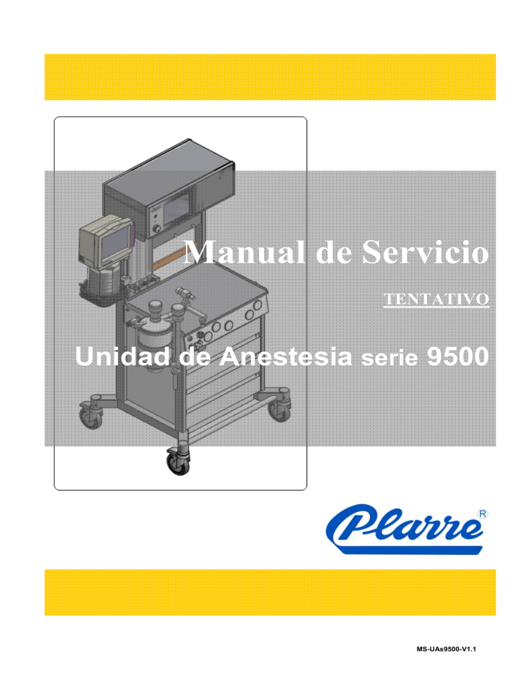 Manual de Servicio TENTATIVO Unidad de Anestesia serie 9500 MS-UAs9500-V1.1 - Contenido - Contenido Convenciones Utilizadas en este Manual e Instrumentos Advertencias, Precauciones y Notas Explicación de símbolos y abreviaturas en este manual y unidades VII VII VIII Sección 1. General 1.1 Introducción Descripción de paneles Unidad de Anestesia serie 9500 Vista frontal – Vista posterior Paneles de la caja de distribución de gases Ventilador de Anestesia Vista frontal Circuito de absorción de CO2 Fuelle del ventilador Válvula conmutadora Monitor de Signos Vitales Vista frontal Vista lateral izquierda Vista lateral derecha Unidad Multigas Vista frontal Vaporizadores Vista frontal Procesador BIS Almacenaje y Transportación Información general de seguridad Unidad de Anestesia Unidad de anestesia Ventilador de Anestesia Monitor de Signos Vitales Opcionales Unidad Multigas Procesador BIS 1.2 1.3 1.3 1.3 1.4 1.4 1.4 1.5 1.5 1.5 1.6 1.6 1.7 1.8 1.9 1.9 1.9 1.9 1.9 1.10 1.11 1.11 1.11 1.11 1.15 1.16 1.16 1.16 Sección 2. 2.1 Datos Técnicos Especificaciones de la Unidad de Anestesia Unidad de anestesia Tabla de asignación para identificar el modelo de la unidad de anestesia serie 9500 Sistemas de control Manual de Servicio – Unidad de Anestesia serie 9500 2.2 2.2 2.3 2.4 I - Contenido - Sistemas de respaldo y reducción de riesgos Sistemas de seguridad Válvula de regulación de flujo para ventilador Especificaciones generales Ventilador de Anestesia Datos del rendimiento Valores por Defecto del Control de Volumen durante la Puesta en Marcha Valores por Defecto de la Ventilación de Control de Presión durante la Puesta en Marcha Valores por Defecto de la Presión de Soporte durante la Puesta en Marcha Características Fijas Características según el Modo Identificación del modelo del Ventilador de anestesia Especificaciones del Monitor de Signos Vitales Pantalla Sonido Alarma ECG Respiración SpO2 PANI Temperatura Amplificador multiparamétrico PAI Respiración (método termistor) CO2 Tendencia Módulo de registro (opcional) Requerimientos de energía Medio ambiente Dimensiones y peso Compatibilidad electromagnética Estándar de seguridad Valores predeterminados Ventana ECG, RESP, SpO2, PANI Ventana PRESIÓN, CO2, TREND (tendencias) Ventana LIST, ARRHYTH RECALL, VITAL ALARM Ventana ARRHYT ALARM, RECORDING, DATE & TIME, SOUND, DISPLAY Ventana FUNCTION KEY, INTERBED Especificaciones de Opcionales Unidad Multigas Gases medibles Procesador BIS Sección 3. Resolución de Problemas Unidad de Anestesia Manual de Servicio – Unidad de Anestesia serie 9500 2.4 2.5 2.5 2.6 2.8 2.8 2.8 2.9 2.9 2.9 2.9 2.10 2.11 2.11 2.11 2.11 2.12 2.13 2.13 2.13 2.14 2.14 2.14 2.15 2.15 2.16 2.16 2.16 2.16 2.17 2.17 2.17 2.18 2.18 2.19 2.20 2.21 2.22 2.23 2.23 2.3 2.24 3.1 3.2 II - Contenido - Unidad de anestesia Ventilador de anestesia Monitor de signos vitales Mensajes Problemas Registro (opcional) Mensajes Problemas Monitoreo de ECG Mensajes Problemas Monitoreo de respiración Mensajes Problemas con el método de impedancia Problemas con el método de termistor Monitoreo de la SpO2 Mensajes Problemas Monitoreo de la PANI Mensajes Problemas Monitoreo de la PAI Mensajes Problemas Monitoreo de la Temperatura Mensajes Problemas Unidades Opcionales Unidad Multigas Mensajes y otros problemas Procesador BIS Alarmas Mensajes Otros problemas Sección 4. Descripción de tarjetas de la UA-9500 Descripción de tarjetas UPS Control Descripción UPS IG Descripción UPS IS Descripción UPS LEDs Manual de Servicio – Unidad de Anestesia serie 9500 3.2 3.4 3.5 3.5 3.6 3.7 3.7 3.7 3.8 3.8 3.9 3.10 3.10 3.10 3.10 3.11 3.11 3.12 3.13 3.13 3.14 3.15 3.15 3.15 3.16 3.16 3.16 3.17 3.17 3.17 3.18 3.18 3.18 3.18 4.1 4.2 4.2 4.3 4.3 4.3 4.4 4.4 4.4 III - Contenido - Descripción UPS LAMP Descripción Iluminación del flujómetro Descripción Descripción del diagrama esquemático Sección 5. Desmontaje Desarmado del monitor de signos vitales Removiendo los bloques del chasis Reemplazo de la tarjeta principal Reemplazo de la tarjeta analógica Reemplazo de la tarjeta de PANI Reemplazo de la tarjeta de la PAI Reemplazo de la tarjeta inversora Reemplazo de la unidad LCD Reemplazo de la batería de litio Reemplazo de la unidad de lámpara posterior Reemplazo de la batería Desarmado de la Unidad Multigas Removiendo el panel posterior Removiendo la tapa frontal Removiendo la unidad de sensando de gas Reemplazo del receptáculo para la trampa de agua Removiendo la tarjeta madre, la tarjeta DPU y la tarjeta Bridge Removiendo la tarjeta JA I/F Removiendo la unidad de alimentación Sección 6. Mantenimiento Principios de funcionamiento Banco de flujómetros Válvula de regulación fina Flujómetros Reguladores de presión Reguladores de alta presión Reguladores miniatura Válvula check (de revisión) Válvula de oxígeno directo Sistema de alarma para falla de suministro de O2 Válvula de alarma acústica Válvula de cierre Válvula proporcional flowlock Mantenimiento preventivo Unidad de Anestesia 9500 Manual de Servicio – Unidad de Anestesia serie 9500 4.5 4.5 4.5 4.6 4.6 4.7 5.1 5.2 5.2 5.6 5.9 5.10 5.11 5.12 5.13 5.14 5.15 5.17 5.20 5.20 5.21 5.22 5.24 5.25 5.26 5.27 6.1 6.2 6.2 6.2 6.2 6.3 6.3 6.3 6.4 6.4 6.5 6.5 6.6 6.7 6.9 IV - Contenido - Limpieza e inspección de flujómetros Válvula de control de flujo Válvula de no retorno Válvula de oxígeno directo Mantenimiento preventivo del ventilador de anestesia Fuelle Cambios de fusibles Limpieza y esterilización Superficies del ventilador Asiento de la válvula liberadora de presión Sensor de Flujo de la Vía Aérea del Paciente Desarmado y limpieza del fuelle Mantenimiento preventivo del monitor de signos vitales Componentes reemplazo periódico Partes del equipo y frecuencia del mantenimiento Externos Condiciones de entrada Operación Pantalla Impresora Interfase Parámetros de signos vitales Alimentación Datos de respaldo Seguridad Otros Hoja de revisión de mantenimient