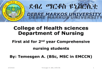 College of Health sciences Department of Nursing First aid for 2nd year Comprehensive nursing students By: Temesgen A. (BSc, MSC in EMCCN) 3/9/2025 Temesgen A. (BSc, EMCCN) 1 What is first aid? 3/9/2025 Temesgen A. (BSc, EMCCN) 2 Chapter 1: Introduction of First Aid Objectives: • Define First Aid and accident prevention • Identify reasons for First Aid • Explain principles of first aid • List value of First Aid Training • Adopt general directions for giving first aid 3/9/2025 Temesgen A. (BSc, EMCCN) 3 Definition • First aid refers to the actions taken in response to someone who is injured or has suddenly become ill (American College of Emergency Physicians (ACEP)). • It includes well selected words of encouragement, evidence of willingness to help, and promotion of confidence by demonstration of competence (American red cross, 1998). 3/9/2025 Temesgen A. (BSc, EMCCN) 4 Reasons for giving First Aid (Aims)-3Ps • To sustain (preserve) life: E.g. mouth to mouth respiration when breathing has stopped. • To prevent worsening of the problem (complication): E.g. Immobilizing the fractured bone. • To promote healing and recovery: e.g., reassure the patient, relief pain, protect from cold and arrange patient transfer 3/9/2025 Temesgen A. (BSc, EMCCN) 5 General principles of first aid • Rescue and removal of the causality in the shortest possible time without aggravating existing health situation • First aid should be confined to essential only. ‘never attempt CPR for responsive person’ • Immediate arrest of hemorrhage • Restoration of circulation 3/9/2025 Temesgen A. (BSc, EMCCN) 6 General principles of first aid • Preventing of impending shock and treatment of shock • Immobilization of simple or compound fracture and dislocation. • Alleviation of pain by simple procedure or medication. • Assurance of the victim 3/9/2025 Temesgen A. (BSc, EMCCN) 7 Value of first aid training • It does more than help save lives. • It enables you to increase patient comfort. • It gives you tools to prevent the situation from becoming worse. • It creates the confidence to care. • It encourages healthy and safe living 3/9/2025 Temesgen A. (BSc, EMCCN) 8 Infection prevention and patient safety • When you give first aid, it is important to protect yourself (and the casualty) from infection as well as injury • To help protect yourself from infection you can carry protective equipment such as: ■ Pocket mask or face shield ■ Latex-free disposable gloves ■ Alcohol gel to clean your hands 3/9/2025 Temesgen A. (BSc, EMCCN) 9 General directions for giving first aid • Assess a situation quickly and calmly. • Protect yourself and any casualties from danger—never put yourself at risk. • Prevent cross-contamination as best as possible • Comfort and reassure casualties. • Assess the casualty: identify, as best as you can, the injury or nature of illness affecting a casualty 3/9/2025 Temesgen A. (BSc, EMCCN) 10 General directions for given first aid • Give early treatment, and treat the casualties with the most serious (lifethreatening) conditions first. • Arrange for appropriate help: call ambulance/medical help for emergency help if you suspect serious injury or illness 3/9/2025 Temesgen A. (BSc, EMCCN) 11 Assessment of the casualty • Resist the temptation to begin dealing with any casualty until you have assessed the overall situation • Remember the following: • Be calm • Be aware of risks • Build and maintain the casualty’s trust • Call appropriate help • Remember your own needs 3/9/2025 Temesgen A. (BSc, EMCCN) 12 Methods of assessment The primary survey • This is an initial rapid assessment of a casualty to establish and treat conditions that are an immediate threat to life • Follow the Airway, Breathing, and Circulation (ABC) principle 3/9/2025 Temesgen A. (BSc, EMCCN) 13 Methods of assessment The primary survey • Airway: Is the airway open and clear? • The airway is not open and clear if the casualty is unable to speak. • Breathing: Is the casualty breathing normally? • If the casualty is not breathing normally, call for emergency help, then start chest compressions with rescue breaths (cardiopulmonary resuscitation/CPR). • If this happens, you are unlikely to move on to the next stage 3/9/2025 Temesgen A. (BSc, EMCCN) 14 Methods of assessment The primary survey • Circulation: Is the casualty bleeding severely? • If he is bleeding this must be treated immediately because it can lead to a lifethreatening condition known as shock • Call for emergency help • If there is no bleeding, continue to the secondary survey. 3/9/2025 Temesgen A. (BSc, EMCCN) 15 Methods of assessment The secondary survey • This is a detailed examination of a casualty • Your aim is to find out: • History: What actually happened and any relevant medical history. • Use the mnemonic AMPLE as an easy reminder. 3/9/2025 Temesgen A. (BSc, EMCCN) 16 Methods of assessment History - AMPLE • Allergy – Do they have any allergies? For example, nuts or any medication such as penicillin or aspirin? • Medication – are they taking any medication? • Previous medical history – do they suffer from any medical condition such as diabetes, epilepsy or heart disease? Have they had any previous injuries or surgery? • Last meal – when did they last eat or drink? • Event history – what happened and where? Is the incident due to an illness or an accident? Ask any people nearby what happened and look for any clues that may give you more information 3/9/2025 Temesgen A. (BSc, EMCCN) 17 Methods of assessment Signs • look, listen, feel and smell for any signs of injury such as: • swelling • deformity • bleeding • discoloration • any unusual smells • Compare the injured side of the body with the uninjured side. • Are they able to perform normal functions such as standing or moving their limbs? • As you check, make a note of any 