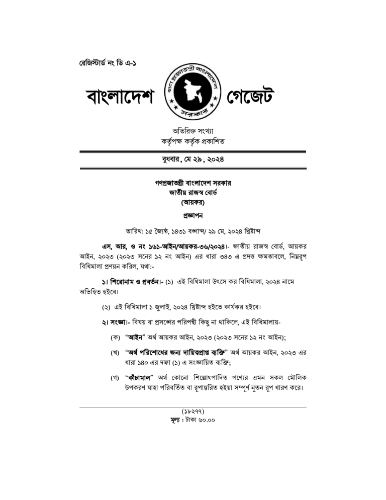 এস, আর, ও নাং ১৬১-আইন/আয়কর-৩৬/২০২৪।- জাতীয় রাজস্ব ববার্,ড আয়কর