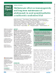 Spondyloarthritis Methotrexate effect on immunogenicity and long-­term maintenance of adalimumab in axial spondyloarthritis: a multicentric randomised trial Emilie Ducourau,1,2 Theo Rispens,3 Marine Samain,1 Emmanuelle Dernis,4 Fabienne Le Guilchard,5 Lucia Andras,5 Aleth Perdriger,6 Eric Lespessailles,2 Antoine Martin,7 Grégoire Cormier,8 Thomas Armingeat,9 Valérie Devauchelle-­Pensec,10 Elisabeth Gervais,11 Benoit Le Goff ,12 Annick de Vries,13 Eric Piver,14 Gilles Paintaud,15 Céline Desvignes,15 David Ternant,15 Hervé Watier ,16 Philippe Goupille,1,17 Denis Mulleman 1 To cite: Ducourau E, Rispens T, Samain M, et al. Methotrexate effect on immunogenicity and long-­term maintenance of adalimumab in axial spondyloarthritis: a multicentric randomised trial. RMD Open 2020;6:e001047. doi:10.1136/ rmdopen-2019-001047 ►► Additional material is published online only. To view please visit the journal online (http://dx.doi.org/10.1136/ rmdopen-2019-001047). Received 2 July 2019 Revised 4 December 2019 Accepted 6 December 2019 © Author(s) (or their employer(s)) 2020. Re-­use permitted under CC BY-­NC. No commercial re-­use. See rights and permissions. Published by BMJ. For numbered affiliations see end of article. Correspondence to Dr Denis Mulleman; denis.mulleman@u niv-tours.f r Abstract Objectives Anti-­drug antibodies (ADA) are responsible for decreased adalimumab efficacy in axial spondyloarthritis (SpA). We aimed to evaluate the ability of methotrexate (MTX) to decrease adalimumab immunisation. Methods A total of 110 patients eligible to receive adalimumab 40 mg subcutaneously (s.c.) every other week were randomised (1:1 ratio) to receive, 2 weeks before adalimumab (W-2) and weekly, MTX 10 mg s.c. (MTX+) or not (MTX−). ADA detection and adalimumab serum concentration were assessed at weeks 4 (W4), 8 (W8), 12 (W12) and 26 (W26) after starting adalimumab (W0). The primary outcome was the proportion of patients with ADA at W26. Four years after the study completion, we retrospectively analysed adalimumab maintenance in relation with MTX co-­treatment duration. Results We analysed data for 107 patients (MTX+; n=52; MTX-; n=55). ADA were detected at W26 in 39/107 (36.4%) patients: 13/52 (25%) in the MTX+ group and 26/55 (47.3%) in the MTX− group (p=0.03). Adalimumab concentration was significantly higher in the MTX+ than MTX− group at W4, W8, W12 and W26. The two groups did not differ in adverse events or efficacy. In the follow-­up study, MTX co-­treatment >W26 versus no MTX or ≤W26 was significantly associated with adalimumab long-­term maintenance (p=0.04). Conclusion MTX reduces the immunogenicity and ameliorate the pharmacokinetics of adalimumab in axial SpA. A prolonged co-­treatment of MTX>W26 seems to increase adalimumab long-­term maintenance. Introduction Spondyloarthritis (SpA) is a chronic inflammatory disease that affects the spine, pelvis, entheses and peripheral joints. Tumour necrosis factor inhibitors (TNFi) are biopharmaceuticals used in refractory forms of the disease, but about 25% of patients Key messages What is already known about this subject? ►► Methotrexate is not recommended in combination with adalimumab in axial spondyloarthritis (SpA). What does this study add? ►► Methotrexate decreases anti-­drug antibodies devel- opment and improves adalimumab pharmacokinetics. Prolonged co-­medication of methotrexate with adalimumab is associated with long-­term maintenance of adalimumab. How might this impact on clinical practice? ►► These results rise the potential interest of metho- trexate in combination with adalimumab in axial SpA. discontinue the drug beyond the first year, mostly because of primary failure or secondary loss of efficacy.1 In some cases, anti-­drug antibodies (ADA) develop, which affects drug pharmacokinetics, thereby resulting in drug withdrawal due to loss of efficacy.2 Hence, reducing immunogenicity to TNFi would ameliorate drug concentration (as a surrogate of drug exposure), clinical outcomes and long-­term maintenance. Adalimumab is a monoclonal antibody to tumour necrosis factor (TNF) approved in SpA.3 However, about 30% of patients were found positive for ADA after 24 weeks of treatment, which led to low or undetectable adalimumab concentrations and poor clinical response as assessed by the Ankylosing Spondylitis Disease Activity Score (ASDAS).4 5 Ducourau E, et al. RMD Open 2020;6:e001047. doi:10.1136/rmdopen-2019-001047 1 RMD Open: first published as 10.1136/rmdopen-2019-001047 on 9 January 2020. Downloaded from http://rmdopen.bmj.com/ on January 10, 2020 by guest. Protected by copyright. Original research RMD Open Methods Patients Patients were recruited between March 2013 and October 2014 within the HUGO network (Hôpitaux Universitaires du Grand Ouest—Western France University Hospitals). Patients gave their written informed consent to be in the study. Patients had to be at least 18 years of age and fulfil the Assessment of Spondylo-­Arthritis International Society criteria for axial SpA. Patients had to be eligible for a TNFi in accordance with the French marketing authorisation of pharmaceutical products, that is, has had an inadequate response or an intolerance to one or more nonsteroidal anti-­inflammatory drugs. Patients should not have received MTX during the last 3 months, and were not allowed to participate to the study if they had previously received adalimumab, or if they have received more than one TNFi. Study design This study was a 26-­week prospective, randomised, open-­ labelled, multicentre study. All patients received adalimumab 40 mg subcutaneously (s.c.) every other week. They were randomly assigned at a 1:1 ratio to receive, 2 weeks before adalimumab (W-2) and weekly, MTX 10 mg s.c. (MTX+) or not (MTX−). Patients were assessed while starting adalimumab (W0) and at weeks 4 (W4), 8 (W8), 12 (W12) and 26 (W26). At each visit, clinical variables to calculate ASDAS were recor