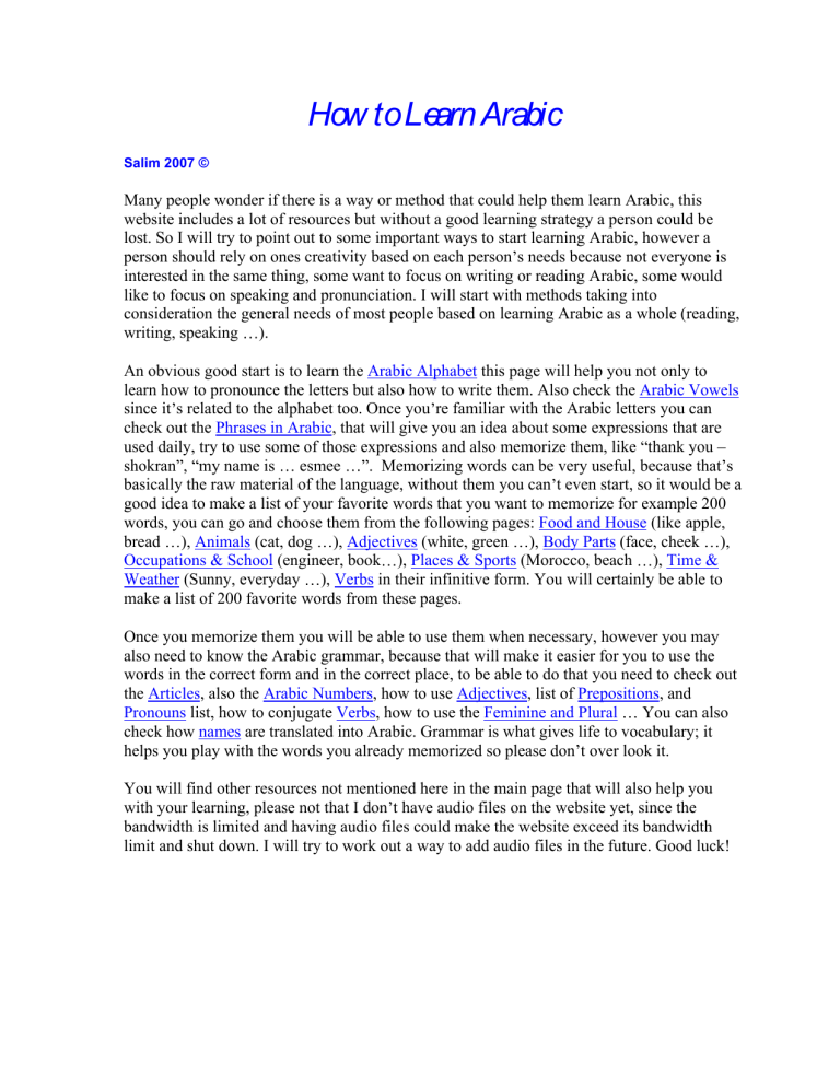How to Learn Arabic Salim 2007 © Many people wonder if there is a way or method that could help them learn Arabic, this website includes a lot of resources but without a good learning strategy a person could be lost. So I will try to point out to some important ways to start learning Arabic, however a person should rely on ones creativity based on each person s needs because not everyone is interested in the same thing, some want to focus on writing or reading Arabic, some would like to focus on speaking and pronunciation. I will start with methods taking into consideration the general needs of most people based on learning Arabic as a whole (reading, writing, speaking ). An obvious good start is to learn the Arabic Alphabet this page will help you not only to learn how to pronounce the letters but also how to write them. Also check the Arabic Vowels since it s related to the alphabet too. Once you re familiar with the Arabic letters you can check out the Phrases in Arabic, that will give you an idea about some expressions that are used daily, try to use some of those expressions and also memorize them, like thank you shokran , my name is esmee . Memorizing words can be very useful, because that s basically the raw material of the language, without them you can t even start, so it would be a good idea to make a list of your favorite words that you want to memorize for example 200 words, you can go and choose them from the following pages: Food and House (like apple, bread ), Animals (cat, dog ), Adjectives (white, green ), Body Parts (face, cheek ), Occupations & School (engineer, book ), Places & Sports (Morocco, beach ), Time & Weather (Sunny, everyday ), Verbs in their infinitive form. You will certainly be able to make a list of 200 favorite words from these pages. Once you memorize them you will be able to use them when necessary, however you may also need to know the Arabic grammar, because that will make it easier for you to use the words in the correct form and in the correct place, to be able to do that you need to check out the Articles, also the Arabic Numbers, how to use Adjectives, list of Prepositions, and Pronouns list, how to conjugate Verbs, how to use the Feminine and Plural You can also check how names are translated into Arabic. Grammar is what gives life to vocabulary; it helps you play with the words you already memorized so please don t over look it. You will find other resources not mentioned here in the main page that will also help you with your learning, please not that I don t have audio files on the website yet, since the bandwidth is limited and having audio files could make the website exceed its bandwidth limit and shut down. I will try to work out a way to add audio files in the future. Good luck! Arabic Alphabet Salim 2006 © You will learn in this lesson: Arabic alphabet, reading, pronunciation, and Arabic vowels. The Arabic alphabet is written and read from right to left and horizontally. There are 28 letters in the Arabic alphabet, first let s have a look at all of them in the table below: As you may have noticed, some of the letters in Arabic don t exist in English and vice versa. We will first go through the letters that exist in English, the table below shows the letters that you may not have any problem learning or pronouncing: Now we will go through the Arabic letters that are either hard to pronounce or are pronounced a little bit differently, you shouldn t worry if you can t pronounce them the right way, because there are always close pronunciations in Arabic, and you still can be understood. Reading Arabic: Now that you know how to pronounce the Arabic letters, we will go through reading them, Arabic letters should be written connected to each other, you can simply think of it as if you re writing in cursive in English, like in the example below you can see how the first WELCOME is written, then the second WELCOME which has all letters connected to each other, Unlike English, Arabic in most cases cannot be written with its letters separated from each other like the way we wrote the word WELCOME. Most letters should be connected like the way the second Welcome is written. There are some exceptions which we will go through in this lesson. To read Arabic you should know that the Arabic alphabet letters have up to 3 forms, each letter takes a form depending on its position in the word, look at the example below and you will notice that a letter has a form at the beginning of the word, in the middle of the word and at the end of the word, some letters however can keep the same form in one or two positions. Compare the m in the two examples below, the M of come has a longer tail than the M of the room because of the position of m, the same thing happens in Arabic. The form that a letter takes depends on its position in a given word, and the difference most of the time is very small, like a longer tail to allow it connect with another letter following it. The table below shows the three forms that a letter can take, a letter in a blue font shows a letter starting a word, the red font shows a letter in the middle of the word, and the black font shows a letter at the end of the word, as you may have noticed, there is no big different between the three forms. Just a tip for you: most of the time the letter at the end looks exactly like the letter when it s alone. Arabic Alphabet List: **: letters having stars next to them can only connect with other letters placed before them and not after, which means that if a letter is placed after them, that letter should take a form as if it was placed in the beginning of the word. Note also that the letters I marked with stars in the table above never connect with other letters marked with stars either before or after. So you have to be careful with these starred letters, because sometimes they may make you think that they re the last letter of a word because they have that form of an ending letter, while in the 