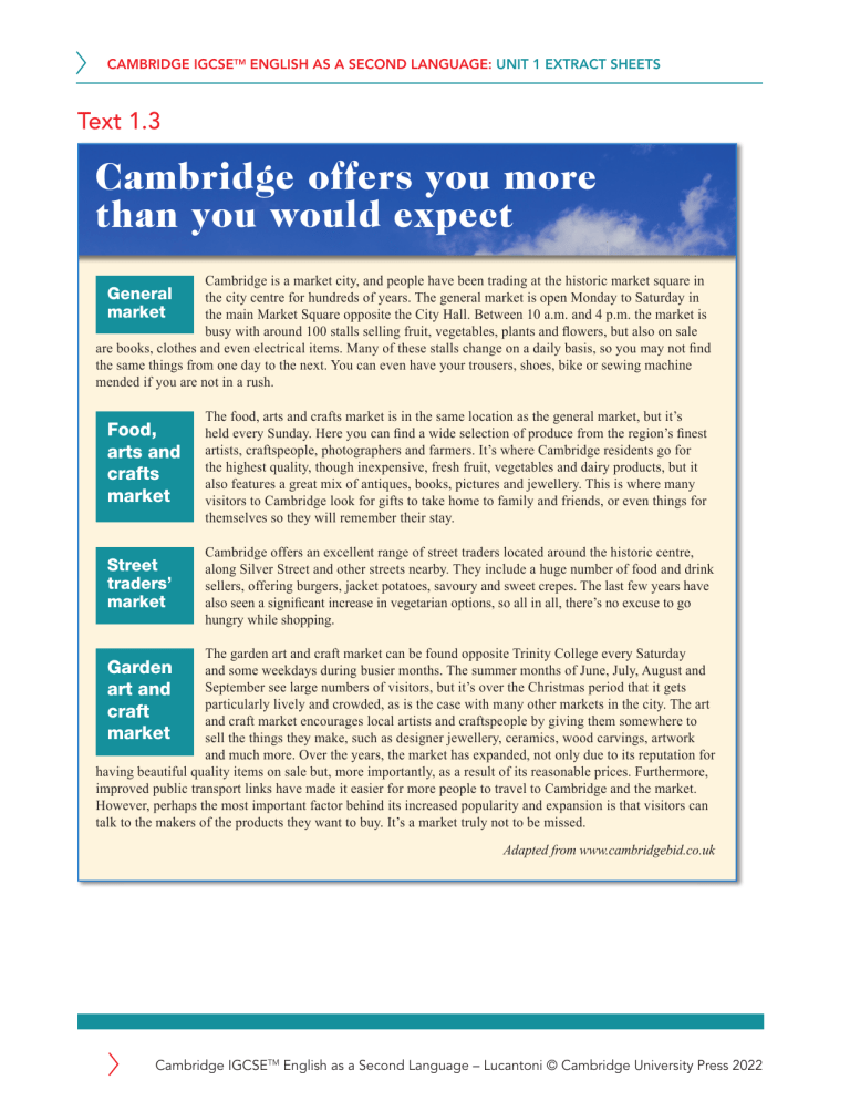 CAMBRIDGE IGCSETM ENGLISH AS A SECOND LANGUAGE: UNIT 1 EXTRACT SHEETS Text 1.3 Cambridge offers you more than you would expect Cambridge is a market city, and people have been trading at the historic market square in the city centre for hundreds of years. The general market is open Monday to Saturday in the main Market Square opposite the City Hall. Between 10 a.m. and 4 p.m. the market is busy with around 100 stalls selling fruit, vegetables, plants and flowers, but also on sale are books, clothes and even electrical items. Many of these stalls change on a daily basis, so you may not find the same things from one day to the next. You can even have your trousers, shoes, bike or sewing machine mended if you are not in a rush. General market Food, arts and crafts market The food, arts and crafts market is in the same location as the general market, but it’s held every Sunday. Here you can find a wide selection of produce from the region’s finest artists, craftspeople, photographers and farmers. It’s where Cambridge residents go for the highest quality, though inexpensive, fresh fruit, vegetables and dairy products, but it also features a great mix of antiques, books, pictures and jewellery. This is where many visitors to Cambridge look for gifts to take home to family and friends, or even things for themselves so they will remember their stay. Street traders’ market Cambridge offers an excellent range of street traders located around the historic centre, along Silver Street and other streets nearby. They include a huge number of food and drink sellers, offering burgers, jacket potatoes, savoury and sweet crepes. The last few years have also seen a significant increase in vegetarian options, so all in all, there’s no excuse to go hungry while shopping. The garden art and craft market can be found opposite Trinity College every Saturday and some weekdays during busier months. The summer months of June, July, August and September see large numbers of visitors, but it’s over the Christmas period that it gets particularly lively and crowded, as is the case with many other markets in the city. The art and craft market encourages local artists and craftspeople by giving them somewhere to sell the things they make, such as designer jewellery, ceramics, wood carvings, artwork and much more. Over the years, the market has expanded, not only due to its reputation for having beautiful quality items on sale but, more importantly, as a result of its reasonable prices. Furthermore, improved public transport links have made it easier for more people to travel to Cambridge and the market. However, perhaps the most important factor behind its increased popularity and expansion is that visitors can talk to the makers of the products they want to buy. It’s a market truly not to be missed. Garden art and craft market Adapted from www.cambridgebid.co.uk Cambridge IGCSETM English as a Second Language – Lucantoni © Cambridge University Press 2022