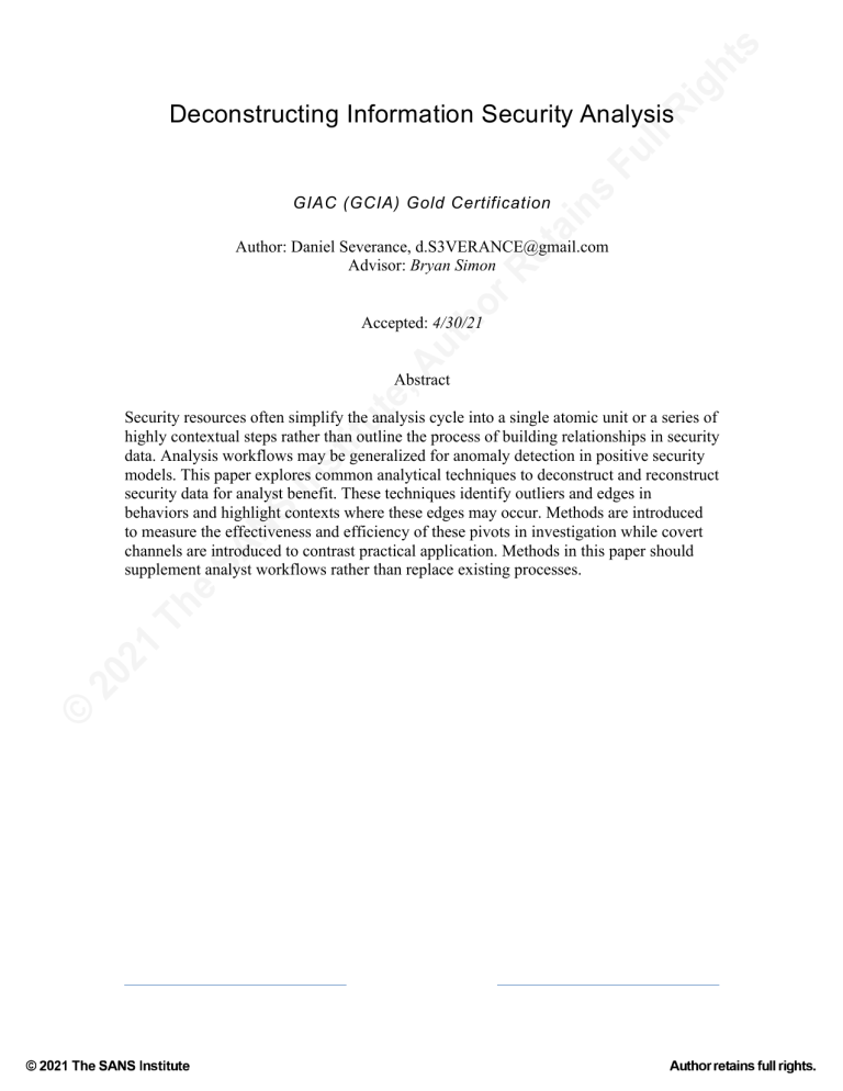 ts gh Ri ns Fu ll Deconstructing Information Security Analysis ai GIAC (GCIA) Gold Certification ho rR et Author: Daniel Severance, d.S3VERANCE@gmail.com Advisor: Bryan Simon ,A ut Accepted: 4/30/21 te Abstract © 20 21 Th e SA NS In st itu Security resources often simplify the analysis cycle into a single atomic unit or a series of highly contextual steps rather than outline the process of building relationships in security data. Analysis workflows may be generalized for anomaly detection in positive security models. This paper explores common analytical techniques to deconstruct and reconstruct security data for analyst benefit. These techniques identify outliers and edges in behaviors and highlight contexts where these edges may occur. Methods are introduced to measure the effectiveness and efficiency of these pivots in investigation while covert channels are introduced to contrast practical application. Methods in this paper should supplement analyst workflows rather than replace existing processes. © 2021 The SANS Institute Author retains full rights. ts Ri gh Deconstructing Information Security Analysis 2 Fu ll 1. Introduction Information security analysis is the culmination of techniques used to identify and ns process the relationships in data through a security context. Within this context, analysts ai describe data through its respective confidentiality, integrity, and availability. This et analytical process deconstructs information technologies and their standards, providing rR an active role in identifying adversaries and their methods. ho Security analysts and researchers derive modern detection frameworks such as ut MITRE ATT&CK from common techniques and indicators utilized within red team or ,A offensive playbooks (Strom et al., 2018). In this manner, security programs may often te operate under a negative security model by attempting to block known bad methods and itu indicators within an offensive campaign. While this approach is effective for known st adversaries and techniques, negative security models have no innate method to detect In novel attacks. At scale, this model centralizes analysis techniques and provides tools for NS the dissemination of these indicators or signatures through technologies and protocols SA such as STIX and TAXII (Barnum, 2012) (Connolly et al., 2012). With the rise of data science and machine learning, mathematically or behaviorally derived detections were Th e able to scale more effectively. However, while able to ingest data to determine abnormal 21 behaviors in an environment, these approaches are often opaque box in nature, either 20 through the nature of the model or through their nature as a proprietary detection © technique for security companies. This paper aims to facilitate a positive security model through identifying known acceptable behaviors and codifying fundamental searching and pivoting techniques utilized in hunting and proactive detection. Rather than known signatures, this paper will cover data exploration and anomaly detection through data deconstruction and reconstruction within new relationships. Pivots are reduced to analysis methods which produce edges to behavioral surfaces in the form of outliers and uncommonalities. These surfaces are placed in the context of environmental constraints. Security tooling and investigative context are highlighted to outline the identification of perspectives where edges may exist. Methods are introduced to measure and communicate the effectiveness and efficiency of information retrieval during this process. Daniel Severance, d.S3VERANCE@gmail.com © 2021 The SANS Institute Author retains full rights. ts Ri gh Deconstructing Information Security Analysis 3 ll This analytical workflow is applied in sum through the analysis of common covert Fu channels. For the purpose of this paper, the definition of covert channels has been ns expanded beyond the original definition by Butler Lampson from channels “not intended ai for information transfer” to include side channels not intended for transfer by their et operators in addition to their developers or creators (1973). In this way, this paper rR includes channels such as social media wherein data is transmitted tangent to its original ho role. This abstracted definition covers hidden channels used for both data exfiltration and ut command and control within lateral movement and asset management in offensive ,A operations. A series of descriptive and inferential analysis techniques are proposed across st 2. Related Works itu te these channel types to ascribe their benefits and limitations within analytical workflows. In While this paper is scoped for a security audience, the content contained herein is NS primarily derived from other established scholastic domains such as statistics, discrete SA math, and criminal justice. The novelty and usefulness of this paper are within the application rather than the techniques themselves. Those accustomed to these domains Th e may find some concepts familiar. The analytical techniques contained herein cover only a sample of techniques from the fields of discrete math and statistics. In the interest of 21 accessibility, this paper will only cover descriptive statistics such as mean and standard 20 deviation as well as a high-level selection of techniques in categories such as inference © and time-series analysis. More advanced coverage of these topics is available in written and online resources (Bruce & Bruce, 2017) (VanderPlas, 2016). Study design has been indirectly applied to the security analysis pipeline as well. Some deviations and simplifications have been applied (Ranganathan & Aggarwal, 2018). Additionally, the criminal justice system has established investigative patterns, including those for cybercrime. Investigations within the criminal justice system may include additional data collection techniques like interviewing and geo-spatial analysis that may not be present in all informati