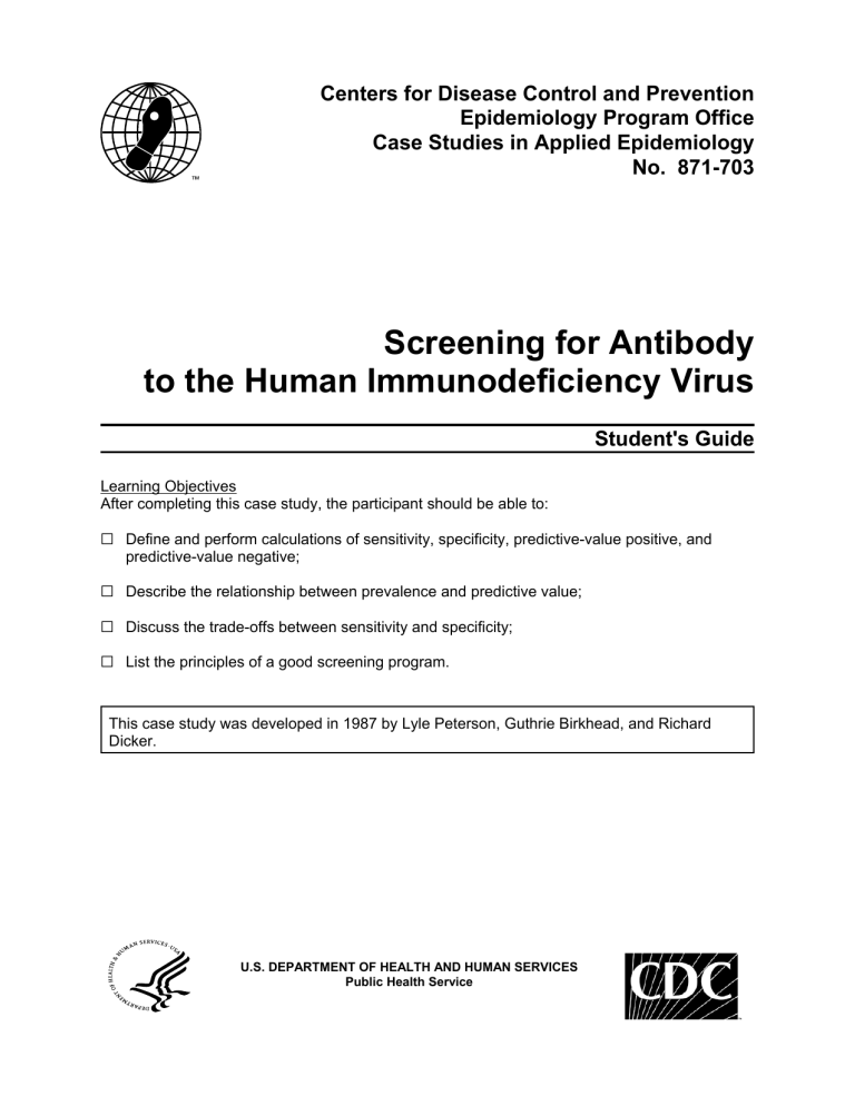 Centers for Disease Control and Prevention Epidemiology Program Office Case Studies in Applied Epidemiology No. 871-703 Screening for Antibody to the Human Immunodeficiency Virus Student's Guide Learning Objectives After completing this case study, the participant should be able to: G Define and perform calculations of sensitivity, specificity, predictive-value positive, and predictive-value negative; G Describe the relationship between prevalence and predictive value; G Discuss the trade-offs between sensitivity and specificity; G List the principles of a good screening program. This case study was developed in 1987 by Lyle Peterson, Guthrie Birkhead, and Richard Dicker. U.S. DEPARTMENT OF HEALTH AND HUMAN SERVICES Public Health Service CDC-EIS, 2003: Screening for HIV (871-703) – Student's Guide Page 2 PART I In December 1982, a report in the MMWR described three persons who had developed acquired immunodeficiency syndrome (AIDS) but who had neither of the previously known risk factors for the disease: homosexual/bisexual activity with numerous partners and intravenous drug use. These three persons had previously received whole-blood transfusions. By 1983, widespread recognition of the problem of transfusion-related AIDS led to controversial recommendations that persons in known high-risk groups voluntarily defer from donating blood. In June 1984, after the discovery of the human immunodeficiency virus (HIV), five companies were licensed to produce enzyme-linked immunosorbent assay (EIA, then called ELISA) test kits for detecting HIV antibody. A Food and Drug Administration (FDA) spokesman stated that, "...getting this test out to the blood banks is our No. 1 priority...." Blood bank directors were anxiously waiting to start screening blood with the new test until March 2, 1985, the date the first test kit was approved by the FDA. In the pre-licensure evaluation, sensitivity and specificity of the test kits were estimated using blood samples from four groups: those with AIDS by CDC criteria, those with other symptoms and signs of HIV infection, those with various autoimmune disorders and neoplastic diseases that could give a false-positive test result, and presumably healthy blood and plasma donors. Numerous complex issues were discussed even before licensure. Among them were understanding the magnitude of the problem of false-positive test results, and determining whether test-positive blood donors should be notified. It is now March 2, 1985. The first HIV antibody test kits will arrive in blood banks in the state in a few hours. Meeting with State Epidemiologist to discuss the appropriate use of this test are the Commissioner of Health, the medical director of the regional blood bank, and the chief of the State Drug Abuse Commission. To help in the discussions, the State Epidemiologist turns to pre-licensure information regarding the sensitivity and specificity of test kit A. The information indicates that the sensitivity of test kit A is 95.0% (0.95) and the specificity is 98.0% (0.98). These and related measures are reviewed below. NOTES ON SENSITIVITY AND SPECIFICITY Actual antibody status Test result Present Absent Total Positive True positive (A) False positive (B) All positive tests (A+B) Negative False negative (C) True negative (D) All negative tests (C+D) Total All with antibody (A+C) All without antibody (B+D) Total (A+B+C+D) Sensitivity - the probability that the test result will be positive when administered to persons who actually have the antibody. = true positives / all with antibody Algebraically, sensitivity = A / (A+C) Predictive-value positive (PVP) - the probability that a person with a positive screening test result actually has the antibody. = true positives / all with positive test Algebraically, PVP = A / (A+B). Specificity - the probability that the test result will be negative when administered to persons who are actually without the antibody. = true negatives / all without antibody Algebraically, specificity = D / (B+D). Predictive-value negative (PVN) - the probability that a person with a negative screening test result actually does not have the antibody. = true negatives / all with negative test Algebraically, PVN = D / (C+D). CDC-EIS, 2003: Screening for HIV (871-703) – Student's Guide Page 3 Question 1: With this information, by constructing a 2-by-2 table, calculate the predictive-value positive and predictive-value negative of the EIA in a hypothetical population of 1,000,000 blood donors. Using a separate 2-by-2 table, calculate PVP and PVN for a population of 1,000 drug users. Assume that the actual prevalence of HIV antibody among blood donors is 0.04% (0.0004) and that of intravenous drug users is 10.0% (0.10). CDC-EIS, 2003: Screening for HIV (871-703) – Student's Guide The blood bank director wants assistance in evaluating the EIA as a test for screening donor blood in the state. In particular, she is concerned about the possibility that some Page 4 antibody-positive units will be missed by the test, and she wonders about false-positive test results since she is under pressure to develop a notification procedure for EIA-positive donors. Question 2: Do you think that the EIA is a good screening test for the blood bank? What would you recommend to the blood bank director about notification of EIA-positive blood donors? The chief of the State Drug Abuse Commission has noticed a dramatic increase in AIDS among clients in his intravenous-drug-abuse treatment programs. For planning purposes, he wants to do a voluntary HIV antibody seroprevalence survey of intravenous-drug-abuse clients and would like to assess the feasibility of using the test results as part of behavior-modification counseling. Question 3: Do you think that the EIA performs well enough to justify informing test-positive clients in the drug abuse clinics that they are positive for HIV? CDC-EIS, 2003: Screening for HIV (871-703) – Student's Guide Page 5 Question 4: If sensitiv