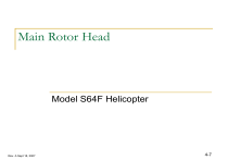 Main Rotor Head Model S64F Helicopter Rev. A Sept 18, 2007 4-7 Main Rotor Head The MRH is fully articulated The MRH is made up of two principal components the hub and the Swashplate. The hub consists of an upper and lower plate, hinge assemblies, sleeve and spindle assemblies, and six pressurized dampers. The Swashplate consists of a rotating disc and stationary disc connected together. Other components of the head are anti-flapping restrainers, adjustable pitch control rod assemblies, and rotating and stationary scissors. Rev. A Sept 18, 2007 4-8 Main Rotor Head Hub Swashplate Rev. A Sept 18, 2007 4-9 Main Rotor Head The Swashplate and control rods permit movement of flight controls to be transmitted to the blades. The hinge assemblies allow the blades to lead, lag, and flap. The sleeve and spindle assemblies allow each blade to be turned on its span wise axis to change blade pitch. The dampers prevent damage to the head by absorbing blade loads during rotor operation Rev. A Sept 18, 2007 4-10 Main Rotor Head Hinge Assembly Control Rod Rev. A Sept 18, 2007 Sleeve & Spindle Damper 4-11 Main Rotor Head The anti-flapping restrainers restrict flapping motion of the blades when the main rotor head is slowing or stopped. The rotating scissors are connected to the rotating Swashplate and to the lower plate of the hub. The stationary scissors are connected to the stationary Swashplate and the main gearbox upper housing. Rev. A Sept 18, 2007 4-12 Main Rotor Head Rotating Scissors Stationary Scissors Rev. A Sept 18, 2007 4-13 Main Rotor Head Lubrication The sleeve and spindle assembly receives lubrication from the individual oil reservoir mounted on the upper plate above the horizontal hinge pin. The oil lubricates the spindle bearings through an external tube from the horizontal hinge pin housing. Centrifugal force and gravity feed the oil into the spindle. Rev. A Sept 18, 2007 4-14 Oil Reservoirs Reservoirs (6) Rev. A Sept 18, 2007 4-15 Controls Primary servo inputs are sent to the MRH through the Swashplate. The PC links connect the Swashplate to the pitch horn on the sleeve and spindle. Stationary and Rotating scissors help to keep their perspective Swashplate stable. Each MRB has a damper which allows it to lead and lag. Rev. A Sept 18, 2007 4-16 Controls Damper Control Rod Rotating Scissors Primary Servo Stationary Scissors Rev. A Sept 18, 2007 4-17 Swashplate The Swashplate has two halves; stationary and rotating. The stationary Swashplate attaches to the primary servos and transfers inputs to the rotating Swashplate. The rotating Swashplate rotates with the rotor head and transfers inputs from the stationary Swashplate to the pitch horn. The Swashplate assembly pivots around the drive shaft on the uniball. Rev. A Sept 18, 2007 4-18 Swashplate Rotating Swashplate Spherical Bearing Rev. A Sept 18, 2007 Stationary Swashplate 4-19 Control Rods The adjustable control rods extend from the sleeve and spindle horn assembly to the rotating Swashplate. The bearings are allowed 0.013 inch (.33 mm) play or a combined allowance of 0.021 inch (.533 mm). Blade pitch adjustments are made at the PC link, each notch on the PC moves the blade path about ½ inch (1.27 cm). Adjustment notches Rev. A Sept 18, 2007 4-20 Rotating & Stationary Scissors The rotating scissor assemblies are bolted between the lower plate of the main rotor hub and rotating Swashplate. They cause the rotating Swashplate to rotate with the main rotor hub. The stationary scissors connect the stationary Swashplate to the main gearbox. They prevent the stationary Swashplate from turning with the main rotor head. Rev. A Sept 18, 2007 Rotating Scissors Stationary Scissor 4-21 Droop & Flap Restrainers The droop and flap restrainers are spring loaded in the locked position and are disengaged with centrifugal force. They restrict drooping and flapping of blades when the MRH is slowing down or static. Droop Restrainers Anti-flapping Assembly Rev. A Sept 18, 2007 4-22 Damper Description The dampers are mounted between the upper and lower plates of the MRH to slow hunting of blades during rotation and to absorb rotor engagement loads. Damper Mounts Rev. A Sept 18, 2007 4-23 Damper Description The dampers are pressurized with hydraulic fluid from an accumulator installed in the main rotor shaft. Constant pressurization allows the damper piston shaft to be fully extended at all times except when main rotor loads cause the fluid to be bypassed internally, causing the shaft of the piston to withdraw into the damper. Rev. A Sept 18, 2007 4-24 Damper System From Accumulator Rev. A Sept 18, 2007 4-25 Damper Accumulator The damper accumulator is serviced with nitrogen to maintain a constant hydraulic pressure to the dampers. A visual indicator rod in the top of the accumulator indicates proper hydraulic pre-charge. The pressure gauge and servicing valve for the accumulator are on the support ring of the main rotor head fairing. Rev. A Sept 18, 2007 4-26 Damper Accumulator Installation Nitrogen Pressure Indicator Accumulator Rev. A Sept 18, 2007 4-27 Accumulator Charging From time to time the damper accumulator hydraulics will need to be recharged. The indicator pin on top of the accumulator indicates servicing required. The hand pump on the sled is used to pump hydraulic fluid from the utility reservoir into the accumulator. As hydraulic fluid is pumped into the accumulator the indicator pin will go down. Rev. A Sept 18, 2007 Hand Pump for Accumulator 4-28 MRH Installation Prior to installing the MRH inspect the vertical shaft splines and split cone seat. Inspect threaded relief grove for cracks with 5x magnifying glass. If baked resin coating is present no inspection is required. Master Splines Split Cone Seat Relief Groove Rev. A Sept 18, 2007 4-29 MRH Installation The main gear box shaft has a 3º tilt. When removing or installing the MRH this tilt should be removed by filling the nose strut and left hand gear leg with nitrogen. The main rotor head is