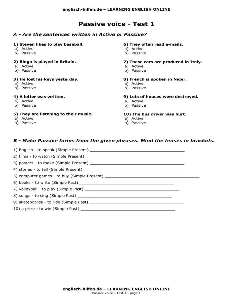 englisch-hilfen.de – LEARNING ENGLISH ONLINE Passive voice - Test 1 A - Are the sentences written in Active or Passive? 1) Steven likes to play baseball. a) Active b) Passive 6) They often read e-mails. a) Active b) Passive 2) Bingo is played in Britain. a) Active b) Passive 7) These cars are produced in Italy. a) Active b) Passive 3) He lost his keys yesterday. a) Active b) Passive 8) French is spoken in Niger. a) Active b) Passive 4) A letter was written. a) Active b) Passive 9) Lots of houses were destroyed. a) Active b) Passive 5) They are listening to their music. a) Active b) Passive 10) The bus driver was hurt. a) Active b) Passive B - Make Passive forms from the given phrases. Mind the tenses in brackets. 1) English - to speak (Simple Present) ______________________________________ 2) films - to watch (Simple Present) ______________________________________ 3) posters - to make (Simple Present) ______________________________________ 4) stories - to tell (Simple Present) ______________________________________ 5) computer games - to buy (Simple Present) ______________________________________ 6) books - to write (Simple Past) ______________________________________ 7) volleyball - to play (Simple Past) ______________________________________ 8) songs - to sing (Simple Past) ______________________________________ 9) skateboards - to ride (Simple Past) ______________________________________ 10) a prize - to win (Simple Past) ______________________________________ englisch-hilfen.de – LEARNING ENGLISH ONLINE Passive voice - Test 1 - page 1 englisch-hilfen.de – LEARNING ENGLISH ONLINE C - Rewrite the Active sentences into Passive. 1) They understand Spanish. ____________________________________________________________________ 2) My friend bought a new car. ____________________________________________________________________ 3) John cleaned the bathroom. ____________________________________________________________________ 4) The teacher closes the window. ____________________________________________________________________ 5) The girls can play handball. ____________________________________________________________________ 6) Our dog did not bite the cat. ____________________________________________________________________ 7) The mechanic repairs cars. ____________________________________________________________________ 8) The electricians test the fire alarm. ____________________________________________________________________ 9) Levi Strauss invented the blue jeans. ____________________________________________________________________ 10) Frank takes photos. ____________________________________________________________________ D - Rewrite the Passive sentences into Active. 1) The telephone was invented by Alexander Graham Bell. ____________________________________________________________________ 2) This book was written by an Irishman. ____________________________________________________________________ 3) The president was elected by the people. ____________________________________________________________________ 4) The bag was packed by his mother. ____________________________________________________________________ 5) The child was hit by a car. ____________________________________________________________________ 6) The exercise is completed by the teacher. ____________________________________________________________________ 7) Google was founded by Larry and Sergey. ____________________________________________________________________ 8) Football is played by the children. ____________________________________________________________________ 9) The computer is used by Patrick. ____________________________________________________________________ 10) Coffee is sold by Marie. ____________________________________________________________________ englisch-hilfen.de – LEARNING ENGLISH ONLINE Passive voice - Test 2 - page 2