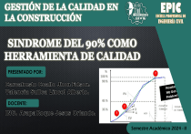 PRESENTADO POR: DOCENTE: Semestre Académico 2024 - II INTRODUCCIÓN En el ámbito de la gestión de proyectos de construcción, garantizar el cumplimiento de plazos y la entrega de productos finales de calidad constituye un desafío constante. Sin embargo, una dificultad común que enfrentan los proyectos a gran escala es el fenómeno conocido como Síndrome del 90%. El Síndrome del 90% en proyectos de construcción ocurre cuando, tras alcanzar un 90% de avance, la finalización se retrasa por tareas críticas e imprevistas, generando sobrecostos. Herramientas como la Curva S y la Curva de Liberación ayudan a controlar el avance y validar entregables, permitiendo anticipar problemas y evitar demoras en la etapa final. OBJETIVOS OBJETIVO GENERAL ✓ Analizar el impacto del Síndrome del 90% en la gestión de proyectos de construcción y proponer estrategias basadas en las Curvas de Liberación para su detección y mitigación. OBJETIVOS ESPECÍFICOS ✓ Describir el fenómeno del Síndrome del 90% y su relación con la gestión de calidad en proyectos de construcción. ✓ Evaluar la eficacia de las herramientas de control, como las Curvas S, Q3 y Q3’, en la detección temprana del síndrome. ✓ Aplicar metodologías estándar y simplificadas en un caso práctico para analizar su efectividad en la gestión del síndrome. CAPITULO 1: CONCEPTUALIZACIÓN DEL SÍNDROME DEL 90% Origen del Síndrome del 90% en la Construcción El Síndrome del 90% ocurre en proyectos de construcción cuando, tras alcanzar un 90% de avance, el progreso restante se ralentiza por mala planeación y gestión, extendiendo plazos y costos. Definición y Características del Síndrome El Síndrome del 90% ocurre cuando, aunque parece que un proyecto avanza, no se aprueban entregables finales porque no cumplen con los requisitos, lo que frena el progreso real. Las principales características de este síndrome incluyen: ✓ Estancamiento en la liberación de entregables ✓ Retrasos en los plazos contractuales ✓ Incremento en los costos operativos. CAPITULO 1: CONCEPTUALIZACIÓN DEL SÍNDROME DEL 90% Impacto en la Gestión de Proyectos El Síndrome del 90% afecta la gestión de proyectos al subestimar el esfuerzo restante, lo que lleva a decisiones tardías y a sobrecargar recursos con medidas correctivas de última hora. Relación entre el Síndrome del 90% y la Gestión de la Calidad El Síndrome del 90% está estrechamente ligado a la gestión de la calidad. Integrar herramientas como la Curva de Liberación y la Curva Límite Superior permite controlar que cada fase del proyecto cumpla con los estándares de calidad antes de avanzar, ayudando a prevenir y detectar a tiempo este fenómeno.. CAPITULO 2: CURVAS DE CONTROL Y EL SÍNDROME DEL 90% Introducción a las Curvas de Control Las curvas de control, como la Curva S, la Curva de Liberación (Q3) y la Curva Límite Superior (Q3’), son herramientas clave en la gestión de proyectos de construcción. Ayudan a comparar el avance real con el planificado, facilitando decisiones basadas en datos objetivos y proporcionando un análisis integral del progreso. Curva S y su Limitación en el Control de Proyectos La Curva S es una herramienta gráfica utilizada para comparar el avance físico planificado y real de un proyecto. Su nombre se debe a su forma característica: inicio lento, aceleración en la etapa media y desaceleración al final. Muestra el avance acumulado de las actividades planificadas versus el real. CAPITULO 2: CURVAS DE CONTROL Y EL SÍNDROME DEL 90% Curva S y su Limitación en el Control de Proyectos Limitaciones de la Curva S: •No detecta el Síndrome del 90%, que ocurre cuando el avance se acerca al 100%, pero los entregables finales no están listos o validados. •Puede generar una percepción errónea de progreso, mostrando casi un 100% de avance acumulado sin que los entregables hayan sido aceptados formalmente. CAPITULO 2: CURVAS DE CONTROL Y EL SÍNDROME DEL 90% Curva de Liberación (Q3) y Curva Límite Superior (Q3’) La Curva de Liberación (Q3) muestra el progreso real de un proyecto, incluyendo solo las tareas que ya han sido completadas y aprobadas con la calidad requerida. Por otro lado, la Curva Límite Superior (Q3’) representa un escenario ideal, donde se asume que todo lo que está en proceso ya está terminado. Esto ayuda a los encargados del proyecto a identificar diferencias entre lo que se espera y lo que realmente se ha logrado, y a anticipar posibles retrasos CAPITULO 3: METODOLOGÍAS PARA LA DETECCIÓN Y GESTIÓN DEL SÍNDROME DEL 90% Metodología Estándar Esta metodología evalúa el porcentaje de avance considerando únicamente aquellos entregables que han sido validados y aceptados, proporcionando una perspectiva realista del progreso del proyecto Proceso de Identificación del Síndrome El proceso comienza con la identificación y el seguimiento de los entregables del proyecto. El avance total del proyecto se calcula utilizando tres curvas: ✓ Curva S (P3) ✓ Curva de Liberación (Q3) ✓ Curva Límite Superior (Q3’) El Síndrome del 90% se detecta cuando el avance físico (P3) se aproxima al límite superior (Q3’), mientras que la liberación efectiva (Q3) muestra un estancamiento. CAPITULO 3: 201.2 METODOLOGÍAS PARA LA DETECCIÓN Y GESTIÓN DEL SÍNDROME DEL 90% Metodología Estándar Proceso de Identificación del Síndrome Cálculo de Avance y Liberación Avance Total (%) = % Entregables Terminados + % Entregables en Proceso Liberación Real (Q3) = % Entregables Terminados y Validados Límite Superior (Q3’) = % Entregables Terminados + % Entregables en Proceso (considerados terminados) CAPITULO 3: METODOLOGÍAS PARA LA DETECCIÓN Y GESTIÓN DEL SÍNDROME DEL 90% Metodolo Simplificado Es una variante de la Metodología Estándar que busca agilizar el proceso de monitoreo Ventajas y aplicaciones se basa en los mismos principios que la Metodología Estándar, pero en lugar de evaluar entregables indiv