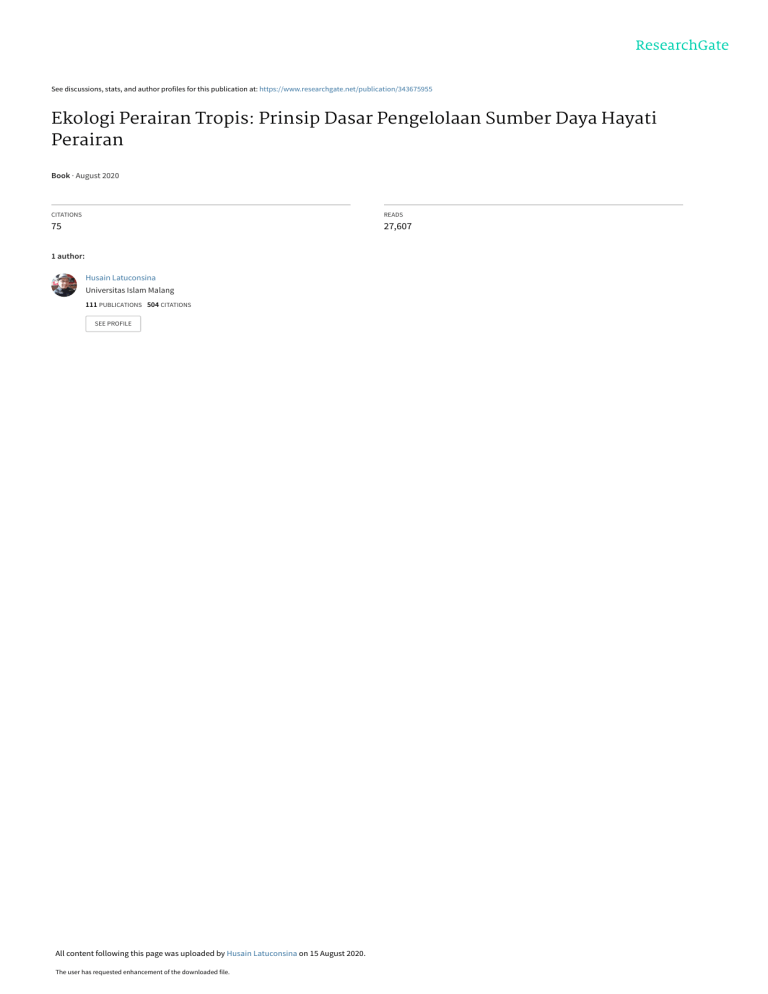 See discussions, stats, and author profiles for this publication at: https://www.researchgate.net/publication/343675955 Ekologi Perairan Tropis: Prinsip Dasar Pengelolaan Sumber Daya Hayati Perairan Book · August 2020 CITATIONS READS 75 27,607 1 author: Husain Latuconsina Universitas Islam Malang 111 PUBLICATIONS 504 CITATIONS SEE PROFILE All content following this page was uploaded by Husain Latuconsina on 15 August 2020. The user has requested enhancement of the downloaded file. Edisi Ketiga Gadjah Mada University Press Buku ini dipersembahkan kepada istri tercinta: Ivatul Laily Kurniawati, S.Pd., M.Pd. PROLOG Indonesia merupakan negara kepulauan terbesar di dunia dengan luas laut sekitar 3,1 juta km2. Selain itu, Indonesia memiliki kewenangan memanfaatkan Zona Ekonomi Eksklusif (ZEEI) seluas 2,7 juta km2 dalam hal eksplorasi, eksploitasi dan pengelolaan sumber daya hayati dan non-hayati, penelitian, dan yurisdiksi mendirikan instalasi atau pulau buatan. Indonesia juga memiliki sumberdaya perairan darat berupa sungai, waduk, dan rawa yang luasnya sekitar 141.690 ha. Hingga saat ini, wilayah perairan laut dan darat tersebut, selain belum memberikan kontribusi sebagaimana yang diharapkan terutama dalam hal peningkatan Produk Domestik Bruto (PDB) nasional, juga sering dikelola kurang ramah lingkungan. Pengelolaan yang kurang ramah lingkungan tersebut sering terjadi tanpa disadari akibat kurangnya pemahaman tentang aspek ekologi dari sumber daya ekosistem perairan tropis yang ada di dalamnya. Untuk itu, saya menyambut baik penerbitan buku Ekologi Perairan Tropis: Prinsip Dasar Pengelolaan Sumber Daya Hayati Perairanyang ditulis oleh Saudara Husain Latuconsina. Buku ini dapat memberi pemahaman dasar tentang konsep ekologi pada ekosistem perairan tropis yang terdapat di wilayah Indonesia. Buku ini membahas secara luas konsep dasar ekologi yang terdiri atas tiga komponen utama. Pertama adalah konsep aliran energi dalam ekosistem, yang mencakup konsep aliran energi, produktivitas, rantai makanan dan tingkatan trofik, serta piramidaekologi. Kedua adalah konsep siklus materi dalam ekosistem, yang mencakup konsep dasar siklus biogeokimia, antara lain siklus hidrologi, siklus karbon dan oksigen, siklus nitrogen, dan siklus fosfor. Ketiga adalah konsep peran organisme hidup sebagai pengalir energi dan pendaur materi di dalam ekosistem, yang mencakup faktor pembatas dalam sistem ekologi; spesies, individu, dan populasi dalam sistem ekologi; komunitas biotik dalam sistem ekologi; dan dinamika yang terjadi dalam sistem ekologi. Interaksi ketiga komponen ekologi tersebut tergambar pada uraian tiga ekosistem perairan tropis. Pertama adalah ekosistem perairan tawar, yang menguraikan secara luas karakteristik ekosistem perairan tawar, ekosistem perairan lotik atau mengalir, ekosistem perairan lentik atau tenang/tergenang. Kedua adalah ekosistem perairan payau atau estuari yang menguraikan secara luas karakteristik perairan estuari, penggolongan perairan estuari, konsep faktor pembatas pada perairan estuari, siklus nutrien, produktivitas dan jaring makanan, organisme penghuni perairan estuari, peranan ekologi perairan estuari, dan hutan mangrove yang merupakan ekosistem spesifik pada kawasan estuari. Ketiga adalah ekosistem perairan laut, yang menguraikan secara luas karakteristik dan zonasi lautan, faktor lingkungan pembatas, komunitas biotik perairan laut, ekosistem padang lamun, ekosistem terumbu karang, interaksi ekologis antara ekosistem utama pada perairan laut tropis, yaitu hutan mangrove, padang lamun, dan terumbu karang, ekosistem perairan oseanik dan laut dalam. Buku ini juga menguraikan penerapan prinsip dasar ekologi dalam upaya pengelolaan sumber daya hayati perairan tropis, dimana diuraikan tentang prinsip stabilitas ekosistem dalam pengelolaan terumbu karang, prinsip spill over dan recruitment effect dalam pengembangan kawasan konservasi laut, prinsip keseimbangan interaksi faktor biotik dan abiotik dalam pengelolaan perikanan tangkap, prinsip daya dukung dalam pengembangan perikanan budi daya, prinsip keterpaduan pengelolaan perairan pesisir, dan prinsip keseimbangan ekologi dalam upaya pengurangan dampak pemanasan global. Buku ini baik untuk dibaca oleh mahasiswa, praktisi atau pemerhati lingkungan karena pada buku ini diuraikan prinsip dasar ekologi pada ekosistem perairan tropis Indonesia. Mahasiswa, praktisi, atau pemerhatiekologi yang ingin mengenal lebih dalam tentang mekanisme dan proses ekologi pada ekosistem perairan, disarankan untuk membaca buku ini terlebih dahulu. Kehadiran buku ini menambah referensi ekologi perairan tropis dalam bahasa Indonesia yang jumlahnya saat ini sangat sedikit. Oleh karena itu, saya mengucapkan selamat dan sukses selalu kepada Saudara Husain Latuconsina. Selamat atas keberhasilannya merampungkan buku ini yang akan memasuki cetakan kedua. Makassar, 01 Juli 2017 Prof. Dr. Ir. Ambo Tuo, DEA. Guru Besar Ekologi Laut, Universitas Hasanuddin, Makassar SAMBUTAN REKTOR UNIVERSITAS ISLAM MALANG Seiring dengan berdirinya Universitas Islam Malang (UNISMA) pada 27 Maret 1981 silam, kini telah memasuki usia 38 tahun. UNISMA di bawah naungan Lembaga Pendidikan Ma’arif Nahdlatul Ulama ini telah banyak mendapatkan kepercayaan dari pemerintah dan berbagai elemen masyarakat dalam rangka berpartisipasi dalam mensukseskan Pembangunan Nasional, khususnya dibidang pendidikan. Visi Universitas Islam Malang adalah “Menjadi Universitas unggul bertaraf internasional, berorientasi masa depan dalam IPTEKS dan budaya, untuk kemaslahatan umat yang berakhlaqul karimah, berlandaskan Islam Ahlussunnah waljama’ah”. Untuk mewujudkannya maka salah satu misinya adalah Meningkatkan kualitas pendidikan, penelitian, pengabdian kepada masyarakat, yang berpihak pada kemaslahatan umat menuju universitas berkualifikasi internasional (world class university). Terdapat lima milestone pendidikan Universitas Islam Malang untuk menuju World Class University, yaitu: 1. Tahap Good University G