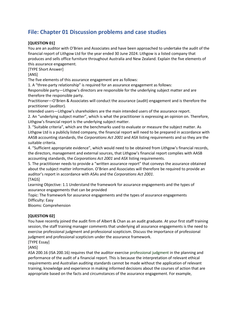 File: Chapter 01 Discussion problems and case studies [QUESTION 01] You are an auditor with O’Brien and Associates and have been approached to undertake the audit of the financial report of Lithgow Ltd for the year ended 30 June 2024. Lithgow is a listed company that produces and sells office furniture throughout Australia and New Zealand. Explain the five elements of this assurance engagement. [TYPE Short Answer] [ANS] The five elements of this assurance engagement are as follows: 1. A “three-party relationship” is required for an assurance engagement as follows: Responsible party—Lithgow’s directors are responsible for the underlying subject matter and are therefore the responsible party. Practitioner—O’Brien & Associates will conduct the assurance (audit) engagement and is therefore the practitioner (auditor). Intended users—Lithgow’s shareholders are the main intended users of the assurance report. 2. An “underlying subject matter”, which is what the practitioner is expressing an opinion on. Therefore, Lithgow’s financial report is the underlying subject matter. 3. “Suitable criteria”, which are the benchmarks used to evaluate or measure the subject matter. As Lithgow Ltd is a publicly listed company, the financial report will need to be prepared in accordance with AASB accounting standards, the Corporations Act 2001 and ASX listing requirements and so they are the suitable criteria. 4. “Sufficient appropriate evidence”, which would need to be obtained from Lithgow’s financial records, the directors, management and external sources, that Lithgow’s financial report complies with AASB accounting standards, the Corporations Act 2001 and ASX listing requirements. 5. The practitioner needs to provide a “written assurance report” that conveys the assurance obtained about the subject matter information. O’Brien and Associates will therefore be required to provide an auditor’s report in accordance with ASAs and the Corporations Act 2001. [TAGS] Learning Objective: 1.1 Understand the framework for assurance engagements and the types of assurance engagements that can be provided Topic: The framework for assurance engagements and the types of assurance engagements Difficulty: Easy Blooms: Comprehension [QUESTION 02] You have recently joined the audit firm of Albert & Chan as an audit graduate. At your first staff training session, the staff training manager comments that underlying all assurance engagements is the need to exercise professional judgment and professional scepticism. Discuss the importance of professional judgment and professional scepticism under the assurance framework. [TYPE Essay] [ANS] ASA 200.16 (ISA 200.16) requires that the auditor exercise professional judgment in the planning and performance of the audit of a financial report. This is because the interpretation of relevant ethical requirements and Australian auditing standards cannot be made without the application of relevant training, knowledge and experience in making informed decisions about the courses of action that are appropriate based on the facts and circumstances of the assurance engagement. For example, judgments need to be made about materiality; audit risk; the nature, timing and extent of audit procedures required to obtain sufficient appropriate audit evidence; evaluating evidence; and drawing conclusions based on the evidence obtained. ASA 200.15/ISA 200.15 requires that the auditor also plan and perform the assurance engagement with professional scepticism, which is an attitude that includes a questioning mind, being alert to conditions that may indicate possible misstatement due to error or fraud, and a critical assessment of audit evidence. [TAGS] Learning Objective: 1.1 Understand the framework for assurance engagements and the types of assurance engagements that can be provided Topic: The framework for assurance engagements and the types of assurance engagements Difficulty: Easy Blooms: Comprehension [QUESTION 03] You are an audit partner with Ainsworth & Willis and your client, Sportswear Ltd, has requested that you: (a) Provide an oral report to Sportswear’s bank on the truth and fairness of the half-yearly financial report that Sportswear has submitted to its bank in support of its loan application. (b) Prepare a report giving a written opinion addressed to and for use by management indicating whether the half-yearly management accounts give a true and fair view in accordance with Australian Accounting Standards. Explain whether each of these engagements is an assurance engagement. [TYPE Short Answer] [ANS] (a) No—This is not an assurance engagement, as the report is oral, and a written report is required as a necessary element of an assurance engagement. (b) No—This is not an assurance engagement, as there are only two parties to the engagement, auditors and management, who is also the intended user, and three parties are required as a necessary element of an assurance engagement. [TAGS] Learning Objective: 1.1 Understand the framework for assurance engagements and the types of assurance engagements that can be provided Topic: The framework for assurance engagements and the types of assurance engagements Difficulty: Easy Blooms: Comprehension [QUESTION 04] Dawn Ltd, an electrical engineering firm with offices throughout Australia, has requested its auditor, Craig & Associates, to undertake the following three engagements and report on the results of their work: (a) Check whether the annual schedule of bonuses paid to senior management has been calculated correctly by checking the figures used in the calculations to the company’s audited accounting records. (b) Conduct detailed analytical procedures and enquiries of management as to whether the half-yearly financial report lodged with ASIC presents a true and fair view, and whether it has been prepared in accordance with Australian Accounting Standards. (c) Conduct whatever tests are deemed nece