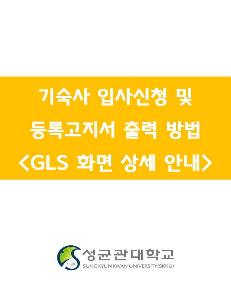 기숙사 입사신청 및 등록고지서 출력 방법 <GLS 화면 상세 안내> ■ GLS 접속 1. 본교 대표 홈페이지(https://www.skku.edu) → ‘킹고ID로그인 2. 상단 메뉴 중 ‘GLS’ 선택 FAQ 신입생입니다. 아직 킹고ID가 없어요. 합격생은 입학금/등록금을 납부한 뒤 본교 홈페이지- 킹고ID로그인에서 ‘성균인 가입’을 먼저 해야 합니다. 자세한 내용은 합격자 안내문을 참고하시고, 관련 문의는 입학팀 또는 소속대학 행정실로 하십시오. FAQ 대학원생인데, ‘GLS’가 보이지 않아요. ▼좌측 상단, 학교 로고 옆 목록에서 ‘학생포털’로 변경하세요. ■ 입사신청서 작성 방법 ● 1단계: 신청할 기숙사 모집 단위 선택 1. 신청/자격관리 → 기숙사 → 기숙사신청(정규입사) 선택 또는 좌측상단 ‘메뉴검색’ 창에 “기숙사“ 검색하여 선택 가능 2. 본인이 신청하고자 하는 캠퍼스 또는 입사기간(방학만 해당)을 확인하여 [신청 서작성] 클릭 * 기숙사 신청이 가능한 기간에만 신청 가능한 기숙사 및 일정이 나타나며, 신청기간이 아닐 경우 목록에 신청서가 보이지 않습니다. FAQ 메뉴에서 ‘기숙사신청’을 찾을 수가 없어요. 본교 학부/석사 등을 졸업한 뒤 석사/박사과정으로 진학하여 새로운 학번을 부여 받은 경우, 로그인을 했을 때 기존 학번에 해당하는 정보로 보일 수 있습니 다. 이 때에는 GLS 우측 상단에 학번과 학과가 표시되는 곳을 클릭하여 학번 을 변경하십시오. 위 사례에 해당하지 않음에도 기숙사 메뉴에서 ‘거주사실증명발급’, ‘퇴사확인 서 제출’만 보인다면 수료/졸업 등의 사유로 기숙사 신청 자격에 해당하지 않는 학생입니다. 이러한 경우에는 기숙사 신청을 할 수 없습니다. ■ 입사신청서 작성 방법 ● 2단계: 본인 정보 확인 및 입력 [입력/수정 해야 할 정보] 1. 개인정보: 학생연락처/ 보호자연락처/ 주소 등을 확인하고 입력 2. 환불정보: 중도퇴사 또는 만기퇴사 보증금 환불을 받을 계좌정보 입력 [확인용 정보] 1. 직전학기 성적: 입사생 선발에 반영되는 성적 2. 결핵검진 년월: 입사 당일 결핵검진 결과서 제출 필수 및 면제 여부를 결정짓는 확인용 정보(입사 종합안내문에 명시된 면제 기준에 부합하는지 확인할 것, 개 별검진과 교내검진 모두 빈칸일 경우 입사 당일 결핵검진 결과서 필수 제출 대 상) 3. 벌점 및 입사제한 정보: 돔메이트 신청, 동점자 선발 기준에 활용되는 정보. 벌 점으로 인하여 입사제한을 받은 경우 입사제한 연도 및 학기가 표기되며 입사신 청은 가능하나 선발에서 제외(불합격) 처리됨 *직전학기 벌점에 대한 오류가 있을 경우, 입사신청이 마감되기 전 기숙사행정실 업무시간에 전화 문의하 여 수정 가능 (입사신청 기간 종료 이후에는 수정 불가) FAQ ‘입학시주소’ 또는 ‘현거주지’가 선발에 영향을 주나요? 아니오. 우리 기숙사에서는 주소(거리)를 선발에 반영하지 않습니다. FAQ 직전학기 벌점을 받은 내용에 대해 상세히 알고 싶어요. 기숙사정보조회 메뉴에서 가장 최근 입사한 학기를 선택하고 “벌점내역“ 탭을 선택하면 그 동안 받은 벌점 항목을 모두 확인할 수 있습니다. 벌점 부과내역은 학기에 상관없이 모 두 누적되어 보이지만, 실제로 선발에 반영되는 벌점정보는 입사신청 화면에 나타나는 벌 점만 반영됩니다. ■ 입사신청서 작성 방법 ● 3단계: 기숙사 및 입사일 선택 ① ④ ③ ② 1. 희망 입사일 선택: 입사 가능한 날짜 중 하루를 선택 (입사신청기간 종료 후 변경 불가하므로 신중하게 선택) 2. 희망 기숙사 선택: 좌측에는 본인이 선택할 수 있는 기숙사 목록이 나타나며, 원 하는 기숙사를 선택하고 [>]버튼을 눌러 우측으로 이동 *좌측에 있는 기숙사 목록 중 1개 이상을 희망 기숙사로 반드시 이동 3. 희망기숙사 지망 순위 변경: 원하는 기숙사를 1지망부터 순서대로 나열할 수 있 으며, 위아래 순위를 조정 가능 4. 기숙사비 예측: 선택한 입사일, 1지망에 선택된 기숙사를 기준으로 기숙사비가 얼마인지 미리 확인 (1지망 기숙사를 변경하면 금액도 변경) FAQ 입사일로 선택할 수 있는 날짜가 정해져 있나요? 사생모집 공고(입사 종합안내문)에 명시되어 있는 조기/정규입사일 중에서만 선택 가능하 도록 되어 있습니다. 희망입사일 이후(선택한 입사일보다 더 늦은 날짜)에 입사하는 것은 가능하나, 더 일찍 입사하는 것은 불가하므로 신중하게 선택하십시오. FAQ 희망 기숙사는 몇 개를 선택해야 하나요? 1개 이상을 선택할 수 있고, 좌측에 보이는 기숙사 모두를 희망기숙사로 선택할 수 있습니 다. 1지망 기숙사에 탈락할 경우 2지망에 입력한 기숙사에 정원이 미달되었다면 이를 활용 해 선발을 합니다. 따라서 본인이 희망 기숙사를 1개만 입력했다면 2지망 기준 선발을 할 때 불리하게 적용됩니다. ■ 입사신청서 작성 방법 ● 4단계: 식수(식권 수량) 선택 1. 식수 신청: 학기 중 이용할 식권 수량을 선택 (선택사항에 따라 납부해야 할 식비 총액이 계산되어 보임) 2. 식당 이용 규정 및 유의사항을 읽고 동의에 체크 FAQ 식수선택을 ‘없음’을 선택하면, 기숙사 식당 이용이 불가한가요? 이는 할인 금액이 적용된 식권 이용이 불가한 것일 뿐이며, 배식대 앞에서 카드 결제 또는 