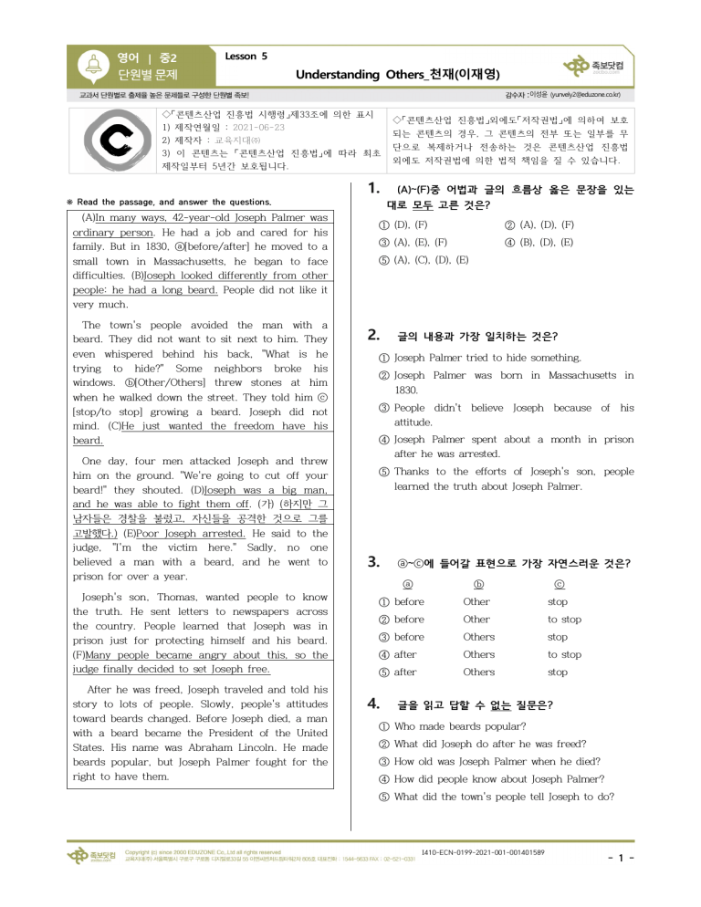 영어 중2 Lesson 5 Understanding Others_천재(이재영) 이성윤 (yunvely2@eduzone.co.kr) ◇「콘텐츠산업 진흥법 시행령」제33조에 의한 표시 ◇「콘텐츠산업 진흥법」외에도「저작권법」에 의하여 보호 1) 제작연월일 : 2021-06-23 2) 제작자 : 교육지대㈜ 되는 콘텐츠의 경우, 그 콘텐츠의 전부 또는 일부를 무 단으로 복제하거나 전송하는 것은 콘텐츠산업 진흥법 3) 이 콘텐츠는 「콘텐츠산업 진흥법」에 따라 최초 외에도 저작권법에 의한 법적 책임을 질 수 있습니다. 제작일부터 5년간 보호됩니다. ※ Read the passage, and answer the questions. 1. One day, four men attacked Joseph and threw him on the ground. "We're going to cut off your beard!" they shouted. (D)Joseph was a big man, and he was able to fight them off. (가) (하지만 그 남자들은 경찰을 불렀고, 자신들을 공격한 것으로 그를 고발했다.) (E)Poor Joseph arrested. He said to the judge, "I'm the victim here." Sadly, no one believed a man with a beard, and he went to prison for over a year. (D), (F) (A), (D), (F) (A), (E), (F) (B), (D), (E) (A), (C), (D), (E) 2. zb2 ) 글의 내용과 가장 일치하는 것은? Joseph Palmer tried to hide something. Joseph Palmer was born in Massachusetts in 1830. People didn't believe Joseph because of his attitude. Joseph Palmer spent about a month in prison after he was arrested. Thanks to the efforts of Joseph's son, people learned the truth about Joseph Palmer. 3. zb3 ) Joseph's son, Thomas, wanted people to know the truth. He sent letters to newspapers across the country. People learned that Joseph was in prison just for protecting himself and his beard. (F)Many people became angry about this, so the judge finally decided to set Joseph free. After he was freed, Joseph traveled and told his story to lots of people. Slowly, people's attitudes toward beards changed. Before Joseph died, a man with a beard became the President of the United States. His name was Abraham Lincoln. He made beards popular, but Joseph Palmer fought for the right to have them. (A)~(F)중 어법과 글의 흐름상 옳은 문장을 있는 대로 모두 고른 것은? (A)In many ways, 42-year-old Joseph Palmer was ordinary person. He had a job and cared for his family. But in 1830, ⓐ[before/after] he moved to a small town in Massachusetts, he began to face difficulties. (B)Joseph looked differently from other people: he had a long beard. People did not like it very much. The town's people avoided the man with a beard. They did not want to sit next to him. They even whispered behind his back, "What is he trying to hide?" Some neighbors broke his windows. ⓑ[Other/Others] threw stones at him when he walked down the street. They told him ⓒ [stop/to stop] growing a beard. Joseph did not mind. (C)He just wanted the freedom have his beard. zb1 ) 4. zb4 ) ⓐ~ⓒ에 들어갈 표현으로 가장 자연스러운 것은? ⓐ ⓑ ⓒ before Other stop before Other to stop before Others stop after Others to stop after Others stop 글을 읽고 답할 수 없는 질문은? Who made beards popular? What did Joseph do after he was freed? How old was Joseph Palmer when he died? How did people know about Joseph Palmer? What did the town's people tell Joseph to do? I410-ECN-0199-2021-001-001401589 - 1 - Lesson 5.Understanding Others_천재(이재영) 2021년 2학기 중간고사 대비 5. zb5 ) 주어진 단어를 모두 사용하여 밑줄 친 (가)의 의 7. zb7 ) 미를 가지는 문장을 완성하시오. (단, 필요하면 단어 를 추가하거나 형태를 변형하시오.) But, call, accuse, attack 윗 문장의 빈칸 (나)에 들어갈 알맞은 말은? go with back next talk (가) 하지만 그 남자들은 경찰을 불렀고, 자신들을 공격한 것으로 그를 고발했다. → _________________________________________ 8. zb8 ) In many ways, 42-year-old Joseph Palmer was an ordinary person. He had a job and (가)cared for his family. But in 1830, after he moved to a small town in Massachusetts, he began to face difficulties. Joseph looked different from other people: he had a long beard. People did not like it very much. 9. zb9 ) Another Some The others (다)_________ neighbors broke his windows. Others threw stones at him when he walked down the street. They told him to stop (라)grow a beard. Joseph did not mind. He just wanted the freedom (마)to have his beard. One day, four men attacked Joseph and threw him on the ground. "We're going to cut off your beard!" they shouted. Joseph was a big man, and he was able to fight them (바)off. But the men called the police and accused him of attacking them. Poor Joseph was arrested. He said to the judge, "I'm the victim here." Sadly, no one believed a man with a beard, and he went to prison for over a year. 윗 문장의 밑줄 친 (라) 단어를 문맥의 의미에 맞 게 고치면? The town's people avoided the man with a beard. They did not want to sit (나)________ to him. They even whispered behind his back, "What is he trying to hide?" zb6 ) After Sadly ※ 문제를 잘 읽고 물음에 답하시오 6. 위 문장의 빈칸 (다)에 들어갈 알맞은 말은? grow growing to grow grew grown up 10. 위 문장의 밑줄 친 (마)와 용법이 같은 것은? zb1 0 ) I was disappointed to see the empty box. I have some pictures to show you. I changed clothes to go jogging. She promised to be on time. His dream is to travel around the world. 11. 윗글을 읽고 답을 알 수 없는 질문을 고르시오. zb1 1 ) 윗 문장의 밑줄 친 (가)와 의미가 같은 것은? What was unusual appearance? took for took care of What did the town's people tell Joseph to do? look for same after Who called the police? looked at it about Joseph Palmer's Why did the town's people avoid Joseph Palmer? Why did Joseph Palmer want to have a beard? I410-ECN-0199-2021-001-001401589 - 2 - Lesson 5.Understanding Others_천