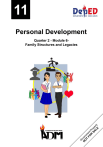 Personal Development-Grade 11 Alternative Delivery Mode Quarter 2- Module 6: Family Structure and Legacy First Edition 2020 Republic Act 8293. Section 176 states that: No copyright shall subsist in any work of the Government of the Philippines. However, prior approval of the government agency or office wherein the work is created shall be necessary for exploitation of such work for profit. Such agency or office may, among other things, impose as a condition the payment of royalties. Borrowed materials (i.e., songs, stories, poems, pictures, photos, brand names, trademarks, etc.) included in this learning resource are owned by their respective copyright holders. DepEd is represented by the Filipinas Copyright Licensing Society (FILCOLS), Inc. in seeking permission to use these materials from their respective copyright owners. All means have been exhausted in seeking permission to use these materials. The publisher and authors do not represent nor claim ownership over them Development Team of the Module: Author: Reviewers: llustrator: Lorna V. Rigor Amor Malayang Ferdinand Richard Villa Lorna V. Rigor Amor Malayang Lucille N. Quiriado Jay Michael A. Calipusan Management Team: Chairperson: Co-Chairpersons: Members: Dr. Arturo B. Bayocot, CESO III Regional Director Dr. Victor G. De Gracia Jr., CESO V Asst. Regional Director Mala Epra B. Magnaong CES, CLMD Dr. Bienvenido U. Tagolimot, Jr. Regional ADM Coordinator Printed in the Philippines by: Department of Education – Regional Office 10 Office Address: Zone 1, Upper Balulang Cagayan de Oro City 9000 Telefax: (088) 880-7071, (088) 880-7072 E-mail Address: region10@deped.gov.ph 11 PERSONAL DEVELOPMENT Quarter 2 - MODULE 6Family Structures and Legacies This learning resource was collaboratively developed and reviewed by educators from public and private schools, colleges, and/or universities. We encourage teachers and other education stakeholders to email their feedback, comments, and recommendations to the Department of Education at action@deped.gov.ph. We value your feedback and recommendations. Department of Education. Republic of the Philippines iii Table of Contents Cover Page Copy Right Page Module Title Page i ii iii Module 6. Family Structures and Legacies What I need to Know What I know What’s In What’s New Activity 1. Family is Love What is It Activity2. All About My Family Readings: What makes a Family…Family? Activity 3. Where Do I Belong What’s More Reading: A Love for Fellowmen and Family Activity 4. Roots of My Existence What I have Learned Activity 5. Remind Me Activity 6. Family is Forever Assessment Additional Activities Activity 7. I am a Poet References 1 1 2 4 4 4 5 5 6 7 7 7 8 9 9 10 11 12 12 13 iv 6 Family Structure and Legacies What I Need to Know For the Learner Congratulations! You are now in module 6. This basically means that you have underwent and understood the previous modules that helped you know more about yourself, thus shaping your personality. In this module, you will gain understanding on your family values, traditions, beliefs, and attitudes that are handed down from generation to generation by appraising them. Subsequently, being aware of your roots can help you decide which traits and attitudes you cherish and which you want to make a conscious effort to change. Moreover, at the end of the lesson you are expected to: 1. appraise one’s family structure and the type of care he/she gives and receives, which may help in understanding himself/herself better; EsP-PD11/12FSL-IId-11.1 2. make a genogram and trace certain physical, personality, or behavioral attributes through generation; and EsP-PD11/12FSL-IId-e-11.2 3. prepare a plan on how to make the family members firmer and gentler with each other. EsP-PD11/12FSL-IIe-11.3 For the Facilitator This material is used for independent learning and is consist of one (1) lesson. Your student’s success depends on how you lead and supervise the process of working on this module. The independent learner is given activities to work on even without your presence. But, it is important to realize that not one thing fits all. This material provides only the framework for support learning. As a facilitator, with the chance to meet the independent learner, your guidance and supervision matters. Thank you for guiding the learner on this module and helping him/her develop holistically. 1 What I Know Directions: There are 10 items in this test. Carefully read each item and answer the question diligently. Write the letter of the correct answer on your journal notebook. 1. The Bureau of Census defines it as “two or more persons who are related by birth, marriage or adoption and who live together as one household.” A. Best Friend B. Family C. Friends D. Partnership 2. It is a family consisting of parents and children, along with grandparents, grandchildren, Aunt’s or uncles, cousins, etc. A. Nuclear Family C. Single Parent Family B. Extended Family D. Step Family 3. Which of the following refers to two families who are brought together due to divorce, separation, and remarriage? A. Extended Family C. Single Parent Family B. Nuclear Family D. Step Family 4. This can be either a father or a mother who is responsible for the raising of a child. A. Extended Family C. Single Parent Family B. Nuclear Family D. Step Family 5. What is the other term for GENOGRAM? A. Apple Tree C. Drawing B. Chart D. Family Tree 6. Which of the following phrases is the best description of the parents’ roles in the family? A. teach, discipline, and provide for their children B. ask, control, and reserve for their children C. take charge on the lives of the children especially on the decision making D. cooperate with the children at all times 7. With which of the statement is associated to the role of the children in the family? A. Provide resources B. Heads the decision making C. Helps on the chores or any duties capable of doing and loving D. Looks at the welfare of the whole family 2 