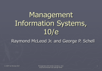Management Information Systems, 10/e Raymond McLeod Jr. and George P. Schell © 2007 by Prentice Hall Management Information Systems, 10/e Raymond McLeod and George Schell 1 Chapter 8 Information in Action © 2007 by Prentice Hall Management Information Systems, 10/e Raymond McLeod and George Schell 2 Learning Objectives ► Know that a firm’s ability to develop effective information systems can be a key factor in its success. ► Recognize that the transaction processing system processes describes the firm’s basic daily operations. ► Be familiar with the processes performed by a transaction processing system for a distribution firm. ► Recognize that organizational information systems have been developed for business areas and organizational levels. ► Be familiar with architectures of marketing, human resources, manufacturing, and financial information systems. © 2007 by Prentice Hall Management Information Systems, 10/e Raymond McLeod and George Schell 3 Learning Objectives (Cont’d) ► Know the architecture of an executive information system. ► Understand what customer relationship management is and why it requires a large computer storage capability. ► Recognize how a data warehouse differs from a database. ► Understand the architecture of a data warehouse system. ► Know how data are stored in a data warehouse data repository. ► Know how a user navigates through the data repository. ► Know what on-line analytical processing (OLAP) is. ► Know the two basic ways to engage in data mining. © 2007 by Prentice Hall Management Information Systems, 10/e Raymond McLeod and George Schell 4 Information as a Critical Success Factor ► Critical success factor (CSF) was coined by Ronald Daniel to identify a few key activities that spell success or failure for any type of organization. ► Transaction processing system (TPS) is the information system that gathers data describing the firm’s activities, transforms the data into information, and makes the information available to users both inside and outside the firm. 1st business application to be installed on computers. ► Also electronic data processing (EDP) system and accounting information system. © 2007 by Prentice Hall Management Information Systems, 10/e Raymond McLeod and George Schell 5 Figure 8.1 A Model of a Transaction Processing System © 2007 by Prentice Hall Management Information Systems, 10/e Raymond McLeod and George Schell 6 System Overview ► Distribution system is a TPS used by distribution firms. ► Distribution firms distribute products or services to their customers. ► We will use data flow diagrams, or DFDs, to document the system. ► Figure 8.2 represents the highest level. ► Figure 8.3 identifies the three major subsystems. © 2007 by Prentice Hall Management Information Systems, 10/e Raymond McLeod and George Schell 7 Figure 8.2 A Context Diagram of Distribution System © 2007 by Prentice Hall Management Information Systems, 10/e Raymond McLeod and George Schell 8 Figure 8.3 A Figure 0 Diagram of the Distribution System © 2007 by Prentice Hall Management Information Systems, 10/e Raymond McLeod and George Schell 9 Major Subsystems of Distribution System ► Systems that fill customer orders. Order entry system enters customer orders into the system. Inventory system maintains the inventory records. Billing system prepares the customer invoices. Accounts receivable system collects the money from the customers. ► Systems that order replenishment stock. Purchasing system issues purchase orders to suppliers for needed stock. Receiving system receives the stock. Accounts payable system makes payments. © 2007 by Prentice Hall Management Information Systems, 10/e Raymond McLeod and George Schell 10 Figure 8.4 A Figure 1 Diagram of the System that Fills Customers Orders © 2007 by Prentice Hall Management Information Systems, 10/e Raymond McLeod and George Schell 11 Figure 8.5 A Figure 2 Diagram of Systems That Order Replenishment Stock © 2007 by Prentice Hall Management Information Systems, 10/e Raymond McLeod and George Schell 12 Major Subsystems of Distribution System (Cont’d) ► Systems that perform general ledger processes. General ledger system is the accounting system that combines data from other accounting systems for the purpose of presenting a composite financial picture of the firm’s operations. General ledger is the file that contains the combined accounting data. Updated general ledger system posts records that describe various actions and transactions to the general ledger. Prepare management reports system uses the contents of the general ledger to prepare the balance sheet, income statement, and other reports. © 2007 by Prentice Hall Management Information Systems, 10/e Raymond McLeod and George Schell 13 Figure 8.6 A Figure 3 Diagram of the Systems that Perform General Ledger Processes © 2007 by Prentice Hall Management Information Systems, 10/e Raymond McLeod and George Schell 14 Organizational Information Systems ► Organizational information systems are developed to meet the needs for information relating to those particular parts of the organization. ► Marketing information system (MKIS) provides information that relates to the firm’s marketing activities. Consists of a combination of input and output subsystems connected by a database. © 2007 by Prentice Hall Management Information Systems, 10/e Raymond McLeod and George Schell 15 Figure 8.7 A Model of Marketing Information System © 2007 by Prentice Hall Management Information Systems, 10/e Raymond McLeod and George Schell 16 Marketing Information System ► Output subsystems provide information about critical elements in marketing mix. ► Marketing mix consists of four main ingredients that management manages in order to meet customers’ needs at a profit. Product subsystem provides information about the firm’s products. Place subsystem provides information about the firm’s distribution netwo