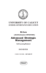UNIVERSITY OF CALICUT SCHOOL OF DISTANCE EDUCATION M.Com (2020Admission ONWARDS) Advanced Strategic Management Self-Learning Material II SEMESTER CORE COURSE - MCM2C07 190607 2 Advanced Strategic Management STUDY MATERIAL I I SEMESTER CORE COURSE - MCM2C07 M.Com (2020Admission ONWARDS) UNIVERSITY OF CALICUT SCHOOL OF DISTANCE EDUCATION Calicut University- PO, Malappuram, Kerala, India - 673 635 3 UNIVERSITY OF CALICUT SCHOOL OF DISTANCE EDUCATION STUDY MATERIAL SECOND SEMESTER M.Com (2020Admission ONWARDS) Advanced Strategic Management CORE COURSE - MCM2C07 Prepared by : Praveen M V Assistant Professor of Commerce Post Graduate and Research Department of Commerce Govt. College Madappally Scrutinized by: Dr.M.A Joseph, Professor & Head, Commerce and Management Studies, University of Calicut. 4 CONTENTS Module I II III IV Title Page No. An Introduction to Strategic Management 7 Environmental Analysis and Competition Strategies 42 Tools of Strategic/ Competitive Analysis 54 Competitive Advantage and Core competency 70 V Emerging Trends in VI Strategic Management Competitive Environment Analysis 108 VII Grand Strategies 128 VIII Strategy Formulation and IX Implementation Strategy Evaluation and Control 5 84 141 163 6 Unit 1 An Introduction to Strategic Management Introduction The term “Strategic management” is criticalto staying competitive and standing out in a crowded, globalised, consumer oriented and cost-conscious business environment. A good strategy helps management prioritize activities within the company and how resources get spent. It is a systematic way to execute a company’s initiatives and goals under the guidance of its leadership.TheStrategic management isn’t all theoretical; it is a practical way to implement a company’s decisions, vision and goals.Strategic management is the management of an organization’s resources to achieve its goals and objectives. It involves setting objectives, analysing the competitive environment, analysing the internal organization, evaluating strategies and ensuring that management rolls out the strategies across the organization. Strategic management is not static in nature; the models often include a feedback loop to monitor execution and to inform the next round of planning. Strategy The word “strategy” is derived from the Greek word “strategos”; stratus (meaning army) and “ago” (meaning leading/ moving). Strategy is an action that managers take to attain one or more of the organization’s goals. Strategy can also be defined as “A general direction set for the company and its various components to achieve a desired state in the future. Strategy results from the detailed strategic planning process”. A strategy is all about integrating organizational activities and 7 utilizing and allocating the scarce resources within the organizational environment so as to meet the present objectives. While planning a strategy it is essential to consider that decisions are not taken in a vacuum and that any act taken by a firm is likely to be met by a reaction from those affected, competitors, customers, employees or suppliers. Strategy can also be defined as knowledge of the goals, the uncertainty of events and the need to take into consideration the likely or actual behaviour of others. Strategy is the blueprint of decisions in an organization that shows its objectives and goals, reduces the key policies, and plans for achieving these goals, and defines the business the company is to carry on, the type of economic and human organization it wants to be, and the contribution it plans to make to its shareholders, customers and society at large. Features of Strategy 1. Strategy is Significant because it is not possible to foresee the future. Without a perfect foresight, the firms must be ready to deal with the uncertain events which constitute the business environment. 2. Strategy deals with long term developments rather than routine operations, i.e. it deals with probability of innovations or new products, new methods of productions, or new markets to be developed in future. 3. Strategy is created to take into account the probable behaviour of customers and competitors. Strategies dealing with employees will predict the employee behaviour. Strategy is a well-defined roadmap of an organization. It defines the overall mission, vision and direction of an organization. The objective of a strategy is to maximize an organization’s 8 strengths and to minimize the strengths of the competitors.Strategy, in short, bridges the gap between “where we are” and “where we want to be”. Strategic Management Strategic Management is all about identification and description of the strategies that managers can carry so as to achieve better performance and a competitive advantage for their organization. An organization is said to have competitive advantage if its profitability is higher than the average profitability for all companies in its industry. Strategic management can also be defined as a bundle of decisions and acts which a manager undertakes and which decides the result of the firm’s performance. The manager must have a thorough knowledge and analysis of the general and competitive organizational environment so as to take right decisions. Strategic management is nothing but planning for both predictable as well as unfeasible contingencies. It is applicable to both small as well as large organizations as even the smallest organization face competition and, by formulating and implementing appropriate strategies, they can attain sustainable competitive advantage. Simply, Strategic management can be defined as a process which involves setting objectives, analysing the competitive environment, analysing the internal organization, evaluating strategies, and ensuring that management rolls out the strategies across the organization. Definitions 1. “Strategic management is concerned with the determination of the basic long-term goals and the 