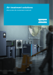 Air treatment solutions Aftercoolers & condensate treatment RELIABLE AND CLEAN AIR Atlas Copco aftercoolers and condensate treatment The air that leaves a compressor reaches 100% humidity. It also contains oil (unless you are using an oil-free compressor) and solid particles. Together, they form an abrasive, often acidic, oily sludge. Without air treatment, this murky mix will enter your compressed air system, corroding pipe work, damaging pneumatic tools and potentially compromising final products. AIR TREATMENT Atlas Copco offers a wide range of aftercoolers, drains and condensate treatment solutions, extending our premium quality throughout your compressed air system. REMOVE WATER AFTERCOOLERS All Atlas Copco compressors are equipped with an aftercooler. It cools the air, turning up to 70% of the humidity into water, which is then immediately drained. However, production facilities with extremely high ambient temperatures might need additional cooling. Atlas Copco’s add-on aftercoolers prevent excess moisture from entering your compressed air system. DRAINS The remaining humidity in compressed air turns into water as the air cools while it moves through the system. Because water causes corrosion and damage, drains must be installed throughout your network. Atlas Copco has a range of drains, automatic or electronic, that will keep your aftercooler, dryer, air receiver, and other equipment working optimally. REMOVE OIL CONDENSATE TREATMENT Because oil poses an environmental risk, compressed air condensate must be treated appropriately. Atlas Copco’s condensate management solutions separate and safely dispose of the oil in compressed air before it enters the system. 2 - Atlas Copco aftercoolers & condensate treatment Atlas Copco aftercoolers & condensate treatment - 3 REMOVE WATER AFTERCOOLERS HD AND TD AFTERCOOLERS HD WATER-COOLED AFTERCOOLER Atlas Copco’s air and water-cooled aftercoolers provide additional moisture management in facilities with extremely high ambient temperatures. Supplied with all necessary parts, they are compact, simple to install and easy to disassemble for cleaning. * • Efficiency - Special, highly efficient separation by cyclone results in low pressure drop and energy use. • Minimal installation & maintenance Easy assembly of connection flanges. • Reliability - Totally rustproof materials ensure a long lifetime. Maximum working pressure ∆t above cooling water * l/s cfm bar(e) psi °C °F l/s m3/h US gal/min HD 250 180 380 20 290 12 21 0.4 1.44 6.3 HD 650 530 1120 10.5 150 11 20 1.3 4.68 21 HD 1500 1500 3180 16 230 4 7 3.9 14.0 62 HD 3500 3500 7420 16 230 4 7 8.5 30.6 134 WATER-COOLED HD AFTERCOOLERS Water consumption HD water-cooled aftercooler. Type Our HD and TD aftercoolers combine minimal pressure drop with high cooling efficiency and low energy consumption. A negligible pressure drop means no production power is lost. The compressor doesn’t generate extra demand, eliminating additional energy or maintenance costs. YOUR BENEFITS: Nominal flow * Type Dimensions Air inlet / outlet connections Ø inlet outlet Height mm Width inch mm Cooling water Weight Length inch mm inch kg lbs inlet outlet G½ HD 250 G 2½ G 2½ 1975 77.7 230 9.0 483 19.0 140 308 HD 650 DN 100 DN 100 2083 82.0 500 19.7 635 25.0 210 463 G1 HD 1500 DN 150 DN 150 840 33.0 1574 62.0 925 36.4 710 1565 DN 80 HD 3500 DN 200 DN 200 828 33.0 1574 62.0 925 36.4 715 1576 DN 80 TD AIR-COOLED AFTERCOOLER Atlas Copco’s HD water-cooled aftercoolers deliver high effectiveness with low water consumption. Their built-in bundle of stainless steel tubes reduces the temperature of the air leaving the compressor. The cooling water and the compressed air flow in opposite directions. The cooler is equipped with a water drain as standard. * Maximum working pressure Nominal flow * Type ∆t above * ambient temperature Fan motor power l/s cfm bar(e) psi °C °F kW hp TD 08 8 17 20 290 10 18 0.05 0.07 TD 25 25 53 20 290 10 18 0.12 0.16 TD 50 50 106 20 290 10 18 0.18 0.24 TD 150 150 318 20 290 10 18 0.75 1.01 TD 300 300 363 20 290 10 18 0.75 1.01 TD 650 650 1377 20 290 10 18 2.20 2.95 TD 650 650 1377 10.5 152 10 18 2.20 2.95 Refers to absolute pressure of 1 bar and temperature of 20 °C. Compressed air in at 160 °C. AIR-COOLED TD AFTERCOOLERS Atlas Copco’s TD air-cooled aftercoolers have an aluminum block element. An electrically driven fan, shielded by a protector for user safety, forces air between the cooling fins to ensure high efficiency and low energy use. The aftercooler is mounted on a sturdy frame and has a builtin water drain. 4 - Atlas Copco aftercoolers & condensate treatment v Dimensions Air inlet / outlet connections Ø Height inlet outlet mm inch mm TD 08 G½ G½ TD 25 G1 G1 188 7.4 658 25.9 TD 50 G 1¼ G 1¼ 735 TD 150 G 2½ G 2½ TD 300 G 2½ TD 650 DN 80 N° of cooler cores Weight Width Length inch mm inch kg lbs 130 5.1 270 402 15.8 588 10.6 6 13 1 23.1 19 42 28.9 412 16.2 1 664 26.1 23 51 1160 45.6 435 1 17.1 920 36.2 53 117 G 2½ 1280 50.3 1 466 18.3 1140 44.8 73 161 DN 100 1525 60.0 1 716 28.1 1780 70.0 185 408 1 Atlas Copco aftercoolers & condensate treatment - 5 REMOVE WATER WATER SEPARATORS TWD TIMER DRAIN WSD WATER SEPARATORS The TWD timer drain removes condensate using a solenoid valve in combination with an electronic timer. Pre-selecting the timing and length of each drain cycle minimizes compressed air loss. Compact, easy to install and fully automatic, the TWD is a costeffective drain solution for compressed air filters and vessels. Atlas Copco’s WSD prevents condensed water from building up in your air system. The water separator comes as standard with Atlas Copco’s aftercoolers and can also be installed at any point in your system. Made entirely of rustproof material, these cyclone-based separators remove water aerosols to protect system components such as dryers and filters. Maintenance-free and without moving parts, they come with an automatic or a manual drain
