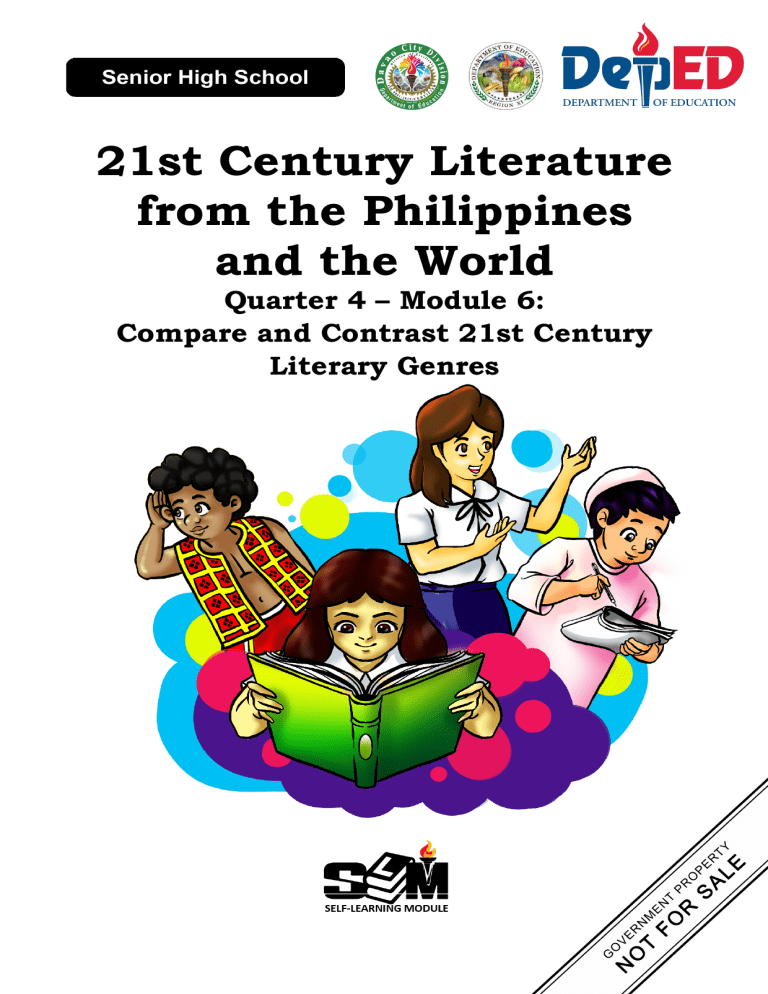 21st Century Literature from the Philippines and the World Quarter 4 – Module 6: Compare and Contrast 21st Century Literary Genres 21st Century from the Philippines and the World Quarter 4 – Module 6: Compare and Contrast 21st Century Literary Genres First Edition, 2020 Republic Act 8293, section 176 states that: No copyright shall subsist in any work of the Government of the Philippines. However, prior approval of the government agency or office wherein the work is created shall be necessary for exploitation of such work for profit. Such agency or office may, among other things, impose as a condition the payment of royalties. Borrowed materials (i.e., songs, stories, poems, pictures, photos, brand names, trademarks, etc.) included in this module are owned by their respective copyright holders. Every effort has been exerted to locate and seek permission to use these materials from their respective copyright owners. The publisher and authors do not represent nor claim ownership over them. Published by the Department of Education Development Team of the Module Writer: Daisy M. Corpuz Editor: Reviewer: Divilyn M. Rodriguez Illustrator: Karess Junnamae B. Lucena Layout Artist: Wedzmer B. Munjilul Template Developer: Neil Edward D. Diaz Management Team: Reynaldo M. Guillena Jinky B. Firman Marilyn V. Deduyo Alma C. Cifra May Ann M. Jumuad Aris B. Juanillo Printed in the Philippines by: Davao City Division Learning Resources Management Development System (LRMDS) Department of Education – Division of Davao City Office Address: Telephone: E-mail Address: E. Quirino Avenue, Davao City (082) 227 4762 lrms.davaocity@deped.gov.ph 21st Century Literature from the Philippines and the World Quarter 4 – Module 6: Compare and Contrast 21st Century Literary Genres Introductory Message For the facilitator: As a facilitator, you are expected to orient the learners on how to use this module. You also need to keep track of the learners' progress while allowing them to manage their own learning at home. Furthermore, you are expected to encourage and assist the learners as they do the tasks included in the module. For the learner: As a learner, you must learn to become responsible of your own learning. Take time to read, understand, and perform the different activities in the module. As you go through the different activities of this module be reminded of the following: 1. Use the module with care. Do not put unnecessary mark/s on any part of the module. Use a separate sheet of paper in answering the exercises. 2. Don’t forget to answer Let Us Try before moving on to the other activities. 3. Read the instructions carefully before doing each task. 4. Observe honesty and integrity in doing the tasks and checking your answers. 5. Finish the task at hand before proceeding to the next. 6. Return this module to your teacher/facilitator once you are done. If you encounter any difficulty in answering the tasks in this module, do not hesitate to consult your teacher or facilitator. Always bear in mind that you are not alone. We hope that through this material, you will experience meaningful learning and gain deep understanding of the relevant competencies. You can do it! ii Let Us Learn Literature is a reflection not only of the authors’ life experiences but as well as their rich cultures and practices. This lesson will discuss the types of literary genres across the globe. Learning Competency: • Compare and contrast the various 21st century literary genres and their elements, structures, and traditions from across the globe (EN12Lit-IId25) After going through this module, you are expected to: • compare and contrast the various 21st century literary genres, and its elements, structures, and traditions from across the globe. Let Us Try Directions: Read the following questions carefully. Write the letter of the correct answer on a separate sheet of paper. 1. Which is a literary work of imaginative narration fashioned to entertain and make the readers think and more so, to feel? a. arts c. literature b. fiction d. fiction 2. Which is a literary work based on history and facts and which main thrust is intellectual appeal? a. anthology c. fiction b. drama d. nonfiction 3. Which is written in the common flow of language in sentences and paragraphs to give information, relate events, express ideas or present opinions? a. poetry c. prose b. point of view d. soliloquy 4. Which is expressed in verse, measure, rhythm, sound, and imaginative language? a. essay c. poetry b. music d. prose 5. Which is NOT a genre of literature? a. arts c. diction b. drama d. fiction 1 6. Which is NOT an example of prose? a. anecdotes c. epic b. biography d. legend 7. Which is NOT an example of poetry? a. ballad c. oration b. idylls d. textual 8. Which element of poetry refers to the regular rise and fall of word stress? a. meter c. rhythm b. rhyme d. verse 9. Which element of poetry refers to how the poet speaks usually from simplicity to eloquence? a. artistry c. mood b. diction d. tone 10. Which type of poetry is written in verse without meter and rhyme a. blank verse c. refrain b. free verse d. stanza 11. Which presents peculiar ways on how man sees life as evidenced by the formation of his ideas, forms, structures, and expressions which marked by their memorable substance? a. artistry c. symbol b. mood d. style 12. Which refers to the significant truth about life, its realization, reflection or lesson that the readers may extract from the work? a. structure c. theme b. symbol d. tone 13. Which is a reference in a work of literature to another work of literature, or to a well-known person, place or event outside of literature? a. allusion c. apostrophe b. antonomasia d. assonance 14. Which of the following is a recount of the life of a person that is generally chronological? a. autobiography c. diary b. biography d. memoir 15. Which refers to a written account of an event, a season of life that is generally personal, evocative and 