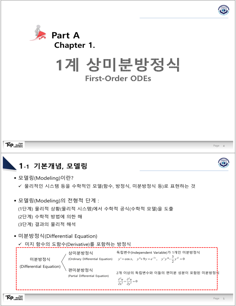Part A Chapter 1. Page 4 1-1 기본개념, 모델링 모델링(Modeling)이란? 물리적인 시스템 등을 수학적인 모델(함수, 방정식, 미분방정식 등)로 표현하는 것 모델링(Modeling)의 전형적 단계 : (1단계) 물리적 상황(물리적 시스템)에서 수학적 공식(수학적 모델)을 도출 (2단계) 수학적 방법에 의한 해 (3단계) 결과의 물리적 해석 미분방정식(Differential Equation) 미지 함수의 도함수(Derivative)를 포함하는 방정식 상미분방정식 미분방정식 (Differential Equation) (Ordinary Differential Equation) 편미분방정식 (Partial Differential Equation) 독립변수(Independent Variable)가 1개인 미분방정식 3 y ' = cos x, y ''+ 9 y = e −2 x , y ' y '''− y '2 = 0 2 2개 이상의 독립변수와 이들의 편미분 성분이 포함된 미분방정식 ∂ 2u ∂ 2u + =0 ∂x 2 ∂y 2 Page 5 1-1 기본개념, 모델링 선형(Linear) & 비선형(Nonlinear) 선형 : 종속변수 y 또는 그 모든 도함수를 포함한 항이 모두 1차인 미분방정식 비선형 : 종속변수가 1차 이외의 것을 포함하고 있는 미분방정식 미분방정식의 계수(Order) & 차수(Degree) 계수 : 미분방정식에 포함되어 있는 최고계의 도함수의 계수 차수 : 미분방정식에 포함되어 있는 최고계의 도함수의 차수 (1) y ' = cos x, (2) y ''+ 9 y = e ( 3) y ' y '''− −2 x , 1계 1차 선형 미분방정식 3 2 y' = 0 2 2계 1차 선형 미분방정식 3계 1차 비선형 미분방정식 Page 6 Page 7 1-1 기본개념, 모델링 미분방정식의 표현법 : , , 0 , …, , , , …, : 음적(Implicit) 표현 : 양적(explicit) 표현 1계 상미분방정식(First-order ODE): 미지의 함수 y와 도함수 yʹ, 그리고 변수 x의 함수로만 구성됨 • 양함수 형태(Explicit Form) : y ' = f ( x, y ) • 음함수 형태(Implicit Form) : F ( x, y, y ') = 0 미분방정식의 해(Solution) 도함수가 존재하고 미분방정식을 만족시키는 함수 • 일반해(General Solution) : n개의 임의의 상수를 포함한 해 해 (Solution) : 미분방정식을 만족하는 해가 임의의 적분상수 c를 포함한 해 • 특수해(Particular Solution) : 적분상수가 특정조건에 의하여 특정한 값으로 결정된 경우 : 임의의 상수에 일정한 값을 대입했을 때의 해 • 특이해(Singular Solution) : 일반해로 표현 불가능한 해 : 일반해로부터 얻을 수 없는 해 1-1 기본개념, 모델링 초기값 문제(Initial Value Problems) 주어진 초기 조건을 이용하여 일반해로부터 특수해를 구하는 것 y ' = f ( x, y ), y ( x0 ) = y0 Ex.4 다음 방정식의 초기값 문제를 풀어라. y' = y (0 ) = 5.7 dy = 3 y, dx Step 1 일반해를 구함 (Ex.3에 의하여) 일반해 : y (x ) = ce 3x Step 2 초기조건 적용 y (0 ) = ce0 = c = 5.7 특수해 : y (x ) = 5.7e 3x Page 8 Page 9 1-1 기본개념, 모델링 Ex) 상미분방정식 구분 방법 O계 O차 제차 비제차 선형 상미분방정식 비선형 * 주어진 미분방정식이 유리분수식으로 표현되어 있을 때에는 유리화하여 적용 Report 1-2 y ' = f ( x, y ) 의 기하학적 의미: 방향장, Euler의 방법 방향장(Direct Fields) 미분방정식 y ' = f ( x, y ) 가 주어지면, xy-평면의 몇 개의 점에서 짧은 선분으로 기울기 f(x,y) 를 나타낸 것 (결과) • 선요소들의 방향을 따라 선을 그리면 대략적인 해곡선의 모양을 알 수 있음 • 매우 복잡한 해를 갖거나 양함수 형태의 해가 존재하지 않는 미분방정식에서 대략적인 해곡 선의 형태를 판단하는데 사용할 수 있음 Euler 방법 등분된 x 값으로부터 근사해를 얻는 방법 초기조건 y ( x0 ) = y0 에서 주어진 x0 를 이용 x1 =x0 + h, x2 =x0 + 2h, x3 =x0 + 3h, M y1 = y0 + hf ( x0 , y0 ) y2 = y1 + hf ( x1 , y1 ) y3 = y2 + hf ( x2 , y2 ) M Page 10 1-3 분리가능 상미분방정식, 모델링 변수분리형 미분방정식(Separable Differential Equation) 1계 미분방정식이 g ( y )y' = f (x) 와 같은 형식일 때, 이러한 미분방정식을 변수분리형 방정식 g ( y )dy = f ( x )dx dy Q y ' = dx * 변수분리를 할 경우, 양변을 적분하여 해를 구할 수 있음 풀이 방법 : g ( y )y' = f (x ) g(y ) dy = f (x ) dx + c dy Q dx = dy dx Ex. 1 미분방정식 y ' = 1 + y 2 을 풀어라. y' =1 1+ y2 dy / dx =1 1 + y2 1 1 + y 2 dy = dx + c dy = dx(변수분리형) 1+ y2 arctan y = x + c(적분) y = tan ( x + c ) (정리) Page 11 1-3 분리가능 상미분방정식, 모델링 Ex. 5 탱크엔 1000갤론의 물이 담겨져 있고 그 안에 100파운드의 소금이 처음에 놓아 있다. 갤런당 5 파운드의 소금이 용해된 소금물이 분당 10갤런씩 탱크 안으로 흘러 들어오고 혼합용액은 잘 휘저어져 일정하게 유지된다. 그리고 분당 10갤런의 소금물이 흘러나간다. 임의의 시간 t에서 탱크 안에 있는 전체 소금의 양을 구하라. Step 1 모델화 ▶ 소금의 변화량 (dy / dt = y ') = 소금의 유입량 - 소금의 유출량 소금의 유입량 = 10 gal/min × 5 lb/gal = 50 lb/min 소금의 유출량 = 10 gal/min × y/1000 lb/gal = y/100 lb/min y ' = 50 − 1 y = (5000 − y ) : 소금의 양에 관한 미분방정식 100 100 ▶ 초기조건 : y (0) = 100 Step 2 미분방정식의 일반해를 구함 : t − 1 dy 1 t + c * y − 5000 = ce 100 =− dt ln y − 5000 = − 100 y − 5000 100 (변수분리형) Step 3 초기조건을 적용하여 특수해를 구함 y(0) = 5000 + ce0 = 5000 + c = 100 c = −4900 (적분) − t y = 5000 − 4900e 100 (특수해) Page 12 1-3 분리가능 상미분방정식, 모델링 Ex) 변수분리형 Report Page 13 1-3 분리가능 상미분방정식, 모델링 확장된 방법 : 분리가능한 형태로 변환(동차미분방정식) 동차(Homogeneous) 미분방정식 : 변수분리형이 아닌 미분방정