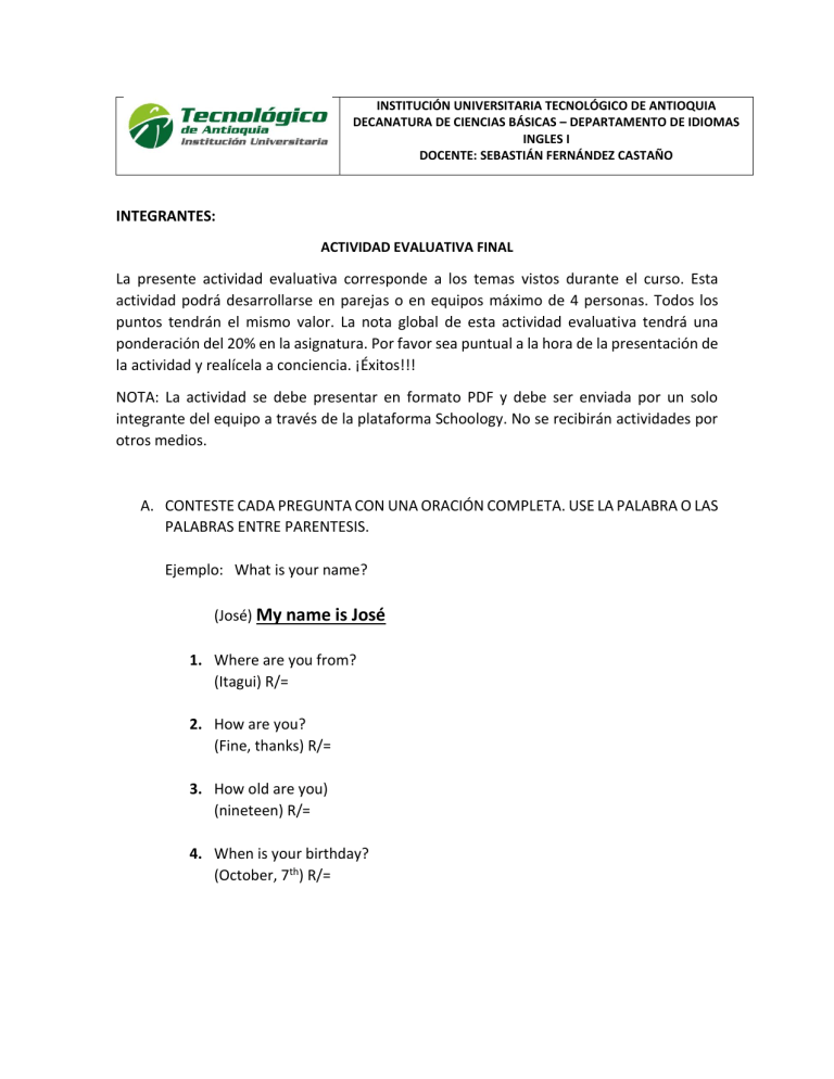 INSTITUCIÓN UNIVERSITARIA TECNOLÓGICO DE ANTIOQUIA DECANATURA DE CIENCIAS BÁSICAS – DEPARTAMENTO DE IDIOMAS INGLES I DOCENTE: SEBASTIÁN FERNÁNDEZ CASTAÑO INTEGRANTES: ACTIVIDAD EVALUATIVA FINAL La presente actividad evaluativa corresponde a los temas vistos durante el curso. Esta actividad podrá desarrollarse en parejas o en equipos máximo de 4 personas. Todos los puntos tendrán el mismo valor. La nota global de esta actividad evaluativa tendrá una ponderación del 20% en la asignatura. Por favor sea puntual a la hora de la presentación de la actividad y realícela a conciencia. ¡Éxitos!!! NOTA: La actividad se debe presentar en formato PDF y debe ser enviada por un solo integrante del equipo a través de la plataforma Schoology. No se recibirán actividades por otros medios. A. CONTESTE CADA PREGUNTA CON UNA ORACIÓN COMPLETA. USE LA PALABRA O LAS PALABRAS ENTRE PARENTESIS. Ejemplo: What is your name? (José) My name is José 1. Where are you from? (Itagui) R/= 2. How are you? (Fine, thanks) R/= 3. How old are you) (nineteen) R/= 4. When is your birthday? (October, 7th) R/= B. ESCRIBA LAS PREGUNTAS CORRESPONDIENTES A ESTAS RESPUESTAS. Ejemplo: ?= where are you from? R/=I am from Panama. 1. ?= R/= My name is Mariana Grisales. 2. ?= R/= I’m fine, thank you. 3. ?= R/= I am in my aunt’s house. 4. ?= R/= I am Psychologist. C. RESALTE LA OPCIÓN CORRECTA. Ejemplo: My name is / name Ana Maria Gonzalez. 1. 2. 3. 4. 5. 6. 7. What / Where are you from? How / What are you? I am from Bogota / Fine. Goodbye. See You / my tomorrow. Good afternoon / night. How are you? My name is / are Mateo. I am fine. Thanks / Goodbye. D. PONGA LAS LETRAS EN ORDEN Y FORMARÁ PALABRAS DEL VOCABULARIO VISTO EN CLASE. Ejemplo: Neam: NAME 1. 2. 3. 4. 5. 6. 7. odog: ahtw: fein: morf: olelh: erhwe: odoybge: E. ESCRIBA TRES ORACIONES COMPLETAS QUE SIRVAN DE PRESENTACIÓN A LAS PERSONAS QUE APARECEN EN LAS FOTOGRAFÍAS. Ejemplo: Ana Sofía Henao Colombia Top Model My name is Ana Sofia Henao. I am from Colombia. I am a Top Model. 1. Juan Guillermo Cuadrado 31 Years Tall 2. Claudia Lopez 50 years Mayor of Bogota 3. J Balvin Real name Jose Alvaro Singer 4. Jennifer Lopez Actress New York F. ACTIVIDAD DE COMPRENSIÓN DE LECTURA. RECOMIENDO UTILIZAR DICCIONARIO Y LISTA DE VERBOS PARA LA REALIZACIÓN DE ESTE PUNTO. What is a Continent? Did you know that there are seven continents on Earth? A continent is like a massive piece of land. The seven continents are called: Asia, Africa, Antarctica, Australia, Europe, North America and South America. The weather, landscapes and animal life is different on each continent. Continents are made up of smaller pieces of land called countries. Do you know the name of your country? Asia is the largest of the seven continents. China and India are countries in Asia. Mount Everest is the highest mountain in the world and is also in Asia. Asia has a huge desert (a place that has very little rain) called the Gobi desert. There are also rainforests and jungles in Asia. Africa has a huge desert called the Sahara Desert. It also has the longest river in the world called the Nile. Antarctica is one of the coldest places on Earth. Have you heard of the North Pole? The South Pole is a place in Antarctica. Australia is a continent and also a country. Australia has many islands that are pieces of land surrounded by water. Europe has over 40 countries. Spain and Italy are warm countries in Europe. Sweden and Norway are also countries in Europe but they are cold countries. North America is made up of the United States, Canada, Mexico and lots of smaller countries. You have probably heard of the Mississippi River. It is a long river in North America. South America has the largest rainforest on Earth. It is called the Amazon Rainforest. Rainforests have lots of rain and provide homes for many animals. Tigers, jaguars, monkeys and parrots are some of the animals that live in a rainforest. Questions 1. What is a continent? 2. How many continents are there? 3. Mount Everest is located on which continent? 4. True or false: The Sahara Desert is in Africa. 5. Spain and Italy are countries on which continent? G. DESARROLLAR EL SIGUIENTE PUNTO DE ACUERDO A LAS TEMATICAS DE PRESENTE SIMPLE Y PRESENTE CONTINUO. ES NECESARIO ESCUCHAR LA CANCIÓN ALL OF ME DE JOHN LEGEND. LINK: https://www.youtube.com/watch?v=450p7goxZqg 1. Complete with the words in the box. The words are mixed. Don’t - beautiful – breathing – without – mind –know spinning What would I do _________ your smart mouth Drawing me in and you kicking me out Got my head _____________, no kidding I can't pin you down What's going on in that _______________ I'm on your magical mystery ride And I'm so dizzy, ___________ what hit me But I'll be alright My head's under water But I'm ____________ fine You're crazy and I'm out of my mind. 2. Number the sentences as you hear them. ( ) All your perfect imperfections ( ) Love your curves and all your edges ( ) 'Cause I give you all of me ( ) Give your all to me ( ) You're my end and my beginning ( ) 'Cause all of me ( ) I'll give my all to you ( ) Even when I lose I'm winning ( ) Loves all of you ( ) And you give me all of you 3. Simple present or Present Continuous? How many times _________ (I/have) to tell you Even when you’re crying you're beautiful too? _____________________ (the world/beat) you down I'm around through every mood You're my downfall, you're my muse My worst distraction, my rhythm and blues I can't stop singing _______________ (It/ring), in my head for you My head's under water But ____________ (I/breathe) fine You're crazy and I'm out of my mind. H. EN ESTE PUNTO LOS INTEGRANTES DEL EQUIPO DEBERÁN CONSTRUIR UN PARRAFO CON SU RUTINA DIARIA UTILIZANDO ADVERBIOS DE FRECUENCIA, SECUENCIA, CONECTORES Y VERBOS EN PRESENTE SIMPLE. MINIMO 5 LINEAS. 1. NAME: 2. NAME: 3. NAME: 4. NAME:
