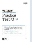 11111111111111111111 Ill 11111 829932 The SAT® Practice Test# 3 t:J Make time to take the practice test. It is one of the best ways to get ready for the SAT. After you have taken the practice test, score it right away at sat.org/digital-practice. This version of the SAT PracticeTest is for students who will be taking the digital SAT in nondigitalformat. ~ 6TSL04 Test begins on the next page. Module 1 Reading and Writing 33 QUESTIONS DIRECTIONS The questions in this section address a number of important reading and writing skills. Each question includes one or more passages, which may include a table or graph. Read each passage and question carefully, and then choose the best answer to the question based on the passage(s). All questions in this section are multiple-choice with four answer choices. Each question has a single best answer. In the early 1800s, the Cherokee scholar Sequoyah created the first script, or writing system, for an Indigenous language in the United States. Because it represented the sounds of spoken Cherokee so accurately, his script was easy to learn and thus quickly achieved _______ use: by 1830, over 90 percent of the Cherokee people could read and write it. Which choice completes the text with the most logical and precise word or phrase? A) widespread B) careful C) unintended D) infrequent Unauthorized copying or reuse of any part of this page is illegal. ...................................................................................................................................................................................................... 1 2 2 When Mexican-American archaeologist Zelia Maria Magdalena Nuttall published her 1886 research paper on sculptures found at the ancient Indigenous city of Teotihuacan in present-day Mexico, other researchers readily _______ her work as groundbreaking; this recognition stemmed from her convincing demonstration that the sculptures were much older than had previously been thought. Which choice completes the text with the most logical and precise word or phrase? A) acknowledged B) ensured C) denied D) underestimated CO N T I N U E Like other tribal nations, the Muscogee (Creek) Nation is self-governing; its National Council generates laws regulating aspects of community life such as land use and healthcare, while the principal chief and cabinet officials _______ those laws by devising policies and administering services in accordance with them. Which choice completes the text with the most logical and precise word or phrase? A) implement B) presume C) improvise D) mimic 4 In the Indigenous intercropping system known as the Three Sisters, maize, squash, and beans form an _______ web of relations: maize provides the structure on which the bean vines grow; the squash vines cover the soil, discouraging competition from weeds; and the beans aid their two “sisters” by enriching the soil with essential nitrogen. Which choice completes the text with the most logical and precise word or phrase? A) indecipherable B) ornamental C) obscure D) intricate Unauthorized copying or reuse of any part of this page is illegal. ............................................................................................................................................................................................................................................................................................................... 3 3 5 The artisans of the Igun Eronmwon guild in Benin City, Nigeria, typically _______ the bronze- and brass-casting techniques that have been passed down through their families since the thirteenth century, but they don’t strictly observe every tradition; for example, guild members now use air-conditioning motors instead of handheld bellows to help heat their forges. Which choice completes the text with the most logical and precise word or phrase? A) experiment with B) adhere to C) improve on D) grapple with 6 Some economic historians _______ that late nineteenth- and early twentieth-century households in the United States experienced an economy of scale when it came to food purchases—they assumed that large households spent less on food per person than did small households. Economist Trevon Logan showed, however, that a close look at the available data disproves this supposition. Which choice completes the text with the most logical and precise word or phrase? A) surmised B) contrived C) questioned D) regretted CO N T I N U E The work of Kiowa painter T.C. Cannon derives its power in part from the tension among his _______ influences: classic European portraiture, with its realistic treatment of faces; the American pop art movement, with its vivid colors; and flatstyle, the intertribal painting style that rejects the effect of depth typically achieved through shading and perspective. Which choice completes the text with the most logical and precise word or phrase? A) complementary B) unknown C) disparate D) interchangeable 8 New and interesting research conducted by Suleiman A. Al-Sweedan and Moath Alhaj is inspired by their observation that though there have been many studies of the effect of high altitude on blood chemistry, there is a _______ studies of the effect on blood chemistry of living in locations below sea level, such as the California towns of Salton City and Seeley. Which choice completes the text with the most logical and precise word or phrase? A) quarrel about B) paucity of C) profusion of D) verisimilitude in Unauthorized copying or reuse of any part of this page is illegal. ............................................................................................................................................................................................................................................................................................................... 7 4 9 The following text is from Sarah Orne Jewett’s 1899 short story “Martha’s Lady.” Martha is employed b