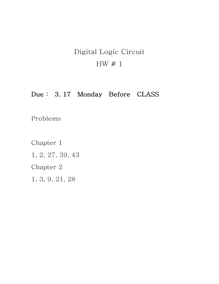 Digital Logic Circuit HW # 1 Due : 3. 17 Monday Before Problems Chapter 1 1, 2, 27, 39, 43 Chapter 2 1, 3, 9, 21, 28 CLASS