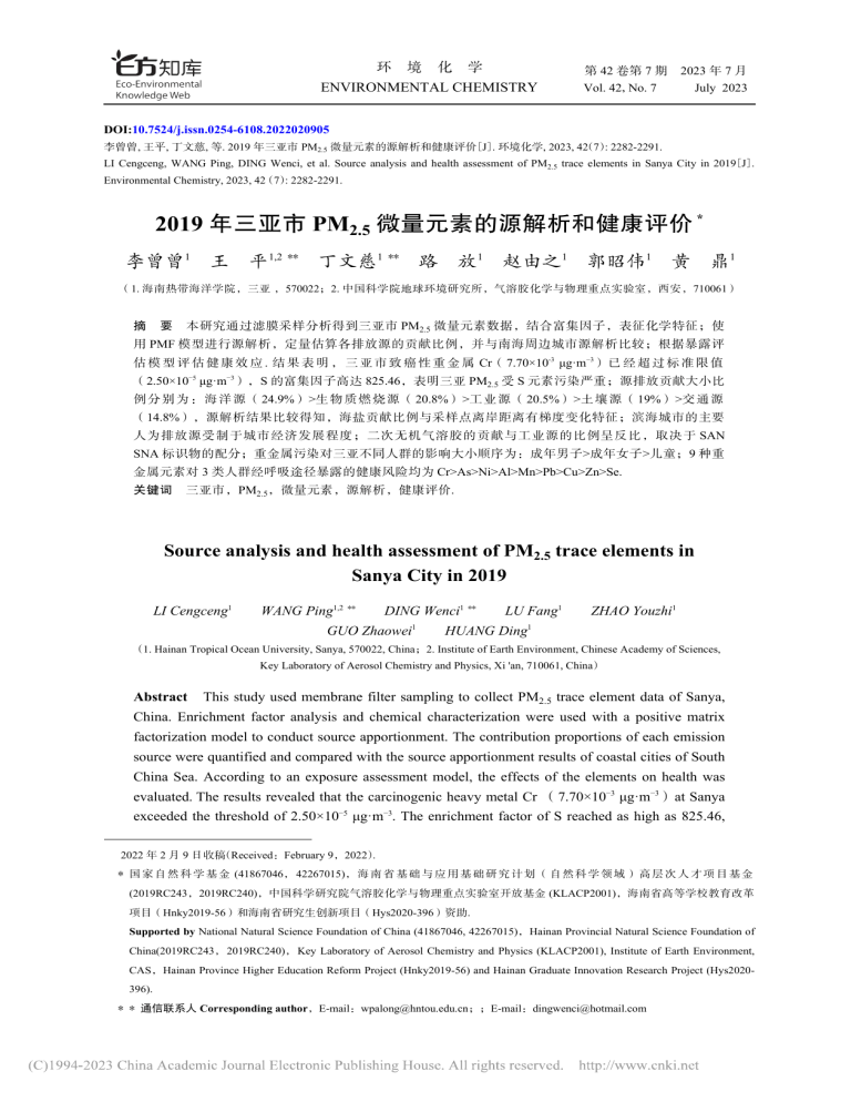 环 境 化 学 ENVIRONMENTAL CHEMISTRY 第 42 卷第 7 期 Vol. 42,No. 7 2023 年 7 月 July 2023 DOI:10.7524/j.issn.0254-6108.2022020905 李曾曾, 王平, 丁文慈, 等. 2019 年三亚市 PM2.5 微量元素的源解析和健康评价[J]. 环境化学, 2023, 42(7): 2282-2291. LI Cengceng, WANG Ping, DING Wenci, et al. Source analysis and health assessment of PM2.5 trace elements in Sanya City in 2019[J]. Environmental Chemistry, 2023, 42 (7): 2282-2291. 2019 年三亚市 PM2.5 微量元素的源解析和健康评价 * 李曾曾1 王 平1,2 ** 丁文慈1 ** 路 放1 赵由之1 郭昭伟1 黄 鼎1 (1. 海南热带海洋学院,三亚 ,570022;2. 中国科学院地球环境研究所,气溶胶化学与物理重点实验室,西安,710061) 摘 要 本研究通过滤膜采样分析得到三亚市 PM2.5 微量元素数据,结合富集因子,表征化学特征;使 用 PMF 模型进行源解析,定量估算各排放源的贡献比例,并与南海周边城市源解析比较;根据暴露评 估 模 型 评 估 健 康 效 应 . 结 果 表 明 , 三 亚 市 致 癌 性 重 金 属 Cr( 7.70×10-3 μg·m−3) 已 经 超 过 标 准 限 值 (2.50×10−5 μg·m−3),S 的富集因子高达 825.46,表明三亚 PM2.5 受 S 元素污染严重;源排放贡献大小比 例 分 别 为 : 海 洋 源 ( 24.9%) >生 物 质 燃 烧 源 ( 20.8%) >工 业 源 ( 20.5%) >土 壤 源 ( 19%) >交 通 源 (14.8%),源解析结果比较得知,海盐贡献比例与采样点离岸距离有梯度变化特征;滨海城市的主要 人为排放源受制于城市经济发展程度;二次无机气溶胶的贡献与工业源的比例呈反比,取决于 SAN SNA 标识物的配分;重金属污染对三亚不同人群的影响大小顺序为:成年男子>成年女子>儿童;9 种重 金属元素对 3 类人群经呼吸途径暴露的健康风险均为 Cr>As>Ni>Al>Mn>Pb>Cu>Zn>Se. 关键词 三亚市,PM2.5,微量元素,源解析,健康评价. Source analysis and health assessment of PM2.5 trace elements in Sanya City in 2019 LI Cengceng1 WANG Ping1,2 ** DING Wenci1 ** GUO Zhaowei1 LU Fang1 ZHAO Youzhi1 HUANG Ding1 (1. Hainan Tropical Ocean University, Sanya, 570022, China;2. Institute of Earth Environment, Chinese Academy of Sciences, Key Laboratory of Aerosol Chemistry and Physics, Xi 'an, 710061, China) Abstract This study used membrane filter sampling to collect PM2.5 trace element data of Sanya, China. Enrichment factor analysis and chemical characterization were used with a positive matrix factorization model to conduct source apportionment. The contribution proportions of each emission source were quantified and compared with the source apportionment results of coastal cities of South China Sea. According to an exposure assessment model, the effects of the elements on health was evaluated. The results revealed that the carcinogenic heavy metal Cr (7.70×10−3 μg·m−3)at Sanya exceeded the threshold of 2.50×10−5 μg·m−3. The enrichment factor of S reached as high as 825.46, 2022 年 2 月 9 日 收稿(Received:February 9,2022). * 国 家 自 然 科 学 基 金 (41867046, 42267015), 海 南 省 基 础 与 应 用 基 础 研 究 计 划 ( 自 然 科 学 领 域 ) 高 层 次 人 才 项 目 基 金 (2019RC243,2019RC240),中国科学研究院气溶胶化学与物理重点实验室开放基金 (KLACP2001),海南省高等学校教育改革 项目(Hnky2019-56)和海南省研究生创新项目(Hys2020-396)资助. Supported by National Natural Science Foundation of China (41867046, 42267015),Hainan Provincial Natural Science Foundation of China(2019RC243, 2019RC240), Key Laboratory of Aerosol Chemistry and Physics (KLACP2001), Institute of Earth Environment, CAS,Hainan Province Higher Education Reform Project (Hnky2019-56) and Hainan Graduate Innovation Research Project (Hys2020396). * * 通信联系人 Corresponding author,E-mail:wpalong@hntou.edu.cn;;E-mail:dingwenci@hotmail.com 李曾曾等:2019 年三亚市 PM2.5 微量元素的源解析和健康评价 7期 2283 implying that the PM2.5 in Sanya was severely polluted by S. The contribution proportions of emission sources ranking from high to low were the ocean (24.9%) > biomass combustion (20.8%) > industry (20.5%) > soil (19%) > traffic (14.8%). The source apportionment results revealed that the contribution proportion of sea salt exhibited gradient changes in relation to the distance of the sampling location to the coast. The main anthropogenic emissions of coastal cities were subject to the level of economic development of individual cities. The contribution proportions of secondary inorganic aerosols were inversely proportional to that of industrial emission sources, depending on the ratios of SNA markers. The level of influence of heavy metal pollution on different populations in Sanya was highest on adult man, followed by adult women and children. The risks of the 3 populations exposed to 9 heavy metals through respiratory tracts were Cr > As > Ni > Al > Mn > Pb > Cu > Zn > Se. Keywords Sanya,PM2.5,trace elements,source apportionment,health assessment. 大气颗粒物 PM2.5 与气候变化、人体健康、生态环境等密切相关 [1]. 三亚市(18°18′N,109°31′E)位 于海南岛的最南端,地处低纬度,属热带海洋性季风气候区. 随着海南自由贸易港建设进展加快、国际 旅游岛对外开放和海南热带气候等区位优势,海南人口激增与经济快速发展,空气质量的压力越来越 大[2],三亚市政府和国内外游客也日益重视 PM2.5 的健康效应. 三亚 PM2.5 研究报道较少,与之关联的是南海大气化学研究. 前人研究如下:三亚 PM2.5 中 OC 和 EC ;PM2.5 光学特征 [5 − 6];PM2.5 的潜在源定性分析 [4,7];PMF 模型定量源解析 [8]. 海口 CMB 模型源解 [3 − 4] 析 [9 − 10];南海 PMF 模型源解析 [11 − 12];南海有机气溶胶分子标识物和同位素示踪来源 [13 − 15];上述源解析 很少单用微量元素. 受体模型 PMF 源解析优点在于