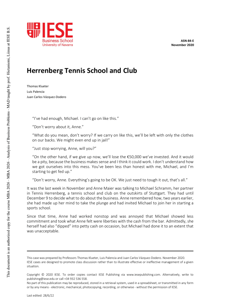 ASN-84-E November 2020 Herrenberg Tennis School and Club Thomas Klueter Luis Palencia Juan Carlos Vázquez-Dodero “I’ve had enough, Michael. I can’t go on like this.” “Don’t worry about it, Anne.” “What do you mean, don’t worry? If we carry on like this, we’ll be left with only the clothes on our backs. We might even end up in jail!” “Just stop worrying, Anne, will you?” “On the other hand, if we give up now, we’ll lose the €50,000 we’ve invested. And it would be a pity, because the business makes sense and I think it could work. I don’t understand how we got ourselves into this mess. You’ve been less than honest with me, Michael, and I’m starting to get fed up.” “Don’t worry, Anne. Everything’s going to be OK. We just need to tough it out, that’s all.” It was the last week in November and Anne Maier was talking to Michael Schramm, her partner in Tennis Herrenberg, a tennis school and club on the outskirts of Stuttgart. They had until December 9 to decide what to do about the business. Anne remembered how, two years earlier, she had made up her mind to take the plunge and had invited Michael to join her in starting a sports school. Since that time, Anne had worked nonstop and was annoyed that Michael showed less commitment and took what Anne felt were liberties with the cash from the bar. Admittedly, she herself had also “dipped” into petty cash on occasion, but Michael had done it to an extent that was unacceptable. This case was prepared by Professors Thomas Klueter, Luis Palencia and Juan Carlos Vázquez-Dodero. November 2020. IESE cases are designed to promote class discussion rather than to illustrate effective or ineffective management of a given situation. Copyright © 2020 IESE. To order copies contact IESE Publishing via www.iesepublishing.com. Alternatively, write to publishing@iese.edu or call +34 932 536 558. No part of this publication may be reproduced, stored in a retrieval system, used in a spreadsheet, or transmitted in any form or by any means - electronic, mechanical, photocopying, recording, or otherwise - without the permission of IESE. Last edited: 28/6/22 ASN-84-E Herrenberg Tennis School and Club Anne was 24 when she decided to set up her own business. Being an excellent tennis player and coming from a humble background, she had the right qualities to work with youngsters, and so had decided to start a professional tennis school for up-and-coming talent. Her friend Michael, also an excellent player, was delighted to join the venture, as he “had to do something.” Having grown up in the “pro” tennis environment of the “Baden-Wuertemberg school,” (the region in which both Steffi Graf and Boris Becker had started their training and careers), they both had good contacts and experienced no difficulty finding their first eight customers, all of them young people aged 14 to 18. Anne had discovered a semi-abandoned tennis club, called Tennis Herrenberg, close to a freeway only 25 km. from Stuttgart, with other similar clubs and a large business park nearby. For a very reasonable price, they could rent the four courts they needed (one for every two students) to start their classes there. They took out a bank loan to finance the purchase of a van and the school was ready to go. Monday through Friday, they would pick up their pupils in Stuttgart and the nearby vicinity, drive them to the courts, practice for three hours, and then drive them back to Stuttgart, where the pupils received targeted physical training in a gym. They carried on like this for a year and a half and everything went well. They were able to repay the loan for the van and even generated a small net income. Both Anne and Michael turned out to be excellent coaches. They knew how to relate to their young students and soon made a name for themselves in the Stuttgart area; within months, their students had started to get themselves noticed locally. Anne had always had an entrepreneurial bend and wanted to be her own boss, so Michael was not surprised when she suggested they buy Tennis Herrenberg and turn it into a sports club. The owner of the club, Josef Kaiser, promptly poured cold water on their enthusiasm by asking €900,000 for the land and the facilities. Tennis Herrenberg Tennis Herrenberg occupied a plot of around 6,00 m2, with 12 tennis courts in a deplorable state and two semi-derelict buildings, each with a floor area of 120m2. One of the buildings had previously been utilized for changing rooms, while the other was used as a bar and had a small office. 8 of the courts we covered by a wooden/metal structure that could be opened or closed to allow continuous usage even under harsh weather conditions (“halboffen” in German). There were at least three tennis clubs within an area of around 3km2. Only one of them operated exclusively on a membership basis; the rest also rented their courts by the hour. Most seemed to be doing fairly well but none of them had covers. Some of the companies located nearby organized championships for their employees and on weekends from Friday afternoon to Sunday lunchtime, the courts filled up with players from Stuttgart, Tübingen and the surrounding area. Anne and Michael thought they could make a success of it if they improved the club’s facilities. The fact that they were both good players would be an advantage, they thought. They wondered why the club had not been successful before, considering it was in such an exceptional location. They assumed that, as the owner had interests in various other businesses, he had never really exploited the club’s potential. 2 IESE Business School-University of Navarra Herrenberg Tennis School and Club ASN-84-E The Contract At the price Josef was asking, buying the business was out of the question, so they negotiated an eight-year lease. A businessman in his mid-50s who ran several parking facilities in the city, Josef drove a tough deal. The contract that Anne