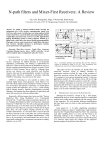 N-path filters and Mixer-First Receivers: A Review Eric A.M. Klumperink, Hugo J. Westerveld, Bram Nauta University of Twente, CTIT, IC Design group, Enschede, The Netherlands Abstract—To realize a Software Defined Radio covering the mainstream 0.5-6 GHz wireless communication bands, new SAW-less radio receiver architectures are being explored which realize selectivity in a more flexible and programmable fashion. N-path filters and mixer-first receivers can offer high-linearity high-Q RF-filtering around a center frequency defined by a digital clock, which offers the desired flexible programmability. This paper reviews recent research on N-path filters and mixerfirst receivers, identifies advances in performance analysis, circuit performance and applications. Band-Pass Filter (BPF) Keywords—Mixer-first reeceiver, N-path filter, Frequency Translated filtering, passive mixer, CMOS, switch-R-C circuit, software defined radio, reconfigurable radio, RF, wireless I. INTRODUCTION In a world with ever more mutually interfering wireless devices, selectivity by high-Q filtering is of paramount importance. Traditionally, this filtering is implemented by high-Q LC-filters or devices that can be modelled as such (e.g. devices exploiting transmission lines, Surface Acoustic Waves (SAW) or Bulk Acoustic Waves (BAW)). Although these devices can achieve very good selectivity and excellent linearity, they lack the programmability wanted for software defined radio. Moreover, compared to solutions exploiting CMOS IC technology, size and cost are key issues. CMOS IC technology is very suitable to realize wellmatched highly linear oxide-capacitors, while Moore’s law also offers faster digital circuits and better switches in terms of low on-resistance and parasitic capacitance. As N-path filters exploit switches and capacitors, see e.g. Fig. 1, while offering high-Q filteing around a digitally programmable switching frequency, this explains the recent interest in N-path filters and mixer-first receivers for software defined radio. Historically, different names have been used like “Narrow Band-Pass filter Using Modulation” [1], “Commutated Network”[2], “Comb Filter using Commutated Capacitors” [2, 3], “Sampled-Data Band-Pass filter” [4], Frequency-Translated Filter [4], “N-Path filter” [5]. We will use the generalized term N-path filter here, as in the filter survey by Moschytz [6]: “N identical networks H(j) are cyclically switched into the signal path. Thus, the total N-phase impulse network has timevariable characteristics. If a low-pass filter is used to provide the H(j) function in each of the paths, the cyclical switching process causes a low-pass to bandpass transformation.” Note that we do not assume a uni-lateral transfer for each of the N signal paths, although this is sometimes convenient to simplify analysis, e.g. as in [5]. Band-Reject Filter (BRF) or Notch-filter Fig. 1. Commutated band-pass and band-stop filter and their frequency response as predicted by Smith in 1953 [2]. Early commutators were implemented as motor driven rotating mechanical switches. This paper reviews the literature on N-path filters and mixer-first receivers, trying to identify advances in performance analysis (section II), steps in the evolution of mixer-first receivers (section III) and N-path filters (section IV), concepts to lower power dissipation (section V) and new applications (section V). The primary focus will be on high linearity passive-first frequency-selective switch-R-C circuits. Active feedback techniques as reviewed in [7] and wideband approaches like in [8] are not covered, but can be found in other reviews like [9-11]. The reference list focusses on journal papers, even if earlier conference papers exist. II. PERFORMANCE ANALYSIS OF N-PATH FILTERS Although the switch-R-C circuits in Fig. 1 look simple, mathematical analysis of their transfer function is complicated by their time-variant nature combined with the memory effect of the capacitors. We will describe different simplifications that have been used over time to make performance analysis tractable. Early papers [2, 3, 5] make simplifying assumptions ultimately leading to a kind of “sampled data” approximation, hence the title “Sampled Data Band-Pass Filter” [4]. Assuming such ideal sampling there is no loss and this leads to an interesting analogy of the commutator in Fig. 1 with a transmission line: if the rotator cycle-time is equal to the period of a sinewave input signal, the voltages on the capacitors become samples of one period of the sinewave. Vin f=fs RC >> Ton Vout a) Cp | Lp | N 2 (1 cos(2S / N )) R 2S 2 N 2 (1 cos(2S / N )) N ( R p R) 2Rp C 1 (2Sf s ) 2 C p R + + Vin - Vout 0 Magnitude [dB] RP | Rp Lp Cp - -10 -20 -40 -50 b) Fig. 3. 4-Path mixer-first receiver with 25% duty-cycle clocks, differential RF-input Vin, low-pass baseband quadratures outputs VI+ VI- VQ+ VQ- and band-pass filtered RF-output Vout. Even harmonic responses cancel. Switch resistance limits out-of-band filter rejection, as modelled via Rs and 2Rsw. -30 0 1 2 3 4 5 Frequency [GHz] Fig. 2. 4-path switch-R-C filter: a) time-domain waveforms; b) Simulated transfer function (dashed line) and approximate R-L-C model (drawn) [12] (R=50, C=50pF, 1 switch resistance, 1 GHz clock with 25% duty cycle). After one full commutator cycle, the new incoming sinewave is hence “confronted with” a sample stored on the capacitor one period ago. This behavior resembles that of an open transmission line of length T/2, which fully reflects the input signal of one period ago [2, 3]. As a result, the transfer function shown in Fig. 1 has the well-known comb filter behavior of transmission line filters, with identical gain for all harmonics. Although the identical gain at harmonics is a somewhat crude approximation (see Fig. 2 for N=4 [12]), it gives useful first order insight. Moreover, [2, 3] already rather accurately estimated the -3dB bandwidth of th