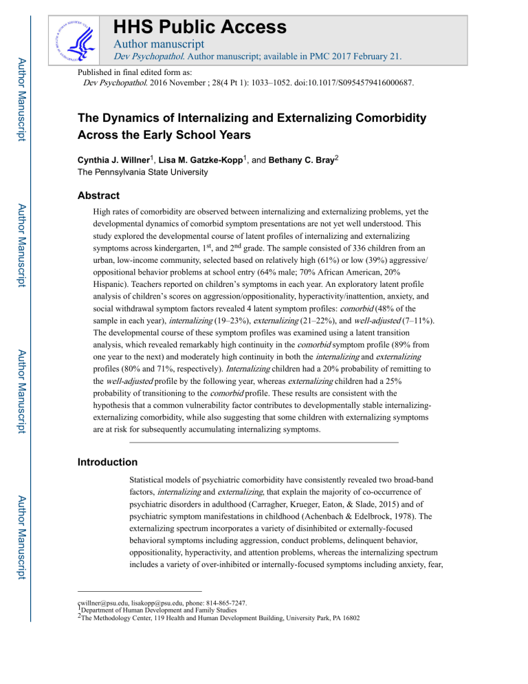HHS Public Access Author manuscript Author Manuscript Dev Psychopathol. Author manuscript; available in PMC 2017 February 21. Published in final edited form as: Dev Psychopathol. 2016 November ; 28(4 Pt 1): 1033–1052. doi:10.1017/S0954579416000687. The Dynamics of Internalizing and Externalizing Comorbidity Across the Early School Years Cynthia J. Willner1, Lisa M. Gatzke-Kopp1, and Bethany C. Bray2 The Pennsylvania State University Abstract Author Manuscript Author Manuscript High rates of comorbidity are observed between internalizing and externalizing problems, yet the developmental dynamics of comorbid symptom presentations are not yet well understood. This study explored the developmental course of latent profiles of internalizing and externalizing symptoms across kindergarten, 1st, and 2nd grade. The sample consisted of 336 children from an urban, low-income community, selected based on relatively high (61%) or low (39%) aggressive/ oppositional behavior problems at school entry (64% male; 70% African American, 20% Hispanic). Teachers reported on children’s symptoms in each year. An exploratory latent profile analysis of children’s scores on aggression/oppositionality, hyperactivity/inattention, anxiety, and social withdrawal symptom factors revealed 4 latent symptom profiles: comorbid (48% of the sample in each year), internalizing (19–23%), externalizing (21–22%), and well-adjusted (7–11%). The developmental course of these symptom profiles was examined using a latent transition analysis, which revealed remarkably high continuity in the comorbid symptom profile (89% from one year to the next) and moderately high continuity in both the internalizing and externalizing profiles (80% and 71%, respectively). Internalizing children had a 20% probability of remitting to the well-adjusted profile by the following year, whereas externalizing children had a 25% probability of transitioning to the comorbid profile. These results are consistent with the hypothesis that a common vulnerability factor contributes to developmentally stable internalizingexternalizing comorbidity, while also suggesting that some children with externalizing symptoms are at risk for subsequently accumulating internalizing symptoms. Introduction Author Manuscript Statistical models of psychiatric comorbidity have consistently revealed two broad-band factors, internalizing and externalizing, that explain the majority of co-occurrence of psychiatric disorders in adulthood (Carragher, Krueger, Eaton, & Slade, 2015) and of psychiatric symptom manifestations in childhood (Achenbach & Edelbrock, 1978). The externalizing spectrum incorporates a variety of disinhibited or externally-focused behavioral symptoms including aggression, conduct problems, delinquent behavior, oppositionality, hyperactivity, and attention problems, whereas the internalizing spectrum includes a variety of over-inhibited or internally-focused symptoms including anxiety, fear, cwillner@psu.edu, lisakopp@psu.edu, phone: 814-865-7247. 1Department of Human Development and Family Studies 2The Methodology Center, 119 Health and Human Development Building, University Park, PA 16802 Willner et al. Page 2 Author Manuscript Author Manuscript sadness/depression, social withdrawal, and somatic complaints. Despite the apparent distinctiveness between these domains, most studies of children find them to be positively correlated with one another (Bird, Gould, & Staghezza, 1993; Caron & Rutter, 1991). Because much of the epidemiological research presents only a cross-sectional view of the prevalence of child psychopathology, it is not clear how comorbidity develops over time. It is possible that comorbidity between externalizing and internalizing domains increases probabilistically over time, as initial symptoms become risk factors for the development of additional symptoms from the other domain (i.e., accumulation). Alternatively, it is possible that psychopathology is less differentiated in younger children, such that children may exhibit symptoms from both domains initially that, over time, crystallize into more “pure” internalizing or externalizing presentations in response to environmental contingencies that shape symptom manifestation (i.e., differentiation). Finally, it is possible that comorbidity is stable over time, reflecting the influence of a common underlying trait that increases vulnerability to both domains of psychopathology across the lifespan. In this study, we examine if and how children’s profiles of psychopathology change across the first 3 years of school. Theoretical Perspectives on Comorbidity Author Manuscript The predominance of comorbidity has been a major concern in clinical science. One of the primary debates is whether the co-occurrence between different syndromes is appropriately termed “comorbidity,” in the medical application of this term (Lilienfeld, Waldman, & Israel, 1994). Comorbidity refers to the presence of two independent syndromes, which implies that the probability of comorbidity should equal the product of the probabilities of each individual disorder. Data, however, clearly demonstrate that rates of comorbidity between internalizing and externalizing disorders far exceed the rate that would be predicted based on chance co-occurrence of independent syndromes, suggesting that some mechanism must underlie the phenomenon of comorbidity (Beauchaine & McNulty, 2013; Caron & Rutter, 1991). Author Manuscript One of the primary hypotheses put forward is that a common trait imparts vulnerability for symptoms in both domains (Weiss, Süsser, & Catron, 1998). Behavioral genetics models have suggested that a substantial portion of the correlation between externalizing and internalizing disorders is accounted for by a common genetic component (Cosgrove et al., 2011; Lahey, Van Hulle, Singh, Waldman, & Rathouz, 2011). This common genetic liability appears to be at least partially mediated by trait negative affecti