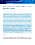 TECHNICAL BRIEF June 2020 —1— Benchmarking Utility-Scale PV Operational Expenses and Project Lifetimes: Results from a Survey of U.S. Solar Industry Professionals Ryan Wiser, Mark Bolinger, and Joachim Seel, Lawrence Berkeley National Laboratory This paper draws on a survey of solar industry professionals and other sources to clarify trends in the expected useful life and operational expenditure (OpEx) of utility-scale photovoltaic (PV) plants in the United States. Solar project developers, sponsors, long-term owners, and consultants have increased project-life assumptions over time, from an average of ~21.5 years in 2007 to ~32.5 years in 2019. Current assumptions range from 25 years to more than 35 years depending on the organization; 17 out of 19 organizations surveyed or reviewed use 30 years or more. Levelized, lifetime OpEx estimates have declined from an average of ~$35/kW DC -yr for projects built in 2007 to an average of ~$17/kW DC -yr in 2019. Across 13 sources, the range in average lifetime OpEx for projects built in 2019 is broad, from $13 to $25/kW DC -yr. Operations and maintenance (O&M) costs—one component of OpEx—have declined precipitously in recent years, to $5-8/kW DC -yr in many cases. Property taxes and land lease costs are highly variable across sites, but on average are—together—of similar magnitude. Other OpEx line items include security, insurance, and asset management. Given 2007-2009 values for not only project life and OpEx but also other drivers of the levelized cost of energy (LCOE, excluding the investment tax credit), the LCOE for utility-scale PV projects built from 2007 through 2009 averaged $305/MWh. Using 2019 values for all parameters yields an average LCOE of $51/MWh. The decline in LCOE from $305/MWh to $51/MWh was predominantly caused by reductions in up-front expenditures (and, to a much lesser extent, by changes in capacity factors, financing costs, and tax rates), but 9% ($22/MWh) of the overall decline is due to improvements in project life and OpEx. Project life extensions and OpEx reductions have had similarly sized impacts on LCOE over this period, at $11/MWh each. Had project life and OpEx not improved over the last decade, LCOE in 2019 would have instead been $73/MWh—43% higher. Given the limited quantity and comparability of previously available data on these cost drivers, the data and trends presented here may inform assumptions used by electric system planners, modelers, and analysts. The results may also provide useful benchmarks to the solar industry, helping developers and assets owners compare their expectations for project life and OpEx with those of their peers. Methods The findings in this paper draw in part from a brief survey of U.S. solar project developers, sponsors, financiers, and consultants. We distributed the survey in December 2019. Responses were received from seven organizations. Additionally, we conducted a review of the annual financial reports from some of the large, publicly traded solar project developers and owners, yielding a number of additional sets of project- TECHNICAL BRIEF —2— life assumptions. 1 Ultimately, we assembled 19 different time-series estimates of useful project life. 2 For OpEx estimates, in addition to seven survey responses, we synthesized data from seven literature sources, leading to 14 different time-series estimates. 3 With respect to project life, our interest was in better understanding how expectations for useful life have changed over time, as the industry has grown and matured. We focus on ‘useful’ life, defined here to mean the period of time in which the expected costs and revenues of a project are assessed to determine its economic viability. Typically, an asset with a useful life of, for example, 30 years is expected to earn ongoing operating profits during those 30 years (ongoing revenue > ongoing costs). At the end of year 30, however, either decommissioning or full project repowering would be expected. A longer assumed project life may enhance the expected long-term profitability of a project, assuming any resulting increase in O&M is kept within reasonable bounds. Moreover, longer depreciation terms reduce annual book depreciation from an accounting perspective, thereby boosting net income in the near term. From a planning and modeling perspective, longer lifetimes may enable lower LCOE by recovering up-front capital costs (and, potentially, any component replacement or refurbishment costs) over additional years of electricity production. We specifically sought insights into assumptions most-commonly used by developers and sponsors for project life when considering the lifetime profitability of a project, pitching projects to financiers, and establishing power purchase agreements during the development and financing process. We asked about current assumptions, and how those assumptions have changed over time. With respect to OpEx, our interest was in total all-in operational expenditures and how expectations for OpEx have changed over time. We define OpEx to include scheduled and unscheduled maintenance, operations personnel, land lease costs, property taxes, and any other ongoing operations costs; some studies focus solely on O&M, but our interest was total OpEx. We sought levelized estimates considering the full expected lifetime of utility-scale PV plants. We asked respondents to report data in $/kW DC -yr, and requested elaboration on any variations that might exist depending on whether a project is fixed-tilt vs. tracking, whether a project is located in a region with heavy soiling (requiring frequent washing) or vegetation growth (requiring vegetation management), or other project characteristics. We supplement the survey results with estimates from other literature. Much of the available literature does not report all-in OpEx (instead reporting only O&M, or ignoring certain costs); in many cases, coverage and even units are unclear. We therefore 