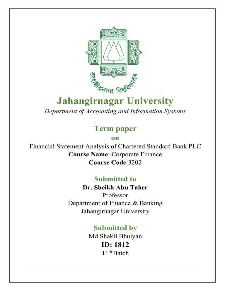 Jahangirnagar University Department of Accounting and Information Systems Term paper on Financial Statement Analysis of Chartered Standard Bank PLC Course Name: Corporate Finance Course Code:3202 Submitted to Dr. Sheikh Abu Taher Professor Department of Finance & Banking Jahangirnagar University Submitted by Md.Shakil Bhuiyan ID: 1812 11th Batch Letter of Transmittal March 09, 2025 Dr. Sheikh Abu Taher Professor Department of Finance and Banking Jahangirnagar University Savar, Dhaka-1342 Subject: Submission of the required report for the BBA program. Dear Sir, As part of Corporate Finance(3202), I am pleased to present my report on "Financial Statement Analysis on Standard Chartered Bank PLC" which is a partial requirement for fulfilling my BBA program. I wrote the whole report based on Standard Bank's financial statements from 2019 to 2023. It's a great pleasure to inform you that I have tried to make my paper as comprehensive as possible. I want to thank you for taking the time to read my term paper. I am grateful to you for giving me such an opportunity, as well as the guidelines that you have invested in me, and I appreciate this work. I hope that you will cordially receive my report. Kind Regards, Md.Shakil Bhuiyan ID: 1812 Session: 2020-21 Department of Accounting and Information Systems Jahangirnagar University 2|Page Table of Contents 1. Executive Summary------------------------------------------------------------------------------4 2. Introduction -------------------------------------------------------------------------------------- 5 3. Theoretical Framework ------------------------------------------------------------------------ 6 4. Financial Statement Analysis on Standard Chartered Bank PLC ---------------------8 Ratio Analysis -------------------------------------------------------------------------------------- 8 i)Liquidity Ratio Current Ratio -----------------------------------------------------------------------------------8 Net Working Capital-------------------------------------------------------------------------- 8 Comment about the Overall Liquidity -------------------------------------------------------9 ii)Asset Management (Turnover) Ratio/Activity Ratio Total Asset Turnover -------------------------------------------------------------------------9 Fixed Asset Turnover ------------------------------------------------------------------------ 10 Comment about the Overall Asset Utilization -------------------------------------------- 10 iii)Capital Structure Ratio Debt to Equity Ratio ------------------------------------------------------------------------- 11 Equity Multiplier Ratio --------------------------------------------------------------------- 11 Comment about the Overall Capital Structure -------------------------------------------- 12 iv)Profitability Ratio Net Profit Margin ------------------------------------------------------------------------------12 Return on Assets (ROA) ----------------------------------------------------------------------13 Return on Equity (ROE) ---------------------------------------------------------------------- 13 Return on Investments (ROI) -----------------------------------------------------------------14 Earnings per Share (EPS) --------------------------------------------------------------------- 14 Comment about the Overall Profitability -------------------------------------------------- 15 DuPont Analysis ------------------------------------------------------------------------------------ 15 Horizontal Analysis ---------------------------------------------------------------------------------16 5. Conclusion -------------------------------------------------------------------------------------------19 6.Appendix and References -------------------------------------------------------------------------20 3|Page Executive Summary The document concisely summarizes Standard Chartered Bank PLC's financial performance, financial position, and sources and uses of cash flow from 2019 to 2023. The balance sheets and income statements of Standard Chartered Bank PLC were used to create a horizontal analysis, ratio analysis, and DuPont analysis. The financial statements and horizontal balance sheets are created using a specific method. There are five chapters in this report. The first chapter of this report has covered the introduction. The first chapter covers the study's introduction mentioning the bank’s operation sectors, the products and services of the bank, and its roles in Bangladesh and the international sector specifically in Asia, Africa, and the Middle East. Chapter three contains the study's theoretical basis. The capital adequacy, liquidity, profitability, capital structure, asset usage, and market ratios were all assessed in the finished study. All of the concepts pertaining to those ratios, their computation formulas, and the procedures for both vertical and horizontal analysis were covered in this chapter. The use of financial performance, measuring methods, and financial instruments are also disclosed here. The term paper's fourth chapter, which includes a financial performance review, is the most important section. Trend, common size, growth, and ratio analysis ( liquidity, asset usage, profitability, and capital structure) are among its functions. Here, DuPont analysis is also used to illustrate how three ratios affect return on equity (ROE). The analysis yielded a very excellent result. also provided some conclusions from the analysis in chapter four. Some recommendations aim to improve Standard Bank PLC's financial stability and performance. Additionally, the final chapter contains the overall conclusions. 4|Page Introduction The banking industry is a vital component of every country's economy, acting as a key enabler of financial intermediation and economic expansion. A portion of the population in Bangladesh is looking for moral financial solutions. With its 1905 incorporation, Standard Chartered Bank is a Br