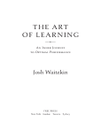Praise for The Art of Learning “We all remember the portrayal of Josh Waitzkin in Searching for Bobby Fischer. He was a very impressive child who continues to impress with The Art of Learning. Through a unique set of experiences, Waitzkin has formed an original and outstanding perspective. From chess to Tai Chi, he provides tools that allow all of us to improve ourselves every day.” —Cal Ripken, Jr., 2007 Baseball Hall of Fame Inductee “Waitzkin’s engaging voice and his openness . . . make him a welcome teacher.” —Publishers Weekly “A vibrant and engaging look at the love of learning and the pursuit of excellence.” —Booklist “The Art of Learning succeeds on every level, by combining a truly compelling autobiography with profound philosophical and psychological insights, all wrapped in a practical how-to framework. This is a must-read for anyone wishing to achieve that rare combination of success and fulfillment.” —Paul Blease, SVP, Director Team Development & Consulting, Citigroup Smith Barney “Waitzkin’s in-depth look into the mental side of his success in both chess and martial arts is an inspiring and absorbing read. I strongly recommend it for anyone who lives in a world of competition, whether it’s sports or business or anywhere else. It’s also a great training tool for kids aspiring to reach the pinnacle of their chosen fields.” —Mark Messier, 6-time Stanley Cup Champion “The title is accurate—at a profound level, it’s about real learning from hard conflict rather than from disinterested textbooks.” —Robert Pirsig, author of Zen and the Art of Motorcycle Maintenance Thank you for downloading this Free Press eBook. Join our mailing list and get updates on new releases, deals, bonus content and other great books from Free Press and Simon & Schuster. CLICK HERE TO SIGN UP or visit us online to sign up at eBookNews.SimonandSchuster.com CONTENTS Introduction I THE FOUNDATION 1. Innocent Moves 2. Losing to Win 3. Two Approaches to Learning 4. Loving the Game 5. The Soft Zone 6. The Downward Spiral 7. Changing Voice 8. Breaking Stallions II MY SECOND ART 9. Beginner’s Mind 10. Investment in Loss 11. Making Smaller Circles 12. Using Adversity 13. Slowing Down Time 14. The Illusion of the Mystical III BRINGING IT ALL TOGETHER 15. The Power of Presence 16. Searching for the Zone 17. Building Your Trigger 18. Making Sandals 19. Bringing It All Together 20. Taiwan Afterword Acknowledgments About the Author For my mom, my hero, Bonnie Waitzkin INTRODUCTION One has to investigate the principle in one thing or one event exhaustively . . . Things and the self are governed by the same principle. If you understand one, you understand the other, for the truth within and the truth without are identical. —Er Cheng Yishu, 11th centuryI Finals: Tai Chi Chuan Push Hands World Championships Hsinchuang Stadium, Taipei, Taiwan December 5, 2004 Forty seconds before round two, and I’m lying on my back trying to breathe. Pain all through me. Deep breath. Let it go. I won’t be able to lift my shoulder tomorrow, it won’t heal for over a year, but now it pulses, alive, and I feel the air vibrating around me, the stadium shaking with chants, in Mandarin, not for me. My teammates are kneeling above me, looking worried. They rub my arms, my shoulders, my legs. The bell rings. I hear my dad’s voice in the stands, ‘C’mon Josh!’ Gotta get up. I watch my opponent run to the center of the ring. He screams, pounds his chest. The fans explode. They call him Buffalo. Bigger than me, stronger, quick as a cat. But I can take him—if I make it to the middle of the ring without falling over. I have to dig deep, bring it up from somewhere right now. Our wrists touch, the bell rings, and he hits me like a Mack truck. Who could have guessed it would come to this? Just a few years earlier I had been competing around the world in elite chess tournaments. Since I was eight years old, I had consistently been the highest rated player for my age in the United States, and my life was dominated by competitions and training regimens designed to bring me into peak form for the next national or world championship. I had spent the years between ages fifteen and eighteen in the maelstrom of American media following the release of the film Searching for Bobby Fischer, which was based on my dad’s book about my early chess life. I was known as America’s great young chess player and was told that it was my destiny to follow in the footsteps of immortals like Bobby Fischer and Garry Kasparov, to be world champion. But there were problems. After the movie came out I couldn’t go to a tournament without being surrounded by fans asking for autographs. Instead of focusing on chess positions, I was pulled into the image of myself as a celebrity. Since childhood I had treasured the sublime study of chess, the swim through everdeepening layers of complexity. I could spend hours at a chessboard and stand up from the experience on fire with insight about chess, basketball, the ocean, psychology, love, art. The game was exhilarating and also spiritually calming. It centered me. Chess was my friend. Then, suddenly, the game became alien and disquieting. I recall one tournament in Las Vegas: I was a young International Master in a field of a thousand competitors including twenty-six strong Grandmasters from around the world. As an up-and-coming player, I had huge respect for the great sages around me. I had studied their masterpieces for hundreds of hours and was awed by the artistry of these men. Before first-round play began I was seated at my board, deep in thought about my opening preparation, when the public address system announced that the subject of Searching for Bobby Fischer was at the event. A tournament director placed a poster of the movie next to my table, and immediately a sea of fans surged around the ropes separating the top boards from the audience. As the games progressed