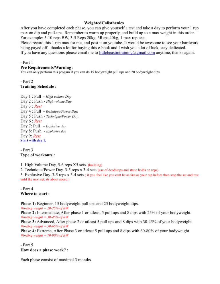 WeightedCalisthenics After you have completed each phase, you can give yourself a test and take a day to perform your 1 rep max on dip and pull-ups. Remember to warm up properly, and build up to a max weight in this order. For example: 5-10 reps BW, 3-5 Reps 20kg, 3Reps,40kg, 1 max rep test. Please record this 1 rep max for me, and post it on youtube. It would be awesome to see your hardwork being payed off.. thanks a lot for buying this e-book and I wish you a lot of luck, stay dedicated. If you have any questions please email me to littlebeastmtraining@gmail.com anytime, thanks again. - Part 1 Pre Requirements/Warning : You can only perform this progam if you can do 15 bodyweight pull ups and 20 bodyweight dips. - Part 2 Training Schedule : Day 1 : Pull - High volume Day Day 2 : Push - High volume Day Day 3 : Rest Day 4 : Pull - Technique/Power Day. Day 5 : Push - Technique/Power Day. Day 6 : Rest Day 7: Pull - Explosive day Day 8: Push - Explosive day Day 9: Rest Start with day 1. - Part 3 Type of workouts : 1. High Volume Day, 5-6 reps X5 sets. (building) 2. Technique/Power Day. 3-5 reps x 3-4 sets (use of deadstops and static holds on reps) 3. Explosive Day. 3-5 reps x 3-4 sets ( if you feel like you cant be as fast as your rep before then stop the set and rest until the next set, its about speed ) - Part 4 Where to start : Phase 1: Beginner, 15 bodyweight pull ups and 25 bodyweight dips. Working weight = 20-25% of BW Phase 2: Intermediate, After phase 1 or atleast 5 pull ups and 8 dips with 25% of your bodyweight. Working weight = 30-45% of BW Phase 3: Advanced, After phase 2 or atleast 5 pull ups and 8 dips with 30-45% of your bodyweight. Working weight = 50-65% of BW Phase 4: Extreme, After Phase 3 or atleast 5 pull ups and 8 dips with 60-80% of your bodyweight. Working weight = 70-90% of BW - Part 5 How does a phase work? : Each phase consist of maximal 3 months. Each phase bust be performed for atleast 1 month before moving onto the next phase, even when its really easy. You can only perform the next phase if the phase you are doing is getting really easy. Each phase has different exercises,progressions,stimulations,and training methods. - Part 6 When to increase weight? : Increase weight by 2,5kg/5kg After repeating the schedule for 2 times. - Part 7 Static stretching routine:http://youtu.be/B_GB-r-0LQM Must be performed 1 day before rest day, after your workout. Hold every stretch for atleast 30 seconds, breathing deep in and out. Perform the stretches in order of the video, repeat for 3 rounds. Take no longer then 45 sec rest between sets. Drink a lot of water after your stretching session. - Part 8 Shoulder prehab and rehab routine: http://www.youtube.com/watch?v=zjeVRe9L6kE perform this whole routine atleast one time a week, or when you feel pain in the shoulder area. Perform every exercise for atleast 10 reps. Each exercise must be performed for 2 sets before moving onto the next exercise. - Part 9 Warm-up: Must be performed before each training day! I repeat, You must! Perform A,B,C all straight after eachother with very little rest time between sets. A. Wall Band routine http://www.youtube.com/watch?feature=player_detailpage&v=zjeVRe9L6kE#t=5s 10 reps each movement. B: Scapula Band Routine http://www.youtube.com/watch?v=B41KOGS_9C0 10 reps each movement. C: Wrist Routine http://www.youtube.com/watch?v=7gfLCVNWFrM Start with A. Repeat A,B,C for 2-3 times. - Part 10 Bonus: Sample diet Sample diet: All foods must be Organic and Wild as possible. Breakfast: Option 1: 4-6 Whole Eggs in grassfed butter or cooked for 3 minuts, 1-2 Bananas+ Handfull of blueberries or raspberries. Option 2: Wild Salmon from can or Grassfed Meat/Sausage, handfull of nuts, make sure to have different kind of nuts almost each day. Organic coffee or Tea can be added. Pre-workout/Snack: Option 1: 1-2 Bananas or 250 Gram Watermelon or Grapes. Option 2: Handfull off nuts or 1 Avocado. Post-workout/Lunch: Option 1: Yam baked in coconut oil or grassfed butter, with 250 gram broccoli/spinach/sprouts/green beans, 250 gram chicken. Option 2: 200-250 gram White rice, with Mixed vegtables and 250 gram of chicken or grassfed steak. After lunch: White rice/sweet potatoe with 250 grams of chicken Snack: Option 1: Handfull of blueberries or any type of berry, with a piece of organic 90%+ chocolate. Option 2: 3-5 Pieces of any type of dried fruit Dinner: Option 1: White Rice,Potatoe,Yams baked in grassfed butter, with 250 gram of broccoli/spinach/sprouts/green beans, 250 gram of wild fish/chicken/meat. Option 2: 300/500 grams of vegtables,250 gram of wild fish/chicken/meat. Late night Snack: Almonds and organic 90%+ chocolate. - Part 11 Training See page below. Warning : All exercises must be performed with full range of motion, always! Phase 1: Beginner. 1-3 months. (remember you are working with a weight of 20-25% of your bodyweight here) Day 1 : Pulling (high volume) A: Weighted Wide Pull-ups with a weight you can do 6 reps with. http://youtu.be/q5NHXHQhCMk Reps: 5-6 Sets: 5 Rest: 90-120 sec B: Weighted Close grip pull ups with a weight you can do 6 reps with. http://youtu.be/IHAACX-gL18 Reps: 5-6 Sets: 5 Rest: 90-120 sec C: Bodyweight ring Rows with feet elevated on hip height. http://www.youtube.com/watch?v=yKd6WwxRG_4&feature=youtu.be Reps: 8-10 Sets: 5 Rest: 90-120 sec D: Scapula retraction hang on bar http://youtu.be/puIeQlkE-5Q Time: 15-20 sec Sets: 3-5 Rest: 90-120 sec E: Bicep ring curls http://www.youtube.com/watch?v=EHhm1TjJhIk&feature=player_detailpage#t=77 Reps:10 Sets: 3-4 Rest: 60-90 sec Day 2 : Pushing (high volume) A: Weighted dips on dipbar with a weight you can do 6 reps with. http://www.youtube.com/watch?v=4ihlnbKazm0&feature=youtu.be Reps: 5-6 Sets: 5 Rest: 90-120 sec B: Handstand push ups with back facing the wall on handles http://www.youtube.com/watch?v=iz9j_S6FddA Reps: 5-6 Sets: 5 Rest: 90-120 sec C: Dips on rings with 1 sec hold on each rep. http://www.youtube.com/watch?v=IBHWkmSHT68 R