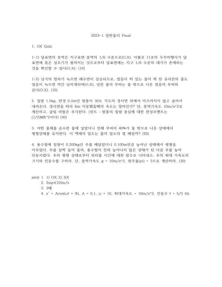 2023-1 일반물리 Final 1. OX Quiz 1-1) 달표면의 중력은 지구표면 중력의 1/6 수준으로(O,X), 아폴로 11호의 우주비행사가 달 표면에 꽂은 성조기가 펄럭이는 것으로부터 달표면에는 지구 1/6 수준의 대기가 존재하는 것을 확인할 수 있다(O,X). (10) 1-2) 남극의 빙하가 녹으면 해수면이 상승되므로, 얼음이 떠 있는 물이 꽉 찬 유리잔의 물도 얼음이 녹으면 약간 넘치게되며(O,X), 넘친 물의 부피는 물 밖으로 나온 얼음의 부피와 같다(O,X). (10) 2. 질량 1.5kg, 반경 0.2m인 원통이 30도 각도의 경사면 위에서 미끄러지지 않고 굴러서 내려온다. 경사면을 따라 6m 이동했을때의 속도는 얼마인가? 단, 중력가속도 10m/s^2로 계산하고, 굴림 마찰은 무시한다. (힌트 : 원통의 질량 중심에 대한 관성모멘트는 (1/2)MR^2이다) (30) 3. 어떤 물체를 순수한 물에 넣었더니 전체 부피의 40%가 물 밖으로 나온 상태에서 평형상태를 유지한다. 이 액체의 밀도는 물의 밀도의 몇 배일까? (20) 4. 용수철에 질량이 0,200kg인 추를 메달았더니 0.100m만큼 늘어난 상태에서 평형을 이루었다. 추를 살짝 들어 올려, 용수철이 전혀 늘어나지 않은 상태가 된 다음 추를 놓아 진동시켰다. 추의 평형 상태로부터 위치를 시간에 대한 함수로 나타내고, 추의 최대 가속도의 크기와 진동수를 구하라. 단, 중력가속도 g = 10m/s^2, 원주율(pi) = 3으로 계산하라. (30) ans) 1. 1) OX 2) XX 2. 2sqrt(10)m/s 3. 3배 4. y’ = Acos(ωt + Φ), A = 0.1, ω = 10, 최대가속도 = 10m/s^2, 진동수 f = 5/3 Hz