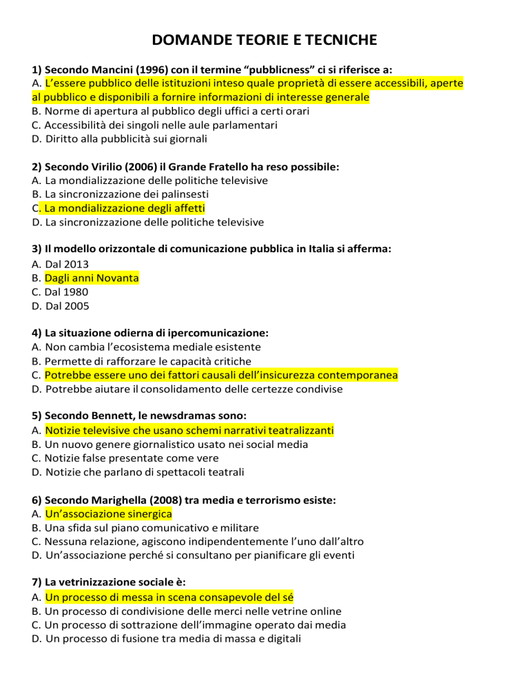 DOMANDE TEORIE E TECNICHE 1) Secondo Mancini (1996) con il termine “pubblicness” ci si riferisce a: A. L’essere pubblico delle istituzioni inteso quale proprietà di essere accessibili, aperte al pubblico e disponibili a fornire informazioni di interesse generale B. Norme di apertura al pubblico degli uffici a certi orari C. Accessibilità dei singoli nelle aule parlamentari D. Diritto alla pubblicità sui giornali 2) Secondo Virilio (2006) il Grande Fratello ha reso possibile: A. La mondializzazione delle politiche televisive B. La sincronizzazione dei palinsesti C. La mondializzazione degli affetti D. La sincronizzazione delle politiche televisive 3) Il modello orizzontale di comunicazione pubblica in Italia si afferma: A. Dal 2013 B. Dagli anni Novanta C. Dal 1980 D. Dal 2005 4) La situazione odierna di ipercomunicazione: A. Non cambia l’ecosistema mediale esistente B. Permette di rafforzare le capacità critiche C. Potrebbe essere uno dei fattori causali dell’insicurezza contemporanea D. Potrebbe aiutare il consolidamento delle certezze condivise 5) Secondo Bennett, le newsdramas sono: A. Notizie televisive che usano schemi narrativi teatralizzanti B. Un nuovo genere giornalistico usato nei social media C. Notizie false presentate come vere D. Notizie che parlano di spettacoli teatrali 6) Secondo Marighella (2008) tra media e terrorismo esiste: A. Un’associazione sinergica B. Una sfida sul piano comunicativo e militare C. Nessuna relazione, agiscono indipendentemente l’uno dall’altro D. Un’associazione perché si consultano per pianificare gli eventi 7) La vetrinizzazione sociale è: A. Un processo di messa in scena consapevole del sé B. Un processo di condivisione delle merci nelle vetrine online C. Un processo di sottrazione dell’immagine operato dai media D. Un processo di fusione tra media di massa e digitali 8) Nell’era dei media l’esperienza dello spazio ha registrato i seguenti cambiamenti: A. Compressione, sganciamento dello spazio dal luogo, astrazione B. Compressione, sganciamento dello spazio dal tempo, sganciamento dello spazio dal luogo, astrazione C. Compressione, sganciamento dello spazio dal tempo, sganciamento dello spazio dal luogo, condivisione D. Condivisione, sganciamento dello spazio dal tempo, sganciamento dello spazio dal luogo, astrazione 9) Per la prima volta in Italia, l’URP come strumento di comunicazione per attuare il principio di trasparenza viene previsto da: A. Legge 150 del 2000 B. Le quattro leggi Bassanini 1997/1999 C. Il decreto legislativo 3 febbraio 1993 n°29 D. Riforma Brunetta del 2009 10) Secondo Schudson, nel modello advocacy di giornalismo: A. Il giornalismo esercita il ruolo di watchdog B. Il giornalista non può iscriversi ad un partito politico C. Il giornalista si oppone autonomamente alla politica D. Il giornalista partecipa alla politica come protagonista 11) Il giornalismo può essere definito come: A. Prodotto culturale realizzato attraverso una negoziazione che avviene in specifici contesti sociali B. Specchio della realtà C. Prodotto culturale realizzato in modo automatico da ogni redazione D. Narrazione del reale realizzata dal singolo giornalista sulla base delle sue ideologie 12) Nella legge 150/2000 il Portavoce: A. Ha un rapporto di fiducia con il vertice dell’ente/ministro B. Ha un rapporto di fiducia con il capo della comunicazione C. Deve lavorare con l’URP D. Viene assunto dalla PA per la comunicazione istituzionale 13) Nel modello mediatico proposto da Mazzoleni: A. La logica dei media è radicalmente opposta a quella della politica B. I media sono autonomi e fungono da palcoscenico della politica C. La politica è autonoma dai media e li usa come megafono D. I mass media non sono solo il palcoscenico ma hanno la capacità di far adottare la loro logica agli interlocutori 14) I tratti specifici della comunicazione sociale sono: A. Fini solidaristici, non è orientata al profitto ma al bene comune, mira alla sensibilizzazione B. Fini solidaristici, è orientata al profitto, mira alla sensibilizzazione, all’interattività C. Fini solidaristici, è orientato al profitto ma al bene comune, mira alla sensibilizzazione, all’interattività, alla formazione D. Fini solidaristici, non è orientata al profitto ma al bene comune, mira alla sensibilizzazione, all’interattività, alla formazione ?????????????????? 15) Nell’attacco terroristico delle torri gemelle, secondo Baudrillard: A. Hanno innescato una guerra simmetrica B. I terroristi hanno usato l’arma assoluta della propria morte C. Hanno ignorato la dimensione simbolica D. Hanno voluto colpire solo bersagli militari 16) I casi di decodifica aberrante sono: A. Assenza di codice, carenza di codice, interferenze circostanziali, fiducia verso la fonte B. Assenza di codice, carenza di codice, legittimazione dell’emittente, interferenza di canale C. Assenza di codice, carenza di codice, interferenze circostanziali, delegittimazione dell’emittente D. Carenza di codice, interferenze circostanziali, fiducia verso la fonte 17) Nella legge 150/2000 l’URP deve: A. Predisporre informazioni relative agli atti amministrativi, allo stato dei procedimenti, ai tempi ed alle modalità di erogazione dei servizi, attivare analisi e ricerche per conoscere i bisogni degli utenti, realizzare iniziative di comunicazione B. Predisporre informazioni relative agli atti amministrativi, allo stato dei procedimenti, ai tempi ed alle modalità di erogazione dei servizi per informare i media C. Organizzare conferenze stampa e realizzare ricerche per conoscere le esigenze degli utenti D. Predisporre informazioni relative agli atti amministrativi, allo stato dei procedimenti, ai tempi ed alle modalità di erogazione dei servizi, attivare analisi e ricerche per conoscere i bisogni degli utenti 18) Secondo Thomas (1990) il termine infotainment: A. Allude alla tendenza dei media a presentare l’informazione come uno spettacolo, la cui principale funzione è quell