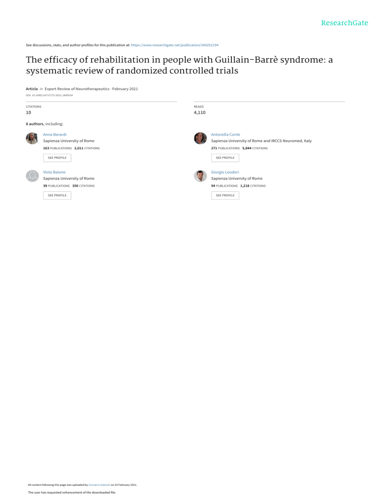See discussions, stats, and author profiles for this publication at: https://www.researchgate.net/publication/349252194 The efficacy of rehabilitation in people with Guillain-Barrè syndrome: a systematic review of randomized controlled trials Article in Expert Review of Neurotherapeutics · February 2021 DOI: 10.1080/14737175.2021.1890034 CITATIONS READS 10 4,110 8 authors, including: Anna Berardi Antonella Conte Sapienza University of Rome Sapienza University of Rome and IRCCS Neuromed, Italy 163 PUBLICATIONS 2,011 CITATIONS 271 PUBLICATIONS 5,844 CITATIONS SEE PROFILE SEE PROFILE Viola Baione Giorgio Leodori Sapienza University of Rome Sapienza University of Rome 39 PUBLICATIONS 350 CITATIONS 94 PUBLICATIONS 1,218 CITATIONS SEE PROFILE All content following this page was uploaded by Giovanni Galeoto on 25 February 2021. The user has requested enhancement of the downloaded file. SEE PROFILE Expert Review of Neurotherapeutics ISSN: (Print) (Online) Journal homepage: https://www.tandfonline.com/loi/iern20 The efficacy of rehabilitation in people with Guillain-Barrè syndrome: a systematic review of randomized controlled trials Sara Sulli, Luca Scala, Anna Berardi, Antonella Conte, Viola Baione, Daniele Belvisi, Giorgio Leodori & Giovanni Galeoto To cite this article: Sara Sulli, Luca Scala, Anna Berardi, Antonella Conte, Viola Baione, Daniele Belvisi, Giorgio Leodori & Giovanni Galeoto (2021): The efficacy of rehabilitation in people with Guillain-Barrè syndrome: a systematic review of randomized controlled trials, Expert Review of Neurotherapeutics, DOI: 10.1080/14737175.2021.1890034 To link to this article: https://doi.org/10.1080/14737175.2021.1890034 Published online: 23 Feb 2021. Submit your article to this journal Article views: 12 View related articles View Crossmark data Full Terms & Conditions of access and use can be found at https://www.tandfonline.com/action/journalInformation?journalCode=iern20 EXPERT REVIEW OF NEUROTHERAPEUTICS https://doi.org/10.1080/14737175.2021.1890034 SYSTEMATIC REVIEW The efficacy of rehabilitation in people with Guillain-Barrè syndrome: a systematic review of randomized controlled trials Sara Sullia, Luca Scalaa, Anna Berardi and Giovanni Galeoto b b , Antonella Conteb,c, Viola Baioneb, Daniele Belvisib,c, Giorgio Leodorib,c a c Sapienza University of Rome, Rome, Italy; bDepartment of Human Neurosciences, Sapienza University of Rome, Viale Dell’ Università, Rome, Italy; IRCSS Neuromed, Pozzilli, Italy ABSTRACT ARTICLE HISTORY Introduction: Individuals with Guillain-Barrè syndrome (GBS) showed significant longer-term psycho­ logical sequelae, due to persistent disability. In recent years, great advances have been made in medical care for patients with GBS. However, the focus has been mainly on patient care in the acute phase and improving survival instead of long-term disability. The purpose of this study was to evaluate the efficacy of rehabilitation in people with GBS through a systematic review of randomized controlled trials. Area Covered: PRISMA guidelines were used to perform this systematic review. Six bibliographic databases were searched: PUBMED, WEB OF SCIENCE, PEDro, CINHAL, PSYCHINFO, and SCOPUS. Papers included in the systematic review should have a search design of a randomized controlled trial. The quality of the clinical trials included was evaluated according to Jadad score. Expert Opinion: After eliminating duplicates, 472 records got screened, three RCTs were included in the systematic review. Overall, the analysis of the three randomized controlled trials showed that various types of rehabilitation interventions are correlated to an improvement in the patient’s wellbeing. Finally, it is not possible to extrapolate definite conclusions on the effectiveness of rehabilitation treatment in patients with GBS. Therefore, high-quality future studies are needed to confirm these hypotheses. Received 16 December 2020 Accepted 10 February 2021 1. Introduction Guillain-Barrè syndrome (GBS) is an acute immune-mediated polyradiculoneuropathy caused by inflammation of the per­ ipheral nerves and nerve roots [1]. An immune response direc­ ted toward peripheral myelin induces the process that is often preceded by a viral or bacterial infection, surgery, immuniza­ tion, lymphoma, or toxins exposure [2]. GBS is a complex and heterogeneous syndrome induced by various types of lesions. The most common one is the acute inflammatory demyelinat­ ing polyradiculoneuropathy (AIDP), manifesting with primarily demyelinating features; acute axonal motor neuropathy (AMAN) is less common and is characterized by primarily axonal injury and pure motor involvement; acute motor sen­ sory axonal polyneuropathy (AMSAN) shows a similar patho­ genesis to AMAN with additional sensory involvement [3]. One of the main target regions of the autoimmune attack is the node of Ranvier; the nodal area, resulting in Nodopathy, and the internodal area may also be affected [4]. A worldwide epidemiological systemic review denotes that the overall incidence of GBS is around 1.1 to 1.8/100,000/year in adults, and it increases with age after 50 years, from 1.7/100,000/ year to 3.3/100,00/year [5]. In addition to this, there is a significantly higher risk in men of developing the disease [3]. GBS has an acute phase, which reaches the nadir within four weeks; because of the patchy nature of the inflammatory CONTACT Giovanni Galeoto, Rome, Italy. giovanni.galeoto@uniroma1.it © 2021 Informa UK Limited, trading as Taylor & Francis Group KEYWORDS Guillain-Barrè syndrome; proprioceptive Neuromuscular Facilitation; quality of life; rehabilitation; systematic review attack, demyelination of peripheral axons produces an acute symmetrical ascending paralysis, usually with progressive weakness, loss of deep tendon reflexes, and loss of sensation. These peripheral axonal lesions may be spontaneously more or less reversible. In 50% of cases, the cranial nerves are involved, with di