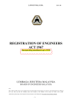 LAWS OF MALAYSIA ACT 138 REGISTRATION OF ENGINEERS ACT 1967 (Incorporating amendments up to 2015) LEMBAGA JURUTERA MALAYSIA BOARD OF ENGINEERS MALAYSIA Note: This is NOT A COPY of the Gazette printed by the Government Printer for the purposes of section 61 of the Interpretation Acts 1948 and 1967 [Act 388] and does not constitute prima facie evidence of the contents of the Gazette by virtue of the section. Authoritative printed copies of the Federal Government Gazette can be obtained from Percetakan Nasional Malaysia Berhad. -1- LAWS OF MALAYSIA … … … 2015 Date of Royal Assent … … 12 February 2015 Revised up to Date of publication in the … Gazette Appointment of Date of Coming into operation 24 February 2015 … 31 July 2015 Enacted in 1967 as Act No. 66 of 1967 -2- ACT 138 LAWS OF MALAYSIA ACT 138 Act 138 REGISTRATION OF ENGINEERS ACT 1967 (Revised – 2015) ____________________________ ARRANGEMENT OF SECTIONS PART I PRELIMINARY Section 1. Short title and commencement. 2. Interpretation. PART II BOARD OF ENGINEERS 3. Establishment of Board of Engineers. 4. Functions of the Board. PART III REGISTRATION OF ENGINEERS 5. Register. 6. Appointment and duties of Registrar. 7. Restrictions on unregistered persons, Graduate Engineers, etc. 7A. Engineering consultancy practice. 7 B. A body corporate providing a combination of services comprising professional engineering services, architectural consultancy services or quantity surveying services. 8. Only Professional Engineer with Practising Certificate and Engineering consultancy practice may submit plans, drawing, etc. 8A. Plan or drawing which a Professional Engineer may submit. 9. (Deleted by Act A1479.) 10. Qualifications for registration. 10A. (Deleted by Act A1479.) 10B. Registration of Accredited Checker. 10C. Registration of Engineering Technologist. 10D. Registration of Professional Engineer with Practising Certificate. 10E. Registration of Inspector of Works. 11. (Repealed by Act A132.) -3- LAWS OF MALAYSIA Section 12. Application for registration. 13. Certificate of registration. 14. Notification of change of address. PART IIIA DISCIPLINARY COMMITTEE 14A. Establishment of Disciplinary Committee. 14B. Powers of Disciplinary Committee. 14C. Proceedings of the Disciplinary Committee. PART IV CANCELLATION, REMOVAL, REINSTATEMENT, ETC. 15. Cancellation of registration, etc. 16. Removal from Register. 17. Reinstatement. 18. Certificates to be returned. PART V GENERAL 19. Appeal. 20. Appeal Board. 21. Tenure of office of members of the Appeal Board. 22. Procedure of appeal. 23. Procedure of Appeal Board. 24. Penalties for obtaining registration by false pretences, etc. 24A. Restriction on employment of unregistered person to provide professional engineering services. 24B. Investigating Committee and its powers. 25. General Penalty. 26. Regulations. 26A. Authorization by President. 27. Saving as to right of Government. 28. Indemnity. 29. Appointment of advocate and solicitor. -4- ACT 138 LAWS OF MALAYSIA SCHEDULE SECOND SCHEDULE (Deleted by Act A1479.) LIST OF AMENDMENTS LIST OF SECTIONS AMENDED -5- ACT 138 LAWS OF MALAYSIA ACT 138 Act 138 the engineering profession is protected by law. The main purpose is to safeguard the Rakyat's interests REGISTRATION OF ENGINEERS ACT 1967 (Revised - 2015) An Act to provide for the registration of engineers, and sole proprietorships, partnerships and bodies corporate providing professional engineering services and for purposes connected therewith. [23 August 1972, P.U. (A) 253/1972] PART I PRELIMINARY 1. the document self declares how to cite itself (1) This Act may be cited as the Registration of Engineers Act 1967. Short title and commencement. (2) (Omitted) (3) The Minister may by notification in the Gazette suspend the operation of this Act in any part of Malaysia. 2. every law has a preliminary section that provides definitions for the terms. Sometimes these In this Act unless the context otherwise requires terms may not have the same meaning as per the Oxford Dictionary. "Accredited Checker" means a person registered under section 10B; Interpretation. [Act A132] "appointed date" means the date appointed for the commencement of this Act; “Architect” has the same meaning assigned to it in the Architects Act 1967 [Act 117]; [Act A1479] "architectural consultancy practice” has the meaning assigned to it in the Architects Act 1967 [Act 117]; [Act A1158] "Board" means the Board of Engineers established by subsection 3(1); "body corporate providing professional engineering services” means a body corporate, incorporated under the Companies Act 1965 [Act 125], which provides professional engineering services; [Act A1158] "Engineering consultancy practice" means a sole proprietorship, partnership or body corporate, providing professional engineering services, registered under section 7 A or 7B; [Act A1158] “Engineering Technologist” means a person registered under section 10C; [Act A1479] “Engineering works” means all works which include any publicly or privately owned public utilities, buildings, machines, equipment, processes, works or projects that require the application of engineering principles and data; [Act A1479] “Graduate Engineer" means a person registered under subsection 10(1); [Act A1158] “Inspector of Works” means a person registered under section 10E; [Act A1479] “Minister” means the Minister for the time being charged with the responsibility for matters relating to works; [Act A1288] -6- LAWS OF MALAYSIA ACT 138 “Practising Certificate” means a certificate issued by the Board to a Professional Engineer under section 10D; [Act A1479] "prescribed" means prescribed by regulations made under section 26; "Professional Engineer" means a person registered under subsection 10(2); [Act A1158] “Professional Engineer with Practising Certificate” means a person registered under section 10D; [Act A1479] “Professional Quantity Surveyor” has the same meaning a
