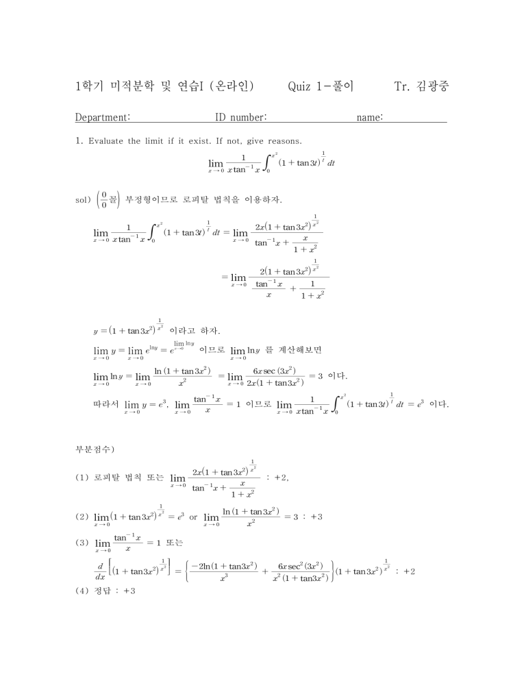 1학기 미적분학 및 연습I (온라인) Department: Quiz 1-풀이 ID number: Tr. 김광중 name: 1. Evaluate the limit if it exist. If not, give reasons. tan lim → tan sol) ! "## 꼴$ 부정형이므로 로피탈 법칙을 이용하자. lim → tan tan tan lim tan → tan lim → tan tan 이라고 하자. lim ln* lim * + lim ,ln* + , (→# ( →# (→# 이므로 lim ln 를 계산해보면 → ln tan sec → tan lim 이다. lim ln lim → → tan tan 이다. 따라서 lim * + ,. , lim 이므로 lim → (→# → tan 부분점수) tan (1) 로피탈 법칙 또는 lim : +2, → tan ln tan : +3 (2) lim tan or lim → → tan (3) lim 또는 → ln tan sec tan tan : +2 tan (4) 정답 : +3 2. Use the mean value theorem to show that ≤ ln tan ≤ tan for ≥ . pf) 인 경우 성립함을 보이자. ≤ ln tan ≤ at tan ≤ ln ≤ 으로 성립 tan ⇔ 인 경우 성립함을 보이자. ln tan 이라고 하면, 그럼 ′ tan 이고 tan ( ) 이다. ′′ tan ′ 이 감소함수이므로 ′ ′ 이다. 또한 함수 ln 과 tan 는 ≥ 에서 연속이므로 도 연속이고, ′ 이므로 는 미분가능하다. tan 평균값정리에 의해서 ′ ( ) 이다. 따라서 ′ ′ ′ 이므로 ln tan ⇔ ≤ ln tan ≤ 임. tan tan 부분점수) (1) 경우 확인 : +2 (2) ′ ( ) : +4 (평균값정리 정의만 표시 : +2) (3) ln tan ≤ 논리성립 : +2 (4) ≤ ln tan tan 논리성립 : +2 3. Find the range of for which the following improper integral converges. ∞ sol) ㄱ) ≤ 인 경우, ∞ ∞ ∞ 이고, 는 로 -판정법에 의해서 발산한다. ≤ ∞ 는 ≤ 범위에서 발산한다. 비교판정법에 따라서 ㄴ) 인 경우, 이므로 이고 이다. 따라서 ∞ ∞ ∞ ≤ ≤ 이다. 비교판정법을 사용하면 ∞ ∞ 는 -판정법에 의해서 일 때, 수렴한다. ∞ 는 범위에서 수렴한다. 따라서 ∞ 또한 ∞ 는 -판정법에 의해서 ≤ 일 때, 발산한다. ∞ 따라서 는 ≤ ≤ 범위에서 발산한다. ∞ 결국, ㄱ), ㄴ)에 의해서 는 범위에서 수렴하고, 나머지 범위에서 발산한다. 부분점수) : +2 (1) ∞ (2) 의 수렴구간 : +2 (3) : +2 ∞ (4) 의 발산구간 : +2 (5) 정답 : +2 4. Let and be the volume of revolutions of the region which are bounded by sinh , and ln about -axis and -axis, respectively. Find and . ln sol) sinh ln ln ln ln sinh ln ln 부분점수) ln (1) sinh : +2 (2) ln : +2 ln (3) sinh : +2 (4) 부분적분법 : +2 (5) ln : +2 ln ln ln ln 5. (a) Graph the curve cos . (b) Find the area of the region inside cos and outside . sol) (a) (b) 단위 원의 밖이면서 극좌표의 그림의 안쪽 영역에 대한 넓이를 구하자. 먼저 극좌표의 그림과 단위 원이 만나는 점을 구하면, cos 이므로 이다. ≤ ≤ 의 그림이 8개 반복되므로 cos sin sin 부분점수) (1) 극좌표 그림 : +4 (길이 또는 들어오는 각도가 없다면 –2) (2) 교점 : +2 (3) 극좌표 넓이 공식 : +2 (4) 정답 : +2