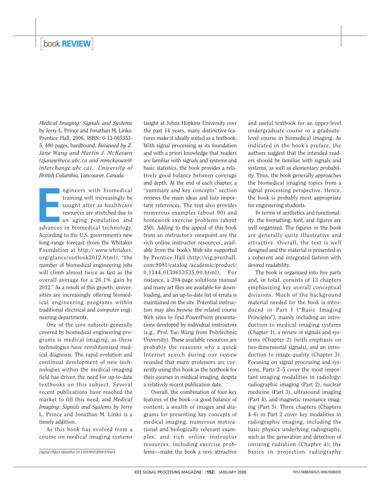 [book REVIEW] Medical Imaging: Signals and Systems by Jerry L. Prince and Jonathan M. Links, Prentice Hall, 2006, ISBN: 0-13-0653535, 480 pages, hardbound. Reviewed by Z. Jane Wang and Martin J. McKeown (zjanew@ece.ubc.ca and mmckeown@ interchange.ubc.ca), University of British Columbia, Vancouver, Canada. E ngineers with biomedical training will increasingly be sought after as healthcare resources are stretched due to an aging population and advances in biomedical technology. According to the U.S. government’s new long-range forecast (from the Whitaker Foundation at http:// www.whitaker. org/glance/outlook2012.html), “the number of biomedical engineering jobs will climb almost twice as fast as the overall average for a 26.1% gain by 2012.” As a result of this growth, universities are increasingly offering biomedical engineering programs within traditional electrical and computer engineering departments. One of the core subjects generally covered by biomedical engineering programs is medical imaging, as these technologies have revolutionized medical diagnosis. The rapid evolution and continual development of new technologies within the medical imaging field has driven the need for up-to-date textbooks on this subject. Several recent publications have reached the market to fill this need, and Medical Imaging: Signals and Systems by Jerry L. Prince and Jonathan M. Links is a timely addition. As this book has evolved from a course on medical imaging systems Digital Object Identifier 10.1109/MSP.2008.910431 taught at Johns Hopkins University over the past 14 years, many distinctive features make it ideally suited as a textbook. With signal processing as its foundation and with a priori knowledge that readers are familiar with signals and systems and basic statistics, the book provides a relatively good balance between coverage and depth. At the end of each chapter, a “summary and key concepts” section reviews the main ideas and lists important references. The text also provides numerous examples (about 90) and homework exercise problems (about 250). Adding to the appeal of this book from an instructor’s viewpoint are the rich online instructor resources, available from the book’s Web site supported by Prentice Hall (http://vig.prenhall. com:8081/catalog /academic/product/ 0,1144,0130653535,00.html). For instance, a 204-page solutions manual and many art files are available for downloading, and an up-to-date list of errata is maintained on the site. Potential instructors may also browse the related course Web sites to find PowerPoint presentations developed by individual instructors (e.g., Prof. Yao Wang from Polytechnic University). These available resources are probably the reasosns why a quick Internet search during our review revealed that many professors are currently using this book as the textbook for their courses in medical imaging, despite a relatively recent publication date. Overall, the combination of four key features of the book—a good balance of content, a wealth of images and diagrams for presenting key concepts of medical imaging, numerous motivational and biologically relevant examples, and rich online instructor resources, including exercise problems—make the book a very attractive IEEE SIGNAL PROCESSING MAGAZINE [152] JANUARY 2008 and useful textbook for an upper-level undergraduate course or a graduatelevel course in biomedical imaging. As indicated in the book’s preface, the authors suggest that the intended readers should be familiar with signals and systems, as well as elementary probability. Thus, the book generally approaches the biomedical imaging topics from a signal processing perspective. Hence, the book is probably most appropriate for engineering students. In terms of aesthetics and functionality, the formatting, font, and figures are well organized. The figures in the book are generally quite illustrative and attractive. Overall, the text is well designed and the material is presented in a coherent and integrated fashion with desired readability. The book is organized into five parts and, in total, consists of 13 chapters emphasizing key overall conceptual divisions. Much of the background material needed for the book is introduced in Part I (“Basic Imaging Principles”), mainly including an introduction to medical imaging systems (Chapter 1), a review of signals and systems (Chapter 2) (with emphasis on two-dimensional signals), and an introduction to image quality (Chapter 3). Focusing on signal processing and systems, Parts 2–5 cover the most important imaging modalities in radiology: radiographic imaging (Part 2), nuclear medicine (Part 3), ultrasound imaging (Part 4), and magnetic resonance imaging (Part 5). Three chapters (Chapters 4–6) in Part 2 cover key modalities in radiographic imaging, including the basic physics underlying radiography, such as the generation and detection of ionizing radiation (Chapter 4); the basics in projection radiography 1053-5888/08/$25.00©2008IEEE systems, such as a fundamental idea of projection imaging (Chapter 5); the basics in X-ray computed tomography, such as the concept of true tomograms (images of cross sections of the body), and CT image reconstruction and CT image quality (Chapter 6). Three chapters in Part 3 (Chapters 7–9) present the physics and modalities of nuclear medicine imaging, with a focus on the concept of radioactivity and the major modalities, such as planar scintigraphy and emission-computed tomography. Two chapters (Chapters 10 and 11) in Part 4 form the core material on ultrasound imaging, including a brief presentation of the physics of sound in Chapter 10 and the principles of ultrasound imaging systems in Chapter 11. The last two chapters (Chapters 12 and 13) in Part 5 discuss various techniques for magnetic resonance imaging, the fastest growing modality of medical images, in large part due to the associated high image quality and risk-free imaging factors. A chal