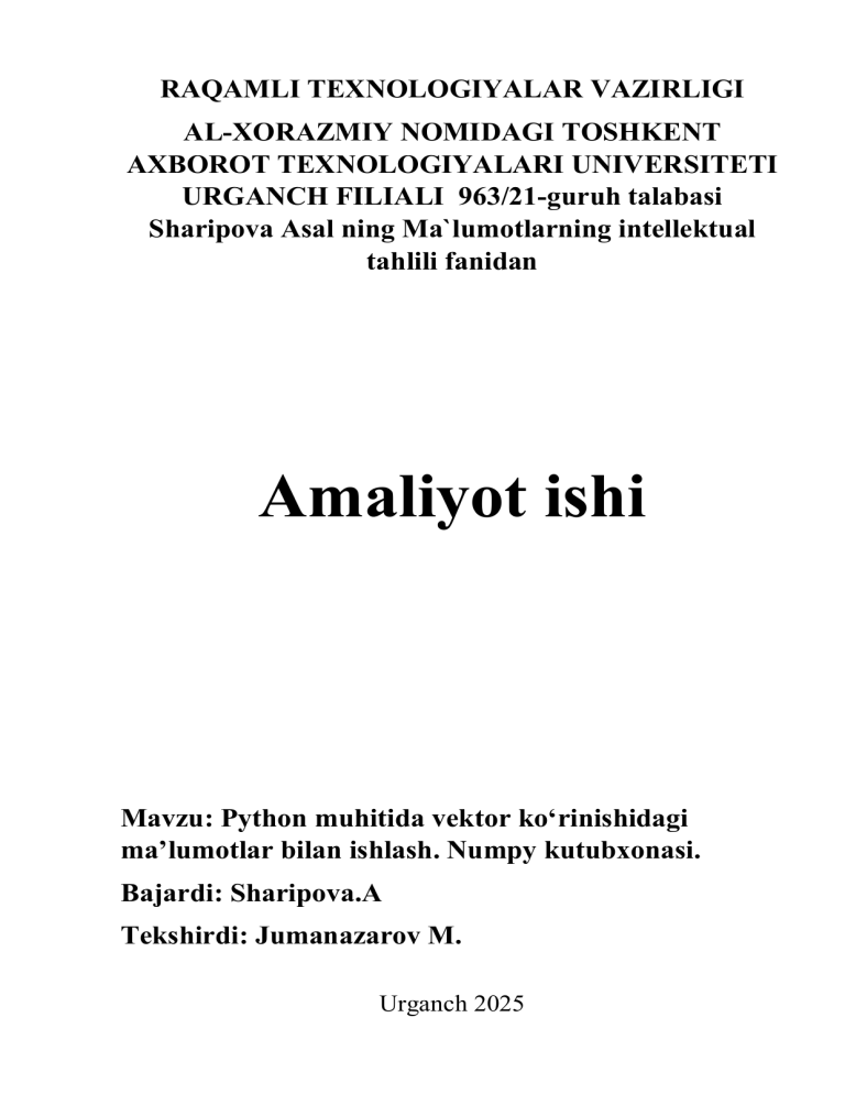 RAQAMLI TEXNOLOGIYALAR VAZIRLIGI AL-XORAZMIY NOMIDAGI TOSHKENT AXBOROT TEXNOLOGIYALARI UNIVERSITETI URGANCH FILIALI 963/21-guruh talabasi Sharipova Asal ning Ma`lumotlarning intellektual tahlili fanidan Amaliyot ishi Mavzu: Python muhitida vektor ko‘rinishidagi ma’lumotlar bilan ishlash. Numpy kutubxonasi. Bajardi: Sharipova.A Tekshirdi: Jumanazarov M. Urganch 2025 1- amaliyot ishi Mavzu: Python muhitida vektor ko‘rinishidagi ma’lumotlar bilan ishlash. Numpy kutubxonasi. 1. 0 dan 100 gacha bo'lgan tasodifiy sonlardan tashkil topgan elementlarning 10+(guruh ro'yxatidagi raqam) vektorini yaratish import numpy as np group_number = 31 # Guruh ro'yxatidagi raqam vector_size = 10 + group_number vector = np.random.randint(0, 101, vector_size) print("vektor:", vector) 2. Ushbu vektorning barcha juft elementlarini -1 bilan almashtirish. vector[vector % 2 == 0] = -1 print("Juft elementlar -1 bilan almashtirilgan vektor:", vector) 3. 50 dan katta bo'lgan barcha elementlarning indekslarini topish indices_50 = np.where(vector > 50)[0] print("50 dan katta elementlarning indekslari:", indices_50) 4. Indekslari 3 ga ko`p bo`lgan, ya`ni oldingi elementing pozitsiyasi keyingi elementining pozitsiyasidan 3 ga kichik bo`lgan, pozitsiyalarda joylashgan vektor elementlaridan yangi massiv yarating. Ushbu yangi massiv elementlarining o'rtacha qiymatini toping va uni ekranga chiqarish. yangi_vector = vector[::3] ortacha_qiymat = np.mean(yangi_vector) # O'rtacha qiymatni hisoblash print("Yangi massiv:", yangi_vector) print("Yangi massivning o'rtacha qiymati:", ortacha_qiymat)