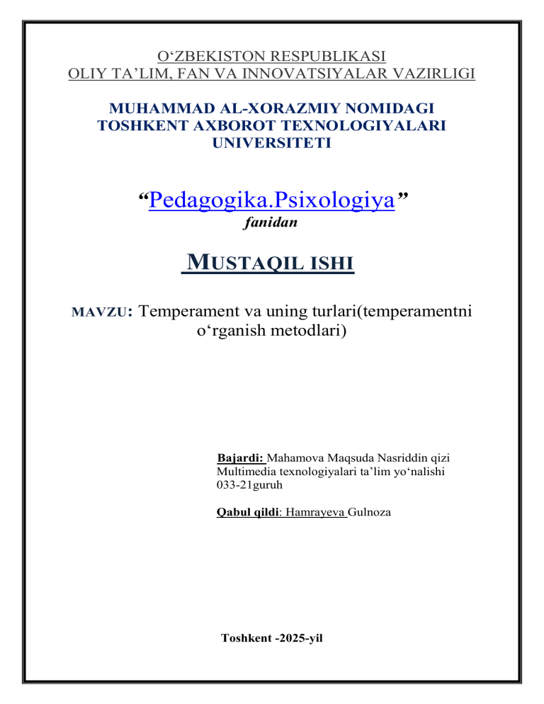 O‘ZBEKISTON RESPUBLIKASI OLIY TA’LIM, FAN VA INNOVATSIYALAR VAZIRLIGI MUHAMMAD AL-XORAZMIY NOMIDAGI TOSHKENT AXBOROT TEXNOLOGIYALARI UNIVERSITETI “Pedagogika.Psixologiya” fanidan MUSTAQIL ISHI MAVZU: Temperament va uning turlari(temperamentni o‘rganish metodlari) Bajardi: Mahamova Maqsuda Nasriddin qizi Multimedia texnologiyalari ta’lim yo‘nalishi 033-21guruh Qabul qildi: Hamrayeva Gulnoza Toshkent -2025-yil Reja: I. Kirish II. Asosiy qism 1. Temperament tushunchasi 2.Temperament turlari 3. Temperamentni o‘rganish metodlari III. Xulosa IV. Foydalanilgan adabiyotlar. Kirish Temperament – insonning individual xatti-harakatlarini ifodalab turuvchi tug‘ma va turg‘un psixofiziologik xususiyatlar yig‘indisi majmuasi bo‘lib, uning xattiharakati, emotsional holati va dunyoni idrok etish uslubini belgilaydi. Har bir inson o‘ziga xos temperamentga ega bo‘lib, bu uning shaxsiyati va hayot tarzi shakllanishida muhim ahamiyat kasb etadi. Temperament tug‘ma va o‘zgarmasdir. Inson qaysi temperament egasi bo‘lsa, umrbod o‘sha temperamentda qoladi. Temperament tafakkur darajasi yoki insoniylik fazilatlariga qarab ham bo‘linmaydi. Shu bois ham barcha temperament vakillari ichida iqtidorli va iqtidorsiz, ilmli va ilmsiz, vijdonli va vijdonsiz kishilarni uchratish mumkin. Ushbu mustaqil ishda temperament tushunchasi, uning turlari va har birining xususiyatlari haqida batafsilroq yoritib boriladi. Temperament tushunchasi Temperament (lat. temperamentum - “mutanosiblik”, “qismlarning toʻgʻri nisbati”) – inson psixik jarayonlarining barqaror dinamik xususiyatlari yigʻindisi: surʼat, ritm, intensivlik. Temperament faoliyatning mazmunli emas, balki dinamik jihatlari bilan bog'liq. Temperament psixik jarayonlarning tezligini, hissiy sohaning barqarorligini, irodaviy harakat darajasini belgilaydi. Temperamentning fiziologik asosi yuqori asabiy faoliyat turidir. Temperament xarakterning shakllanishi va rivojlanishining asosidir; odamlar va hayvonlarning biologik jihatdan aniqlangan individual farqlarini bildiradi. Temperament – bu insonning tabiiy psixik xususiyatlari majmuasi bo‘lib, u tug‘ma asosda shakllanadi va insonning hayoti davomida deyarli o‘zgarmaydi. Temperament shaxsning ichki energetik salohiyatini, reaktsiya tezligini, emotsional holatini va faoliyat olib borish uslubini belgilaydi. Temperamentlarning tavsiflari turli olimlar orasida juda ko‘p farq qiladi va ehtimol juda ko‘p sonli omillarni o‘z ichiga oladi. XVIII asr oxirida Kant, 20-asr boshlarida Xeymans va 1960-yillarda G.Yu.Eyzenk taklif qilgan koʻplab psixologlar temperamentning tarkibiy qismlarini 2 guruhga boʻladilar: xulq-atvorning “faoliyati”va “Emosionallik”. Ularning temperamentlar haqidagi nazariyalariga ilmiy va eksperimental asos keltirishga urinishlar qilingan (G. Yu. bu tadqiqotchilar tomonidan olingan natijalar bir-biri bilan qisman mos keladi.Psixologiya nuqtai nazaridan, to‘rtta temperament psixologik xususiyatlarni baholashning mumkin bo‘lgan tizimlaridan faqat bittasi (boshqalar mavjud, masalan Jung tipologiyasi va boshqalar). Zamonaviy ilm-fan temperamentlar ta‘limotida aqliy reaktsiyaning to‘rt turining qadimiy tasnifining aks-sadosini shaxsning fiziologik va biokimyoviy reaktsiyalarining intuitiv ravishda sezilgan turlari bilan birgalikda ko‘radi. Psixologiyada temperamentning to‘rt asosiy turi mavjud: 1. Sangvinik Sangvinik – quvnoq, chaqqon, tirishqoq va ta’sirchan odam. U tevarak-atrofga tez moslashadi, voqea-hodisalarga reaktsiyasi kuchli bo‘ladi. Odatda, sangvinik gapdon odam, har qanday inson bilan muloqotga oson kirishib ketadi va suhbat paytida quvnoq mimikani ko‘p ishga soladi. O‘ziga yoqqan ishga osongina berilib ketsa-da, muntazam davom etuvchi ishlarda qovun tushirib qo‘yadi. Sangvinikni kuldirish oson. Sangvinik kuchli tipga kiradi. Sangvinik temperament – bu to‘rt asosiy temperament turlaridan biri bo‘lib, insonning xulq-atvori va emotsional reaksiyalarini belgilovchi tug‘ma psixologik xususiyatlar majmuasidir. Sangviniklar odatda quvnoq, ijtimoiy va optimistik shaxslar sifatida tavsiflanadi. Asosiy xususiyatlari: 1. Faol, quvnoq, ijtimoiy va harakatchan inson; -ijtimoiylik va quvnoqlik: Sangviniklar odatda ochiqko‘ngil, suhbatga tayyor va atrofdagilar bilan muloqot qilishda faol bo‘ladi. 2.Emotsiyalarini oson ifodalaydi va tez o‘zgaruvchan bo‘ladi; -energiya va optimizm: Ular yuqori energiyaga ega bo‘lib, ijobiy kayfiyatni saqlaydi va yangi vaziyatlarga tez moslasha oladi. -tezkor emotsional o‘zgarishlar: Emotsional holatlari o‘zgaruvchan bo‘lib, hissiyotlarini ochiq ifoda etadilar. 3.Ishga tez kirishadi, ammo ba’zan diqqatini jamlashda qiyinchiliklarga duch kelishi mumkin; -ijodiylik: G‘oyalarni oson ishlab chiqadi, yangi loyihalar ustida ishlashga moyil. 4.Stressga bardoshli va tez moslashuvchan, oson motivatsiya oladi. -moslashuvchanlik: Yangi vaziyatlarga tez moslashadi, stressni yengil qabul qiladi. Kamchiliklari: Diqqatini bir joyga jamlashda qiyinchiliklarga duch kelishi mumkin. Ishlarni boshlashda faollik ko‘rsatadi, lekin ba’zan oxiriga yetkazmaydi. Haddan tashqari emotsional bo‘lishi tufayli kayfiyati tez o‘zgarishi mumkin. Sangviniklar ko‘pincha san’at, ijodkorlik va jamoaviy ishlar bilan bog‘liq kasblarda muvaffaqiyatga erishadilar. Ularning harakatchan va optimistik tabiati atrofdagilarga ham ijobiy ta’sir ko‘rsatadi. 2. Xolerik Xolerik – jizzaki, qiziqqon, chaqqon, beqaror, hissiy reaktsiyaga boy odam. U juda harakatchan. Juda katta ish qobiliyatiga ega xolerik biror ishni qiziqib tez boshlaydiyu, oxiriga etkazmay tez orada tashlab qo‘yadi. Xolerik hech qachon bir maromda ishlay olmaydi, goh g‘ayrat bilan, goh imillab ishlaydi. Ehtiyotkorlik, matonat va chidam talab qilinadigan vaziyatlarda xolerik qiyin ahvolga tushib qoladi. Xolerikning jahlini chiqarish juda oson. Xolerik ham kuchli tipga kiradi.Xolerik temperament – bu to‘rt asosiy temper