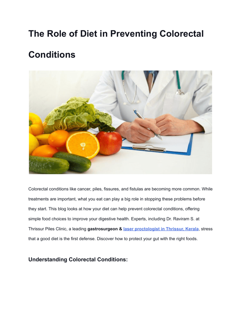 The Role of Diet in Preventing Colorectal Conditions Colorectal conditions like cancer, piles, fissures, and fistulas are becoming more common. While treatments are important, what you eat can play a big role in stopping these problems before they start. This blog looks at how your diet can help prevent colorectal conditions, offering simple food choices to improve your digestive health. Experts, including Dr. Raviram S. at Thrissur Piles Clinic, a leading gastrosurgeon & laser proctologist in Thrissur, Kerala, stress that a good diet is the first defense. Discover how to protect your gut with the right foods. Understanding Colorectal Conditions: Colorectal conditions encompass a range of disorders affecting the colon and rectum. These include: ● Colorectal Cancer: One of the most serious conditions, often linked to lifestyle and dietary factors. ● Piles (Hemorrhoids): Swollen veins in the lower rectum and anus, often exacerbated by poor diet. ● Fissures: Small tears in the lining of the anus, frequently caused by constipation or straining. ● Fistulas: Abnormal connections between the rectum and surrounding skin. Given their impact on health, understanding how diet influences these conditions is crucial. Why Diet Matters for Colorectal Health: Your digestive system is directly impacted by what you eat. Poor dietary habits—like low fiber intake, excessive spicy foods, or processed items—can lead to constipation, inflammation, and straining during bowel movements. Over time, this increases the risk of developing painful conditions such as piles, anal fissures, or fistulas. For residents in Thrissur seeking the best colorectal surgeon in Kerala, understanding the link between diet and colorectal health is key to avoiding surgery or advanced treatments. The Impact of Diet on Colorectal Health: Research indicates that diet plays a pivotal role in both the prevention and management of colorectal conditions. Here are key dietary components that can influence colorectal health: ● Fiber-Rich Foods: A high-fiber diet is essential for maintaining healthy digestion. Foods such as whole grains (brown rice, oats, whole wheat bread), fruits, vegetables, legumes (beans and lentils), nuts, and seeds are excellent sources of dietary fiber. Fiber promotes regular bowel movements and helps prevent constipation, which can lead to conditions like hemorrhoids and diverticulitis. ● Fruits and Vegetables: These foods are rich in vitamins, minerals, and antioxidants that combat inflammation and oxidative stress—both linked to cancer development. Aim to consume a variety of colorful fruits and vegetables daily to maximize nutrient intake. ● Healthy Fats: Incorporating healthy fats from sources like olive oil, avocados, nuts, and fatty fish (such as salmon and mackerel) can help reduce inflammation in the body. Omega-3 fatty acids found in fish have been shown to have protective effects against colorectal cancer. ● Limit Processed Foods and Red Meat: High consumption of processed meats (like bacon and sausages) and red meat has been associated with an increased risk of colorectal cancer. These foods may contain harmful compounds that contribute to cancer development. Instead, focus on lean proteins such as chicken or plant-based options. ● Hydration: Adequate hydration is vital for digestive health. Consuming plenty of water helps keep bowel regularity and prevents constipation. Practical Dietary Tips for Prevention: To effectively incorporate these dietary principles into daily life, consider the following tips: ● Start Your Day with Fiber: Choose whole grain cereals or oatmeal topped with fruits for breakfast. ● Snack Wisely: Opt for raw vegetables or fruits instead of processed snacks. ● Cook with Whole Grains: Substitute white rice with brown rice or quinoa in meals. ● Include Legumes: Add beans or lentils to salads, soups, or main dishes to boost fiber intake. ● Mind Your Portions: Be mindful of portion sizes for meats; focus on lean proteins like chicken or fish. ● Stay Active: Combine a healthy diet with regular physical activity to further reduce risks associated with colorectal conditions. Consulting a Specialist: If you experience symptoms related to colorectal health—such as persistent abdominal pain, changes in bowel habits, or rectal bleeding—it is essential to consult a specialist. Dr. Raviram S., a leading proctologist in Thrissur, Kerala, offers advanced laser treatments for various colorectal conditions at Thrissur Piles Clinic. With over 14 years of experience in treating complex cases using state-of-the-art technology, Dr. Raviram S emphasizes the importance of both dietary management and medical intervention. Conclusion: Diet plays a pivotal role in preventing colorectal conditions. By making informed food choices—emphasizing fiber-rich foods, fruits, vegetables, healthy fats while limiting processed foods—you can significantly enhance your digestive health. For those needing expert care, Thrissur Piles Clinic—with its blend of compassionate service and advanced laser treatments—is your go-to destination. Early action saves pain! Book a consultation with Dr. Raviram S., the top gastro surgeon & proctologist in Thrissur, Kerala. Prioritize your health today for a better tomorrow! Read now https://www.thrissurpilesclinic.com/the-role-of-diet-in-preventing-colorectal-conditions/ Best diet for colorectal health, Foods to prevent piles and fissures, How to avoid colorectal cancer naturally, High-fiber diet for digestion, Best foods for gut health, Healthy diet for hemorrhoids prevention, How to prevent anal fissures with diet, Natural remedies for colorectal conditions, Best proctologist in Thrissur, Thrissur Piles Clinic laser treatment, Dr. Raviram S colorectal specialist, Causes of colorectal conditions, Diet tips for better bowel health, How to prevent constipation naturally, Laser treatment for piles in Kerala.