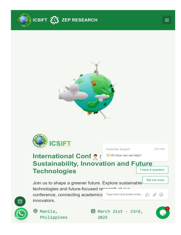 ICSIFT ZEP RESEARCH Customer Support just now International ConferenceHi! How oncan we help? Sustainability, Innovation and Future I have a question Technologies Tell me more Join us to shape a greener future. Explore sustainable technologies and future-focused research at our Type here and press enter.. conference, connecting academics, professionals, and innovators. 1 Register Now Submit your Paper Download Brochure Our Co-organizers About Conference Download Conference Materials Conference Brochure Copyright Form Abstract Template Manuscript Template Registration Form Conference Poster Objectives of the Conference ICSIFT 2025 IS DEDICATED TO ADVANCING THE NATIONS SUSTAINABLE DEVELOPMENT GOALS (SDGS) 01 02 PARTNERSHIPS FOR THE GOALS QUALITY EDUCATION DECENT Celebrate & Support Sustainability Awards Recognize excellence in sustainable innovation and practices. Nominate Now Sponsorship Partner with us to drive sustainable development forward. Become a Sponsor Venue Explore our eco-friendly conference venue and accommodation options. View Venue Join us in shaping a sustainable future 🌱 🏆 🤝 🌍 Join the Green Revolution Be part of the change at the International Conference on Sustainable Development. Together, we can build a greener future! Register Now 🌍 100% Carbon Neutral Event 🌱 Plant a Tree with Every Registration Conference Important Dates Join us in our journey towards a greener future. Stay updated with our eco-friendly conference schedule and important milestones. Get all Day Schedule Experience Manila Join us in the heart of the Philippines for an unforgettable conference experience World-Class Venue State-of-the-art facilities in the heart of Manila Cultural Hub Immerse yourself in Filipino hospitality and culture Networking Paradise Connect with industry leaders in a tropical setting Frequently Asked Questions What is the main focus of the Sustainable Development Conference? The conference focuses on addressing global challenges in sustainability, exploring innovative solutions, and fostering collaboration between researchers, policymakers, and industry leaders. How can I participate in the conference? You can participate by registering on our website, submitting a research paper, or applying to present a poster. We also welcome attendees who wish to learn and network. What are some key topics that will be discussed? Key topics include renewable energy, circular economy, climate change mitigation, sustainable urban planning, and the role of technology in achieving sustainability goals. Are there opportunities for networking and collaboration? Yes, the conference includes dedicated networking sessions, panel discussions, and interactive workshops to facilitate collaboration and knowledge sharing among participants. Didn't find the answer you were looking for? Contact us Get in touch with our team for personalized assistance and expert guidance. Name Phone / Whatsapp.no Email address Country Message Submit © 2024 ICSIFT. All rights reserved.