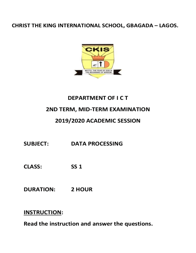 CHRIST THE KING INTERNATIONAL SCHOOL, GBAGADA – LAGOS. DEPARTMENT OF I C T 2ND TERM, MID-TERM EXAMINATION 2019/2020 ACADEMIC SESSION SUBJECT: DATA PROCESSING CLASS: SS 1 DURATION: 2 HOUR INSTRUCTION: Read the instruction and answer the questions. Subject: ENT (DATA PROCESSING) Class: SS1 1. There are how many categories of transmission medium that are used in computer communication? (a) 5 (b) 4 (c) 2 (d) 3 2. How many types of bounded media cables used for data transmission? (a) 5 (b) 4 (c) 2 (d) 3 3. There are how many types of information transmission? (a) 5 (b) 4 (c) 3 (d) 2 4. The Alternative term used for Information Processing is ____________? (a) Electronic Data Processing (b) Data Transmission (c) Information task (d) Information Transmission. 5. Processing of transmitting the information can also be called________ (a) Electronic Data (b) Data Transmission (c) Information Accessing (d) Processing task 6. There are many Levels of Information? (a) 6 (b) 5 (c) 4 (d) 3. 7. The processing of converting data into information is known as? (a) Data Collection (b) Data Storage (c) Data Processing (d) data line 8. The Method of information transmission that has to do with passing down of information through words of mouth is? (a) Oral Method (b) Modern Method (c) Symbolic Method (d) Clerical Method 9. Methods of information transmission that has do with making use of today technology tools in transmitting information is? (a) Oral Method (b) Modern Method (c) Symbolic Method (d) Clerical Method 10. The transmission of voice information over short and long distance with a cable connection is? (a) Telex (b) Fax Machine (c) Television (d) Telephone 11. _______ is the processing of sending and receiving with the transmission media (a) Digitalization (b) Information Transmission (c) Information Processing 12. One of the ways by primary data can be gathered is ______? (a) Questionnaire (b) Newspaper (c) Television (d) Radio 13. There are how many ways by which data can be source for? (a) 4 (b) 3 (c) 2 (d) 1 14. One of the stages of information processing for transmission that deals with copying, grouping or arranging data in a more convenient way for input is? (a) Collection of Data (b) Observation of Data (c) Preparation of Data (d) Input of Data. 15. How many levels of information do we have? (a) 6 (b) 5 (c) 4 (d) 3 16._____ is used to broadcast information to large group of people or society in form of voice and pictures? (a) Telex (b) Fax Machine (c) Television (d) Telephone 17. A processed data is referred to as _____? (a) Program (b) Information (c) Flowchart (d) Algorithm 18. How many stage of information processing for transmission do we have? (a) 6 (b) 5 (c) 4 (d) 3 19. ______ is the stage that deals with capturing data from their sources and recording it into some media (a) Collection of Data (b) Observation of Data (c) Preparation of Data (d) Input of Data. 20. The following are the modern methods of passing information EXCEPT? (a) Beating drums (b) Television (c) Telex (d) Telephone 21. ______ is refers to the manipulation of digitized information by computers and other digital electronic equipment (a) Digitalization (b) Information Transmission (c) Information Processing 22. Data (information) can be source for through the following EXCEPT (a) Interviewing (b) Observation (c) Document Analysis (d) Processing 23. Information processing may be _____ or _______? (a) Special or Parallel (b) Sequential or Parallel (c) Serial or Path (d) sequential or Pattern 24. All the following are the media of storing personal information EXCEPT? (a) Computer System (b) Diaries (c) E-mails (d) Television 25. The processing of transmitting information is different from other types of communication in the sense that data is being sent or received (a) True (b) False 26. Preparation of Data has do with ______ and __________ data (a) Checking and Validity (b) Checking and Verifying (c) Processing and Checking (d) Checking and Storing 27. _______ is the calculating or manipulating stage for processing of transmitting information (a) Processing of Data (b) Output of Information (Data) (c) Input of Data (d) Collection of Data 28. Which one of the following is word Processing application package? (a) Ms-Excel (d) Corel Draw (c) Paint (d) MS- Word 29. The following are the modern methods of passing information EXCEPT? (a) Beating drums (b) Television (c) Telex (d) Telephone 30. One of the ways by primary data can be gathered is ______? (a) Questionnaire (b) Newspaper (c) Television (d) Radio 15 Marks Section B: Answer any three question from the following questions (1) (a) Differentiate between Bounded media and Unbounded media (b) State the three bounded media device used for data transmission 2 Marks 3 Marks (2) (a) Define the following (i) Information Processing (ii) Data Transmission (b) State the two ways of gathering information (3) (a) List the five stages of information processing for transmission in the right order 3 Marks 2 Marks 5 Marks (4) (a)Mention the four procedures for information processing and explain them briefly (b) State any four modern method devices used for transmission of information 4 Marks 1 Mark CHRIST THE KING INTERNATIONAL SCHOOL, GBAGADA – LAGOS. DEPARTMENT OF I C T 2ND TERM, MID-TERM EXAMINATION 2019/2020 ACADEMIC SESSION SUBJECT: DATA PROCESSING CLASS: SS 2 DURATION: 2 HOUR INSTRUCTION: Read the instruction and answer the questions Subject: ENT (DATA PROCESSING) Class: SS2 Section A: Answer all the following question by selecting the right option from A to D (1) Which of the following is NOT an example of DBMS? (a) Foxbase (b) Fortran (c) Ms-Access (d) Oracle (2) The smallest element in a file is called? (a) Character (b) Database (c) Field (d) record (3) _____ is a unique data element that shows characteristic of an entity? (a) Entities (b) Relationship (c) Attribute (d) Table (4) ______ is an association among instance of entities? (a) Entities (b) Relationship (c) Attribu