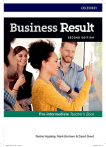 HighNote_GLB_L2_TBK_TTL.indd 1 21/08/2019 13:59 Business SECOND EDITION Pre-intermediate Teacher’s Book Rachel Appleby, Mark Bartram & David Grant 3 4738828 BR2e Pre Int TB.indb 1 28/11/2016 15:56 1 Great Clarendon Street, Oxford, ox2 6dp, United Kingdom Oxford University Press is a department of the University of Oxford. It furthers the University’s objective of excellence in research, scholarship, and education by publishing worldwide. Oxford is a registered trade mark of Oxford University Press in the UK and in certain other countries © Oxford University Press 2017 The moral rights of the author have been asserted First published in 2017 2021 2020 2019 2018 2017 10 9 8 7 6 5 4 3 2 1 No unauthorized photocopying All rights reserved. No part of this publication may be reproduced, stored in a retrieval system, or transmitted, in any form or by any means, without the prior permission in writing of Oxford University Press, or as expressly permitted by law, by licence or under terms agreed with the appropriate reprographics rights organization. Enquiries concerning reproduction outside the scope of the above should be sent to the ELT Rights Department, Oxford University Press, at the address above You must not circulate this work in any other form and you must impose this same condition on any acquirer Links to third party websites are provided by Oxford in good faith and for information only. Oxford disclaims any responsibility for the materials contained in any third party website referenced in this work isbn: 978 0 19 473882 8 isbn: 978 0 19 473881 1 Book Pack Printed in China This book is printed on paper from certified and well-managed sources acknowledgements Cover image: Getty Images/Maya Back cover photograph: Oxford University Press building/David Fisher 4738828 BR2e Pre Int TB.indb 2 28/11/2016 15:56 Contents Introduction 4–7 1 Companies 8–12 10 Environment 59–63 2 Contacts 13–17 11 Entertaining 64–68 3 Products & services 18–22 12 Performance 69–73 Viewpoint 1 A company profile 23–24 Viewpoint 4 Green business 74–75 4 Visitors 25–29 13 Future trends 76–80 5 Customer service 30–34 14 Time 81–85 6 Employment 35–39 15 Training 86–90 Viewpoint 2 The customer journey 40–41 7 Travel 42–46 8 Orders 47–51 9 Selling 52–56 Viewpoint 5 A successful partnership 91–92 Practice file answer key 93–96 Viewpoint 3 What colour is your logo? 57–58 4738828 BR2e Pre Int TB.indb 3 28/11/2016 15:56 Introduction The course Who is Business Result Second Edition for? Business Result Second Edition is a comprehensive multilevel course in business English suitable for a wide range of learners. The main emphasis is on enabling your students; helping them to communicate more effectively in their working lives. In-work students Unlike many business English courses, Business Result Second Edition addresses the language and communication needs of employees at all levels of an organization, who need to use English at work. It recognizes that the business world is truly international and that many people working in a modern, global environment spend much of their time doing everyday tasks in English – communicating with colleagues and work contacts by phone, via email and in a range of face-to-face situations, such as formal and informal meetings/discussions, and various planned and unplanned social encounters. It contains topics and activities that allow the students to participate in a way that is relevant to them, whatever their level in their company or organization. Pre-work learners Business Result Second Edition can also be used with prework learners at college level. The course covers a variety of engaging topics over the 15 units, so students without much work experience will receive a wide-ranging overview of the business world, as well as acquiring the key communication skills they will need in their future working lives. Each unit in this Teacher’s Book contains suggestions for adapting the material to the needs of these students. One-to-one teaching Many of the activities in the book are designed for use with groups of students, but they can also be easily adapted to suit a one-to-one teaching situation. Notes in the individual Teacher’s Book units offer suggestions and help with this. What approach does Business Result Second Edition take? Business Result Second Edition helps students communicate in English in real-life work situations. The priority at all times is on enabling them to do so more effectively and with confidence. The target language in each unit has been carefully selected to ensure that students will be equipped with genuinely useful, transferable language that they can take out of the classroom and use immediately in the workplace. The course recognizes that, with so many businesses now being staffed by people of different nationalities, there is an increasing trend towards using English as the language of internal communication in many organizations. As well as learning appropriate language for communicating externally – with clients or suppliers, for example – students are also given the opportunity to practise in situations that take 4 place within an organization, such as giving a report, making arrangements and taking part in meetings. The main emphasis of the course is on the students speaking and trying out the target language in meaningful and authentic ways; it is expected that a large proportion of the lesson time will be spent on activating students’ interest and encouraging them to talk. The material intentionally takes a communicative, heads-up approach, maximizing the amount of classroom time available to focus on and practise the target language. However, you will also find that there is plenty of support in terms of reference notes, written practice and review material. The syllabus is essentially communication-driven. The topics in each of the 15 units have been chosen because of their relevance to modern b